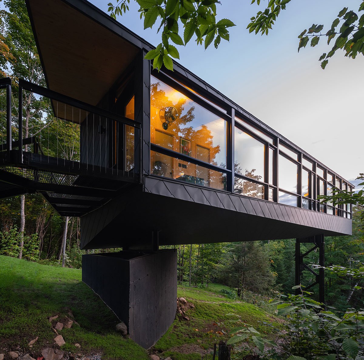 The technical solution to the environmental issue involved a single concrete footing and a steel “mast” placed within the required setback. Avoiding a large conventional foundation preserved the watershed and prevented erosion, as did elevate the construction zone. The use of carbon-intensive concrete was also reduced for a lower carbon footprint.