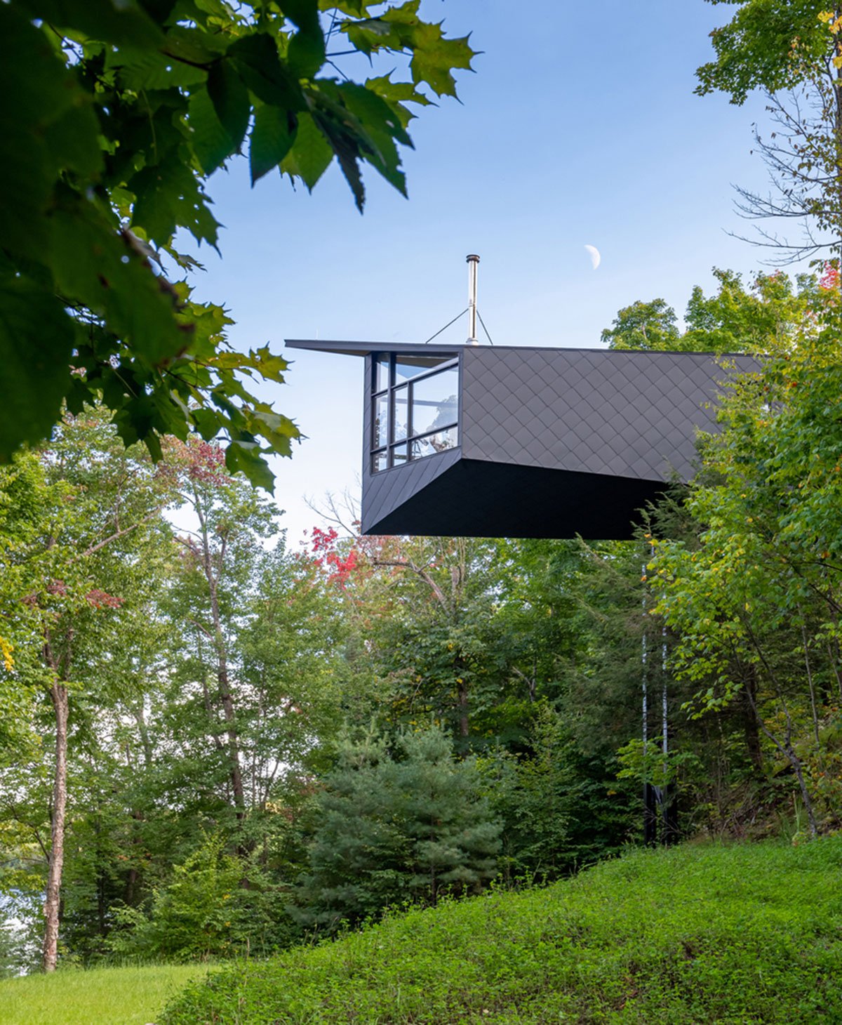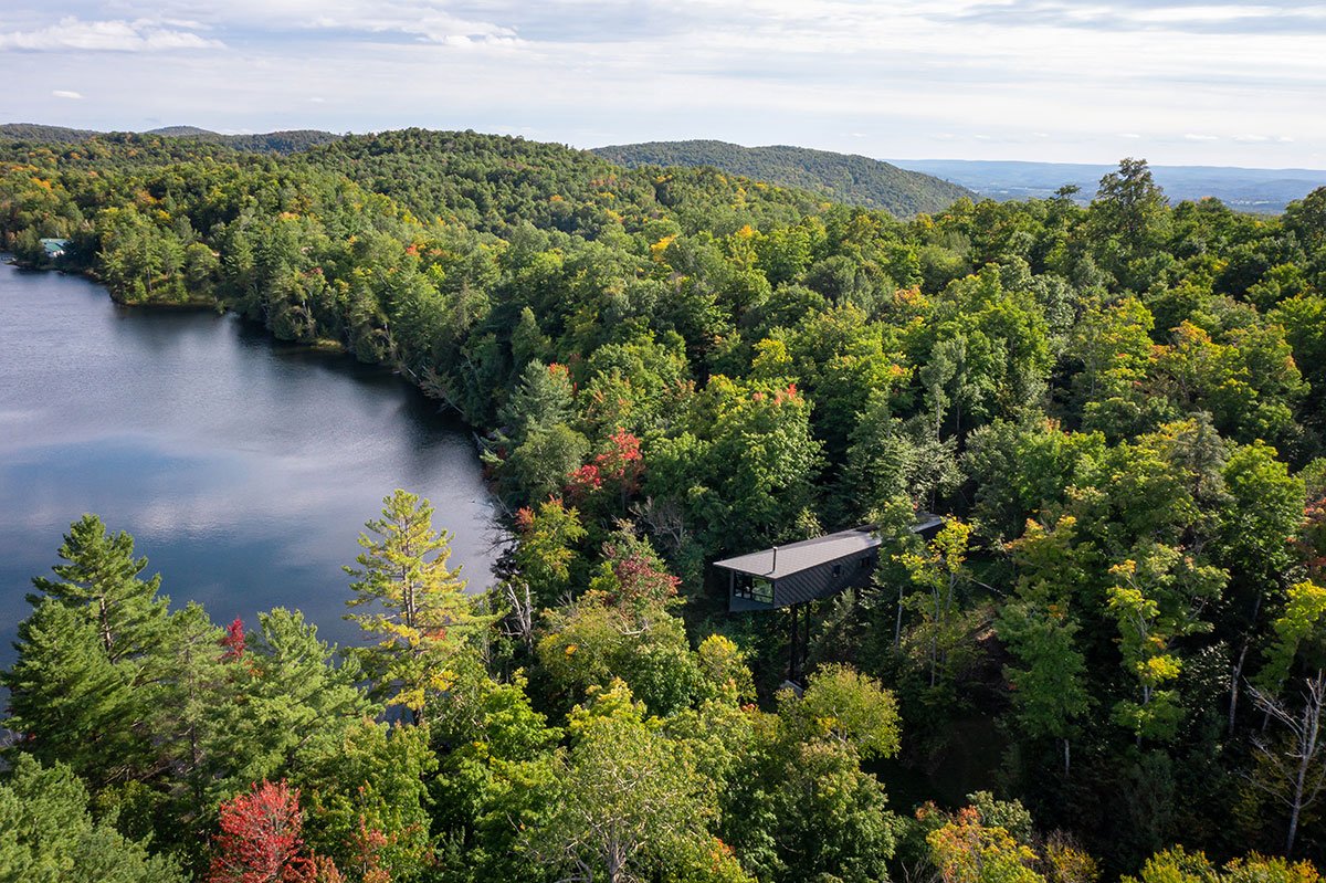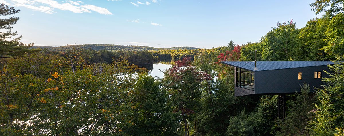 One goal for the home was to create extensive lodging for endangered brown bats. Bat pods were integrated into the mast to provide safety from climbing predators and a clear flight path to the lake.