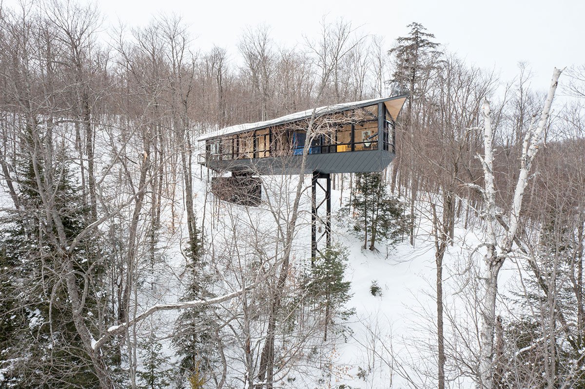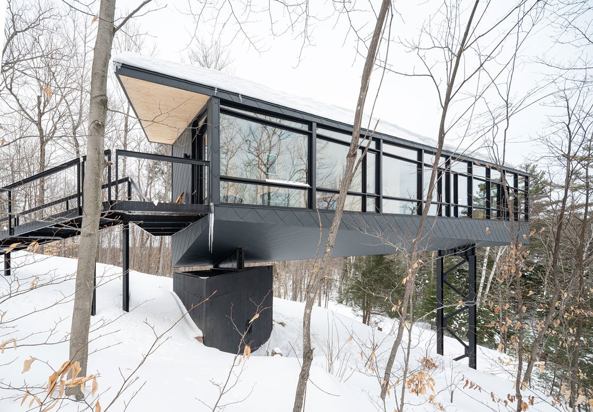 Excerpt: m.o.r.e CLT Cabin is a cottage designed by the architectural firm Kariouk Architects. The paradigmatic North American cottage is romanticized as a wilderness log cabin. Nonetheless, typical cottages are “woodsy” versions of suburban homes with every modern convenience. These buildings sustain the myth that appearing to be one with the land equates to a reduced environmental impact. The m.o.r.e. CLT Cabin inverts this idea by separating from the more sustainably constructed landscape than other cottages. This unraveling of eco-fictions is not cynical but optimistic.