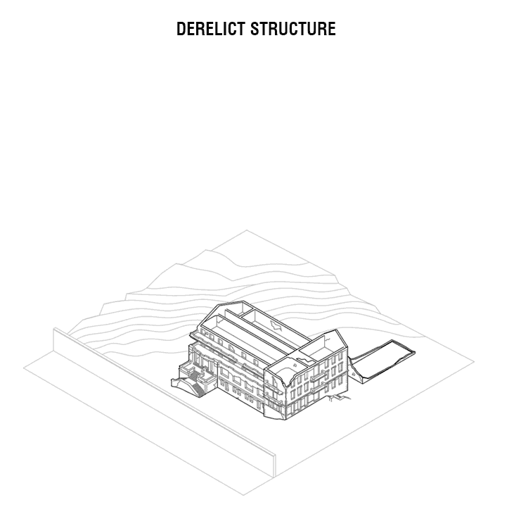 [Text as submitted by architect] Originally built in the late 1920s, the Manna Sanatorium received patients of tuberculosis who hoped to heal from the benefits of living within the arcadic woods for almost a decade. Designed by Swiss architects, it stirred away from the neoclassical current of the moment in the area. Despite the idyllic location, the introduction of penicillin in 1938 made sanatoriums obsolete, forcing the abandonment of Manna at the mercy of looting, with its parts being repurposed in nearby constructions.