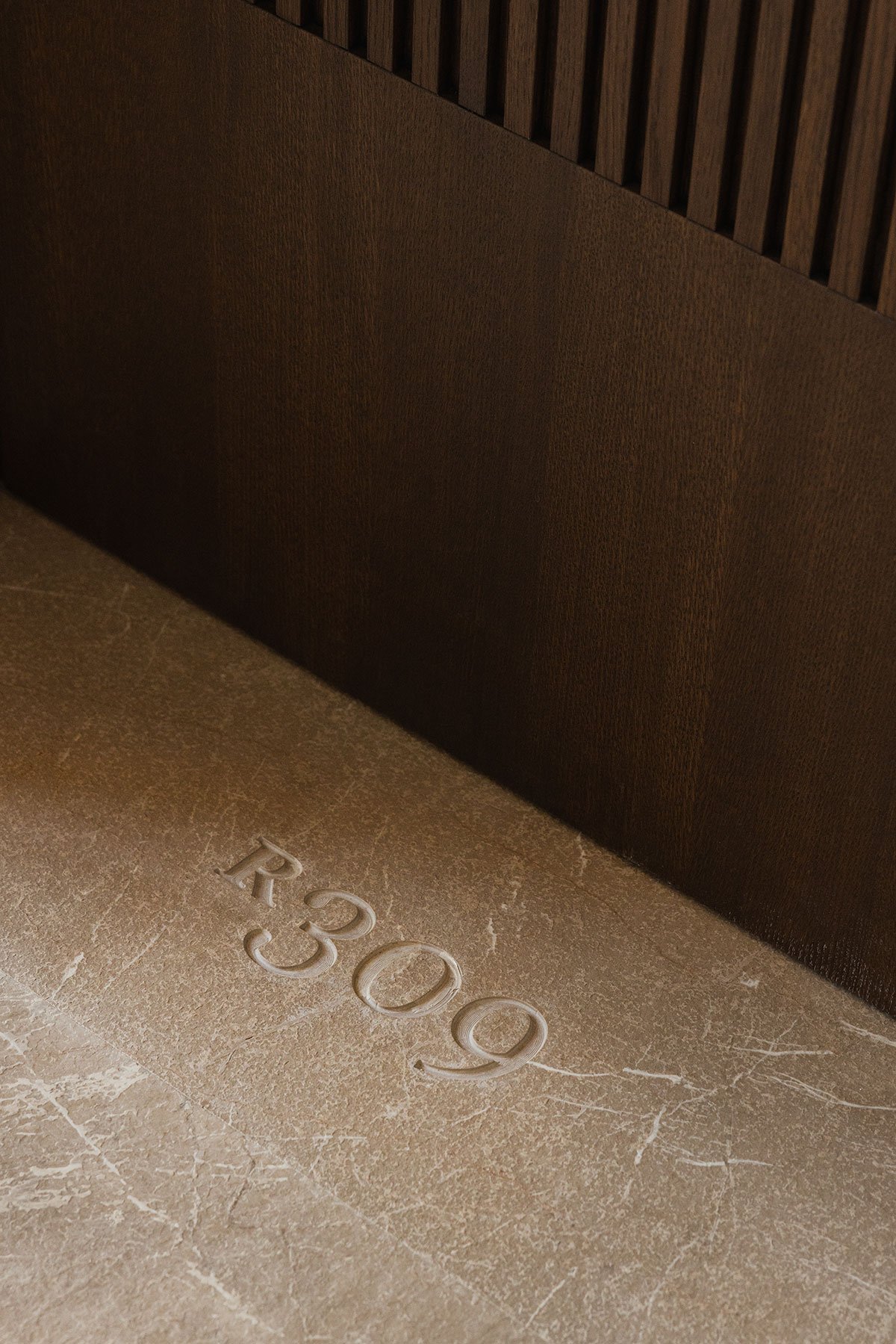 Inside each of the 32 rooms, a timber space grid of brushed treated timber is reflected on the floor patterns of terrazzo and marble to organise and define sub-areas of sleep, bathing, dressing etc. The grid feature is a heritage from signature original elements, like the iron doors with their exquisite detailing in their muntins, and reappears in floor patterns all over the building.