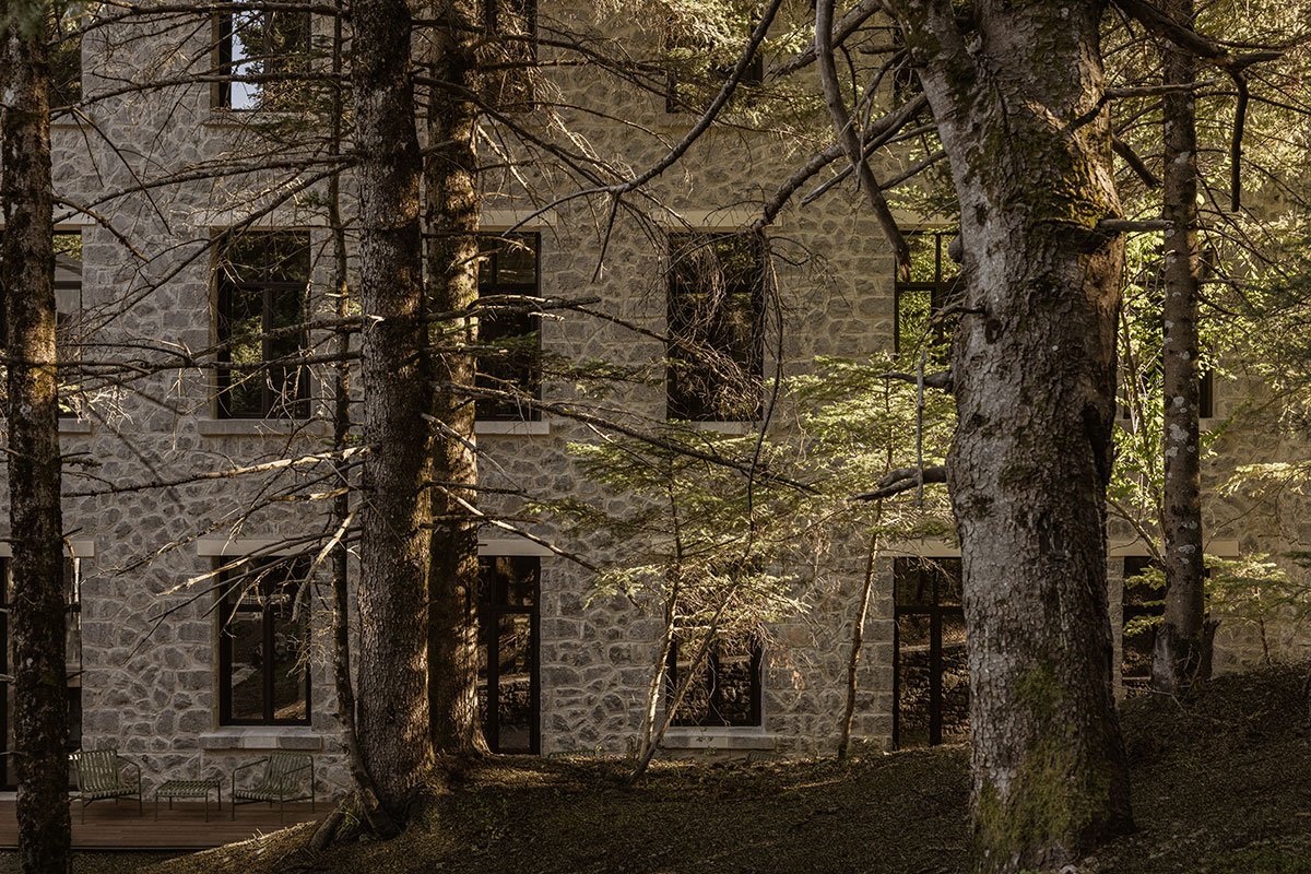 There was also economy in the material finishes that were largely sourced from nearby: stone elements and terrazzo were all accessible from mines of the area, chestnut panels were directly brought from the woods. Metal muntin windows compliment the palette on the envelope, while natural finishes and vegan leathers that age gracefully will show off the beauty of natural processes.