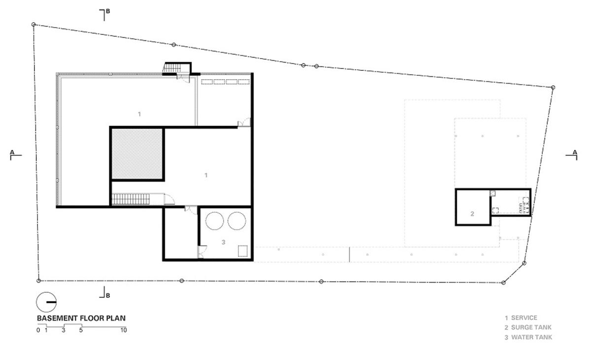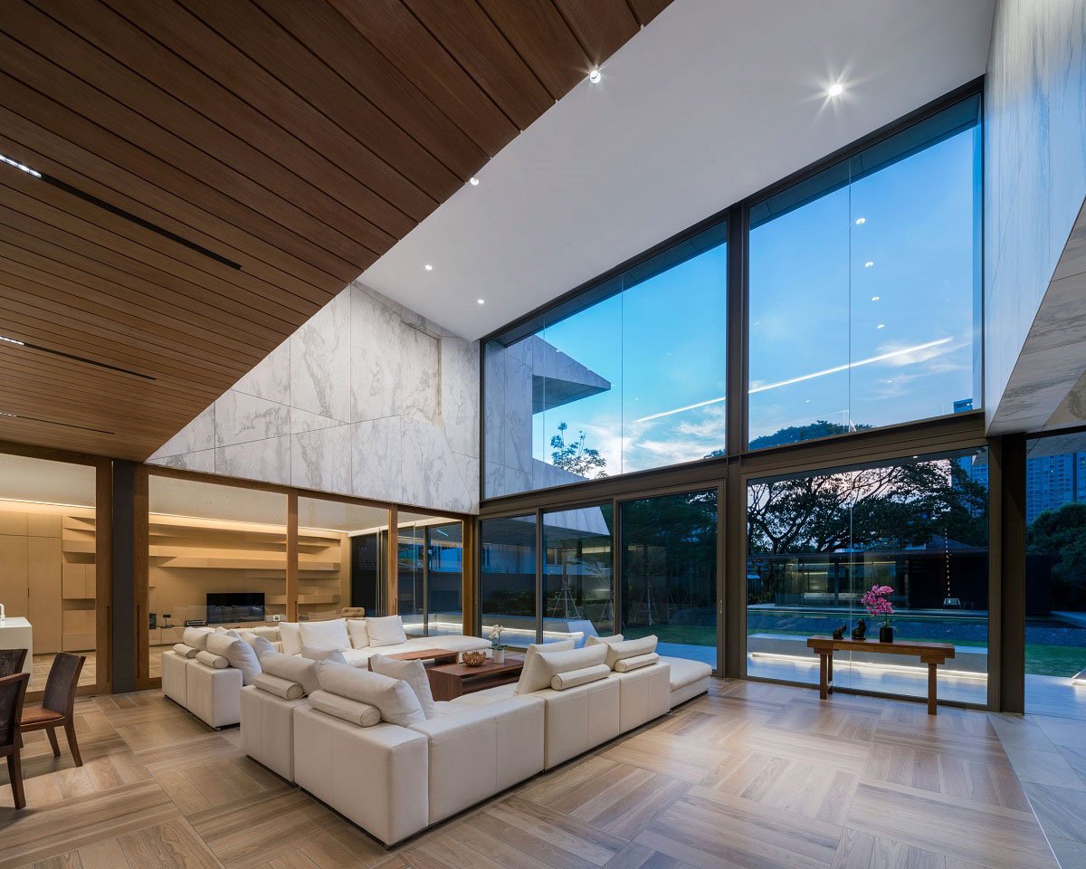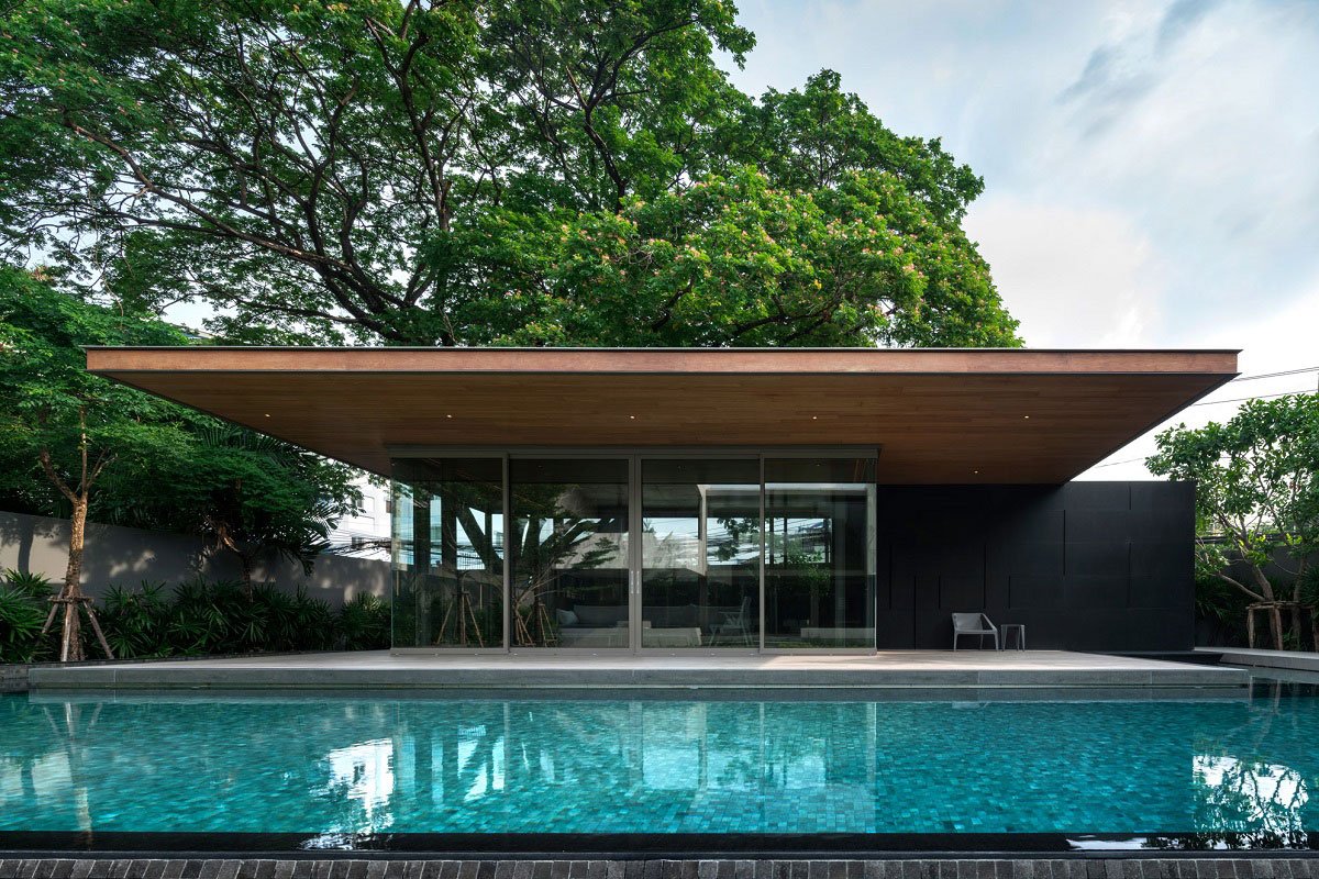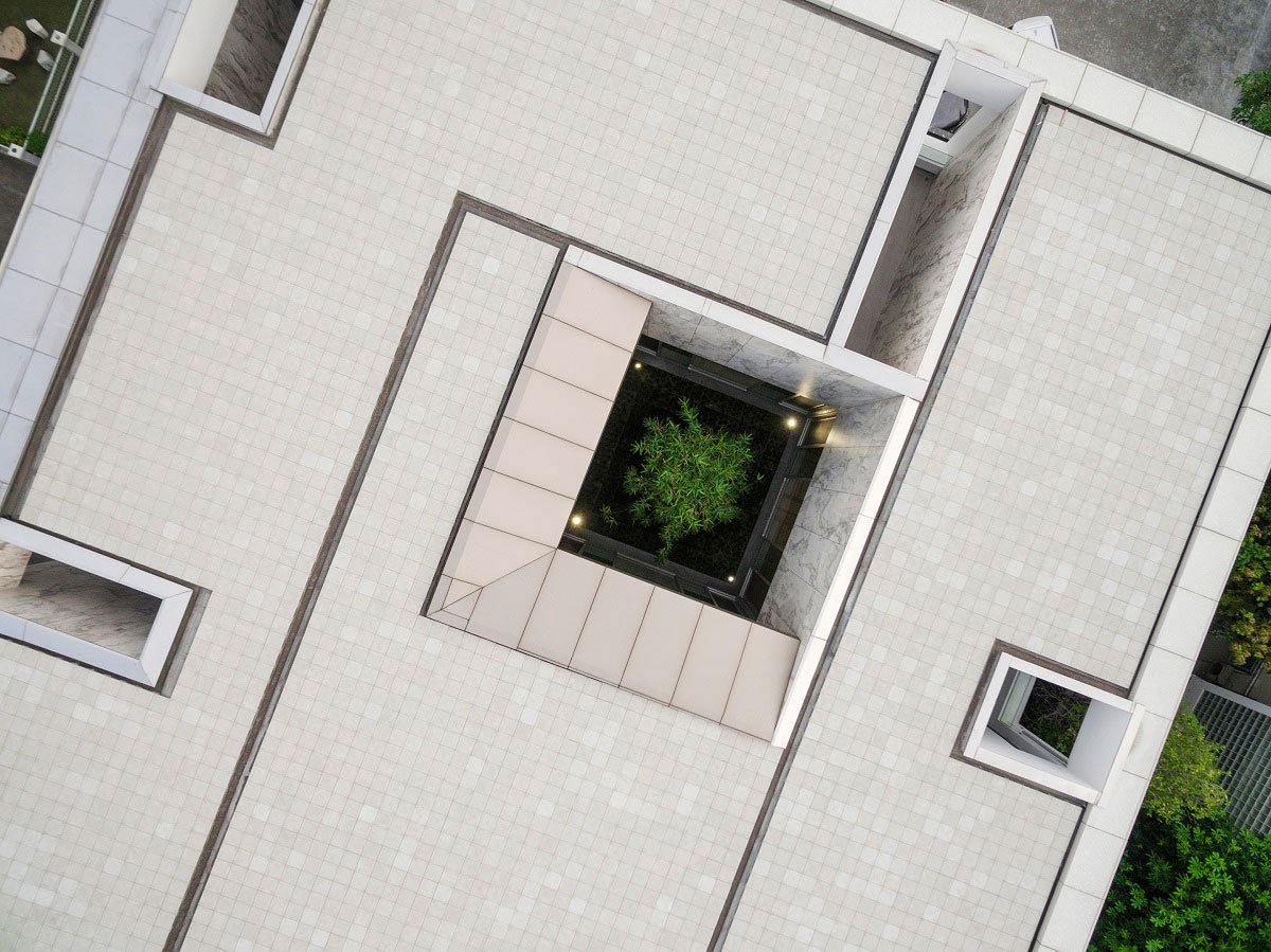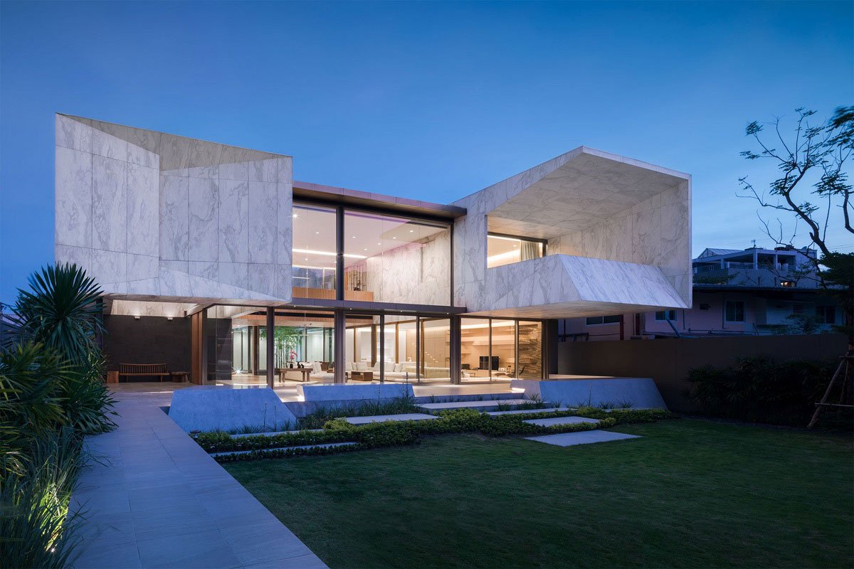 The excavation of unique shape, form and space is created by shifting the building linear and non-linear planes. The Marble House is placed on one end of a rectangular land plot with a large, magnificent Rain tree on the opposite end. The visual impression of the Rain tree is enhanced by a modern architecture style pavilion. A contrast of the simplest structure and a fully grown, natural-formed Rain tree, over a reflective swimming pool surface create a memorable, signature scene for the house.