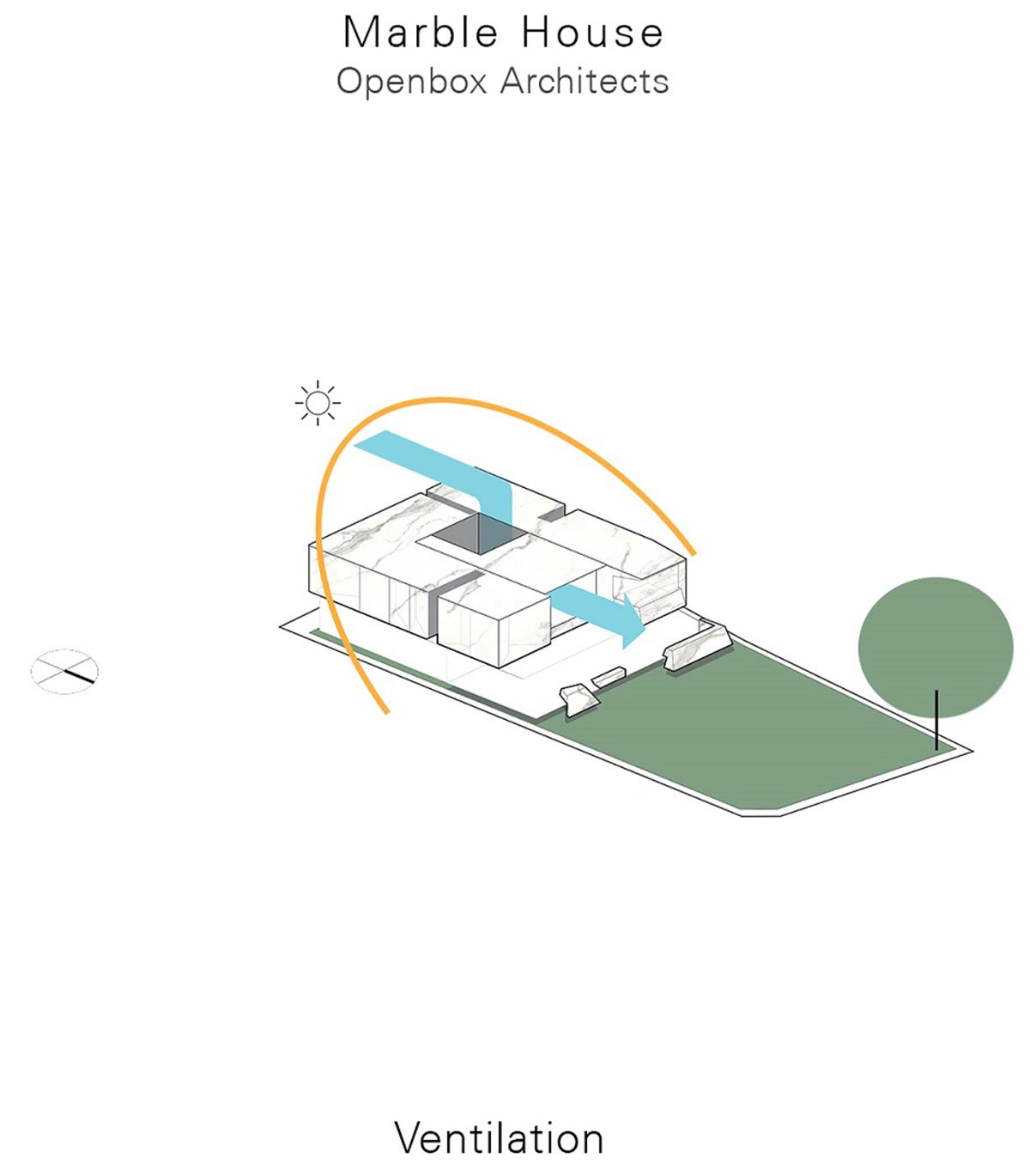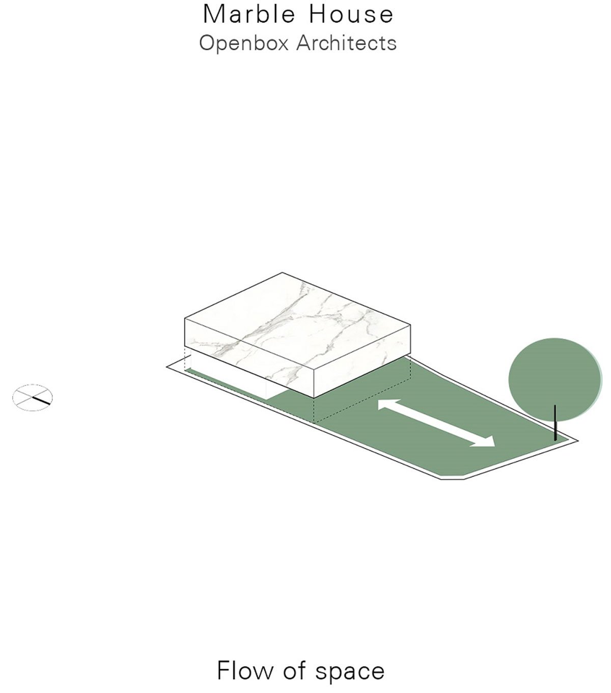 [Text submitted by the Architect] OPENBOX Architects’ recent residential design intertwines architecture, interior and landscape in the form of marble sculpture. The initial idea is to allow habitant’s behavior to carve a dwelling space into a monolithic piece of marble sculpture. The main piece appears so solid, yet so light it floats to defy the gravity, while external landscape space flows underneath through the center courtyard. Residual marble pieces fell onto the ground to become part of the landscape features, isolated, yet visually related so boldly, as they use to be part of the marble boulder.