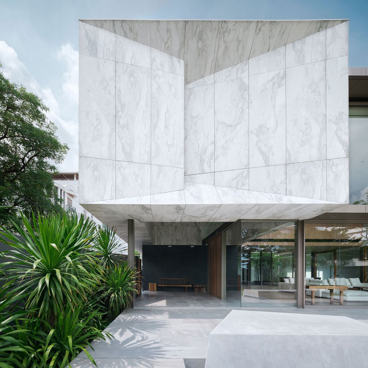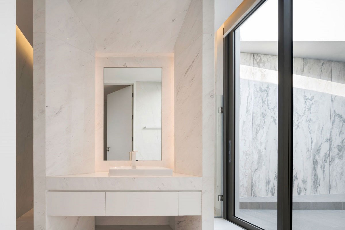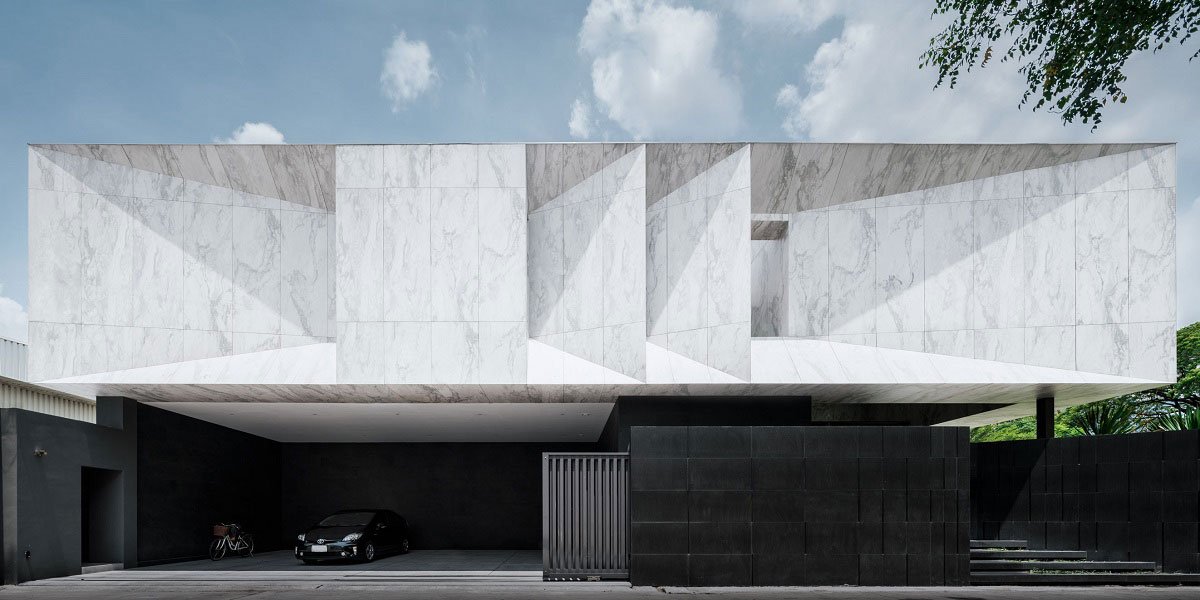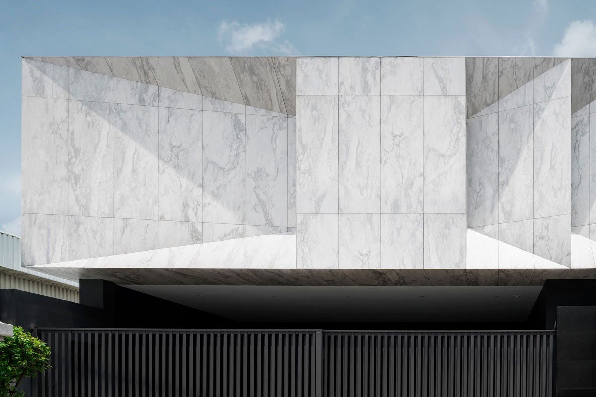 Marble finishes is, in fact, a large scale, light-weight, wall tiles with marble pattern print. As an external finishes applied over a layer of internal brick wall, it also acts as weather cladding, shielding the house from direct Sunlight, and external heat of Bangkok summer, and therefore help to cool down the interior during the day.
