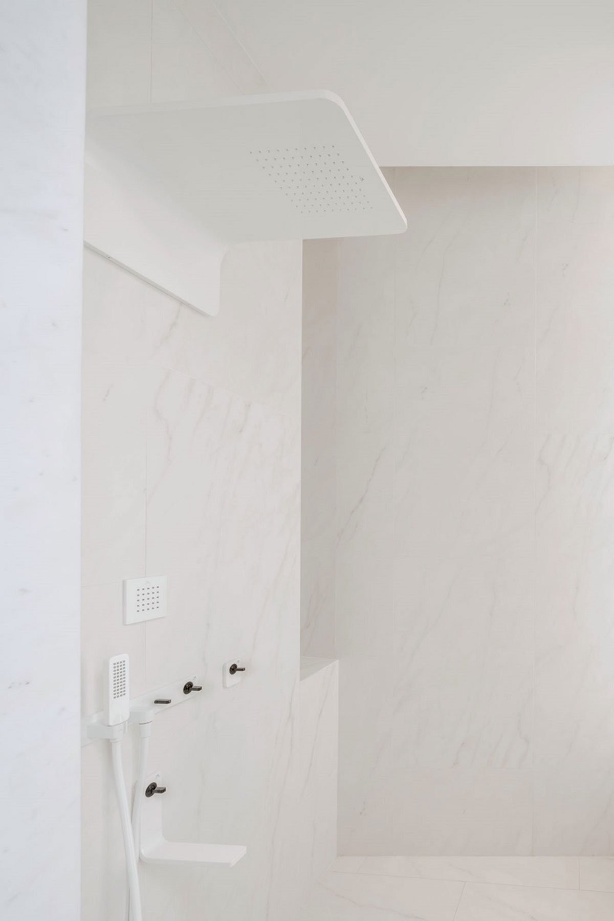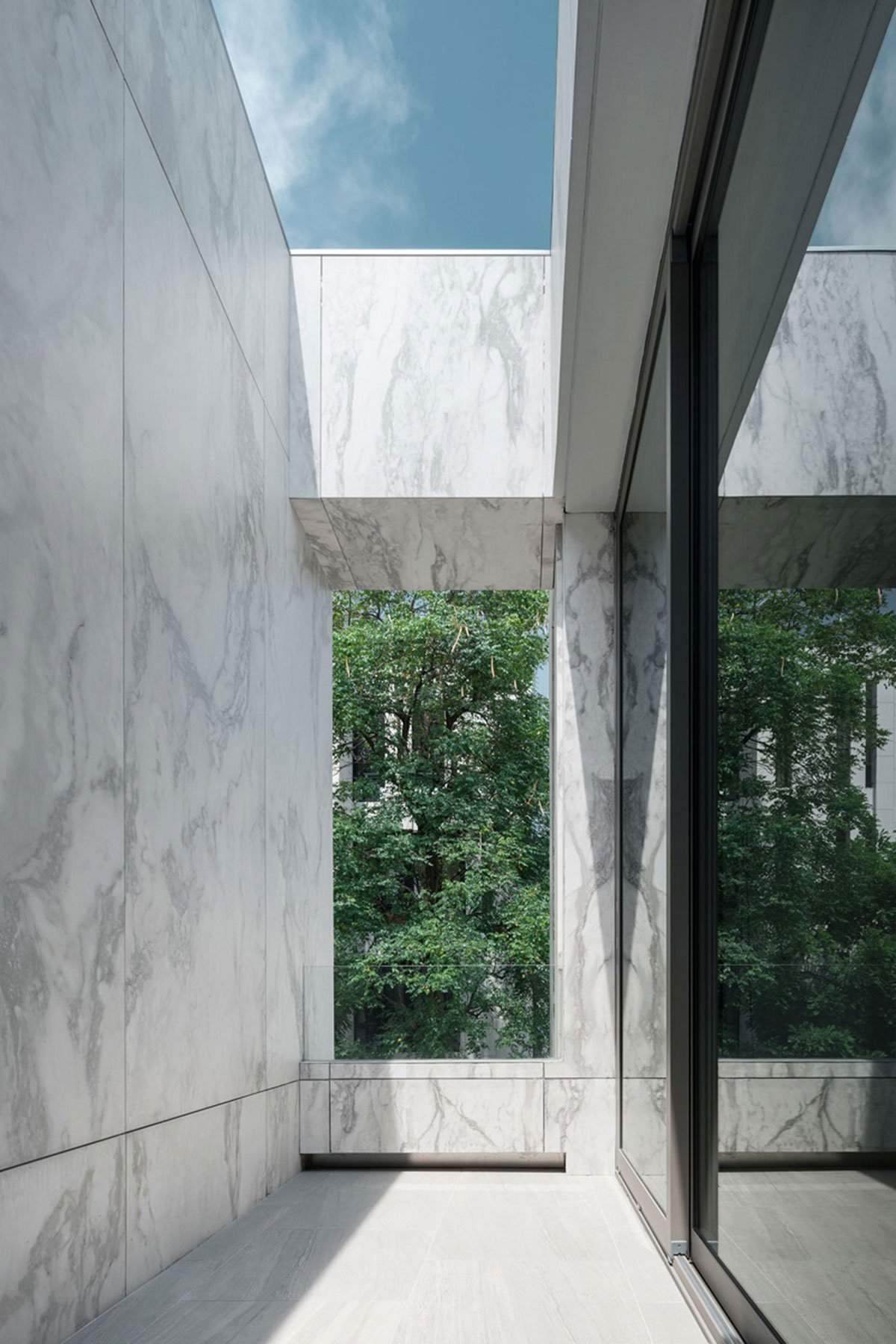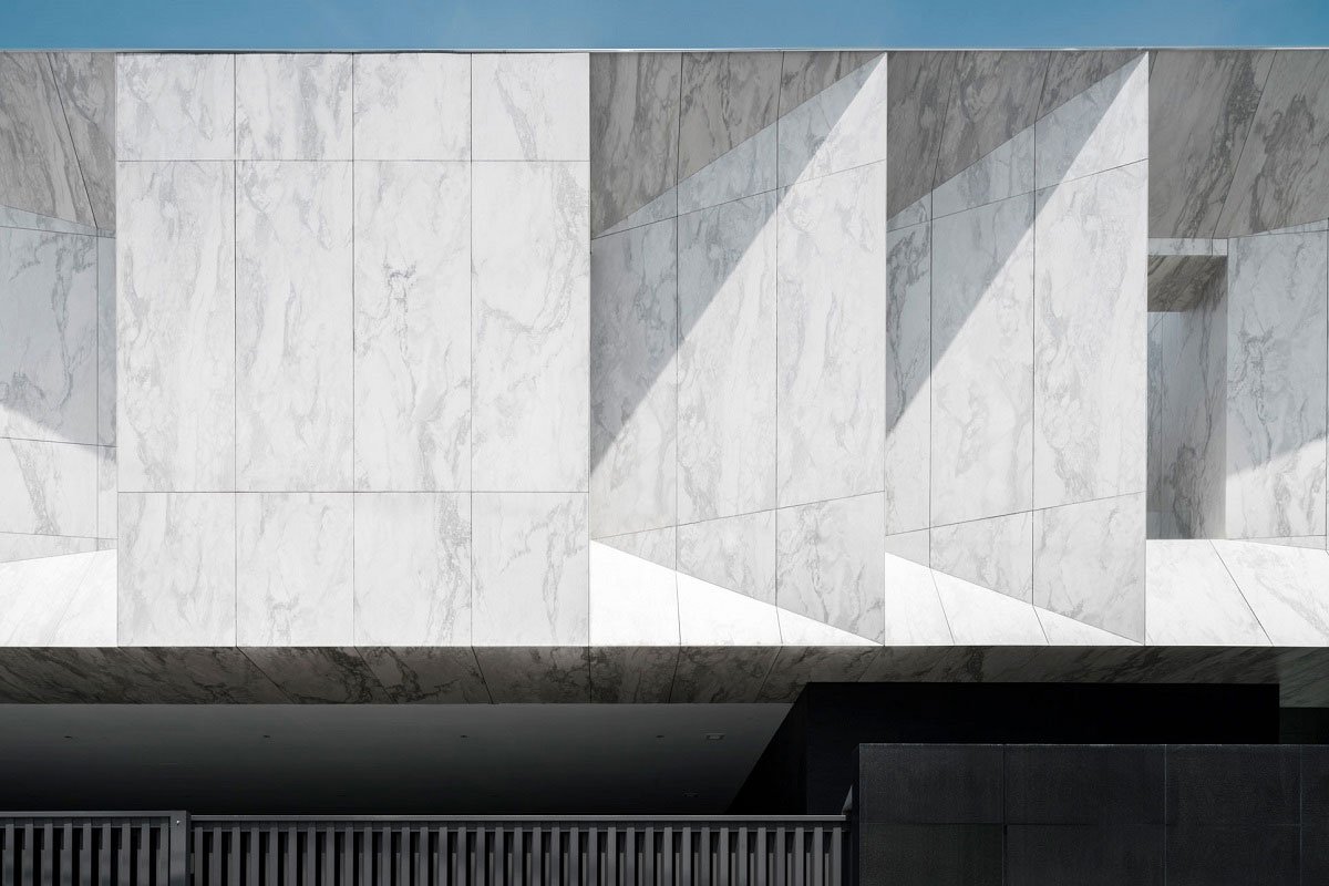 Marble finishes is, in fact, a large scale, light-weight, wall tiles with marble pattern print. As an external finishes applied over a layer of internal brick wall, it also acts as weather cladding, shielding the house from direct Sunlight, and external heat of Bangkok summer, and therefore help to cool down the interior during the day.