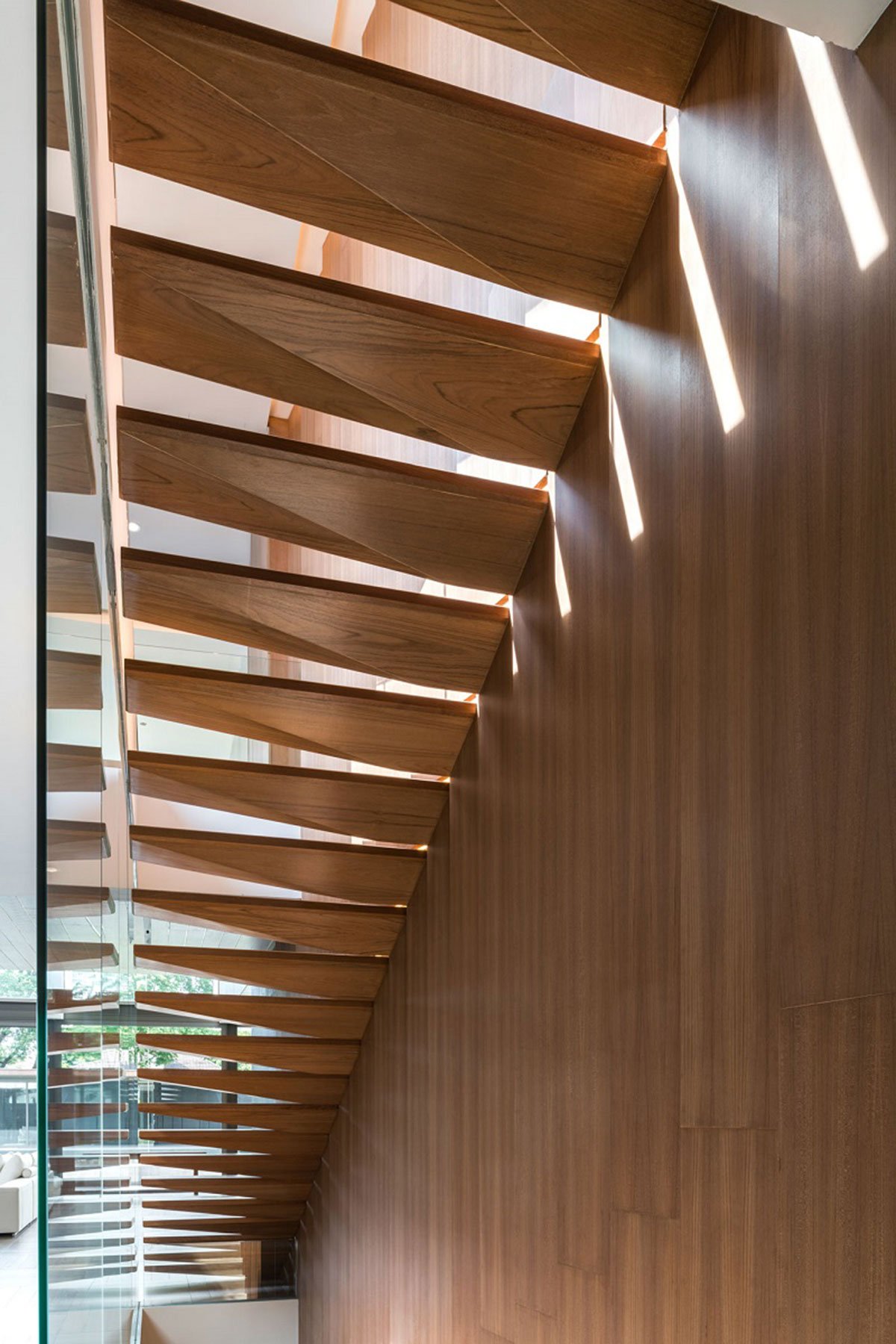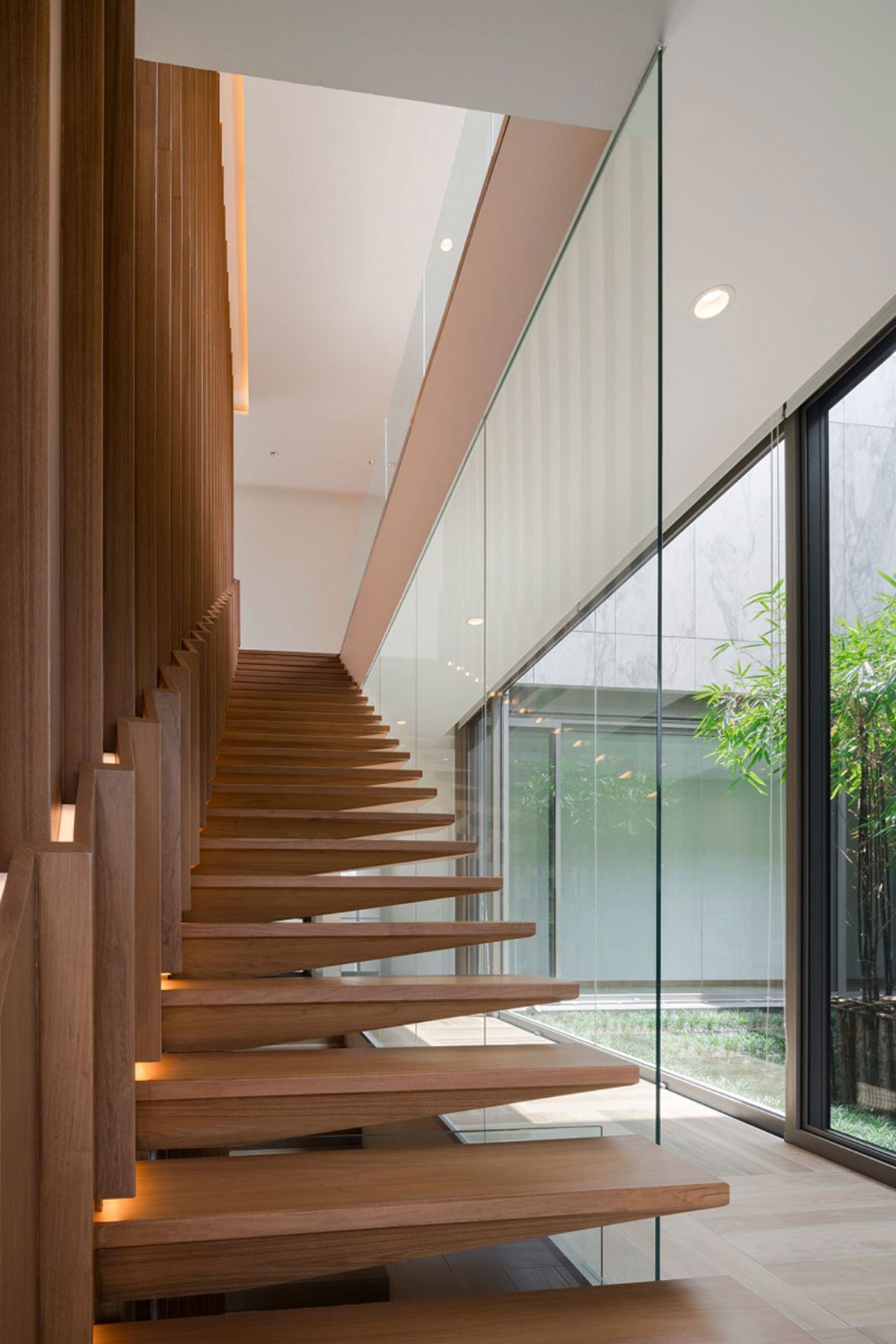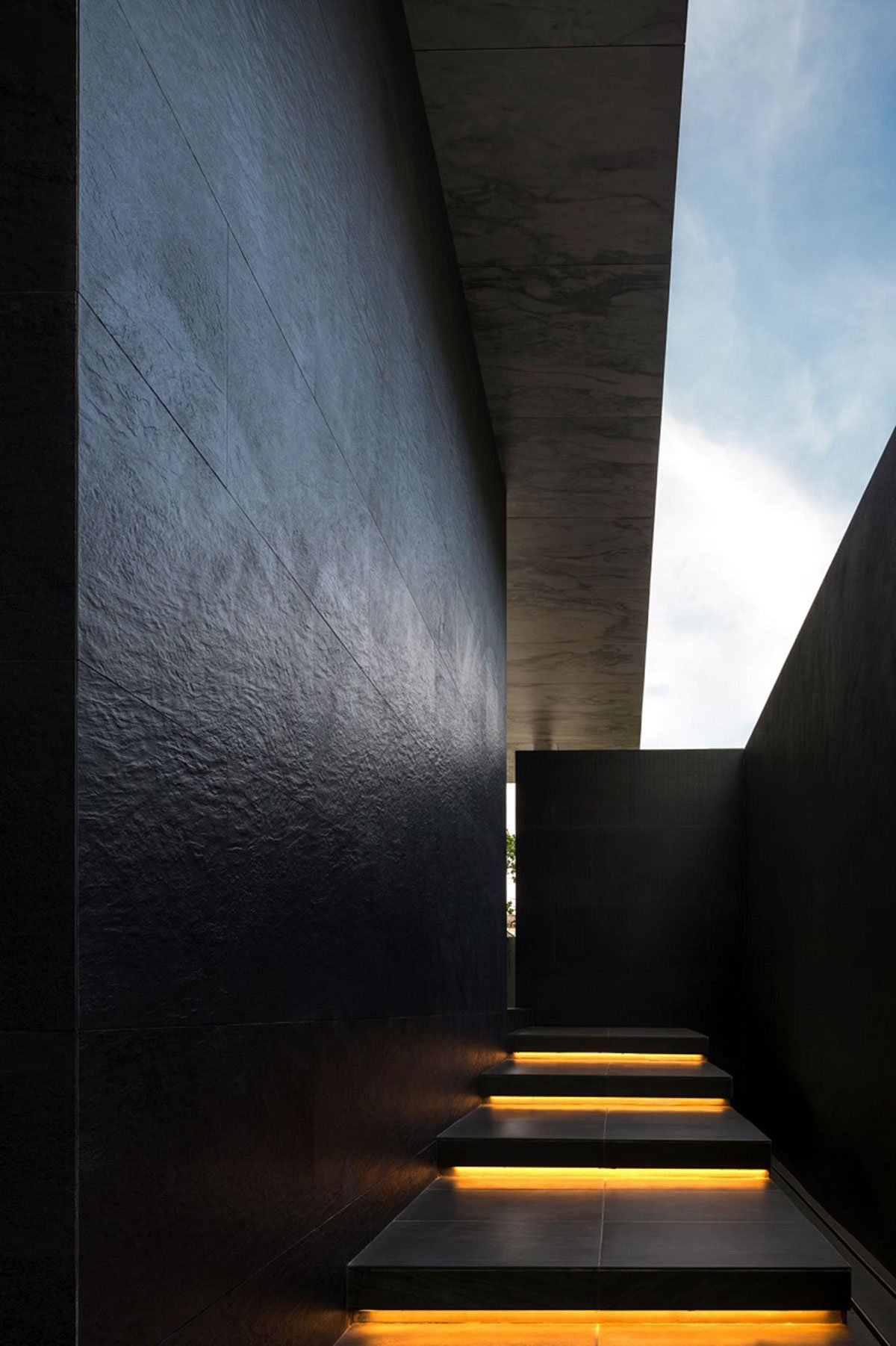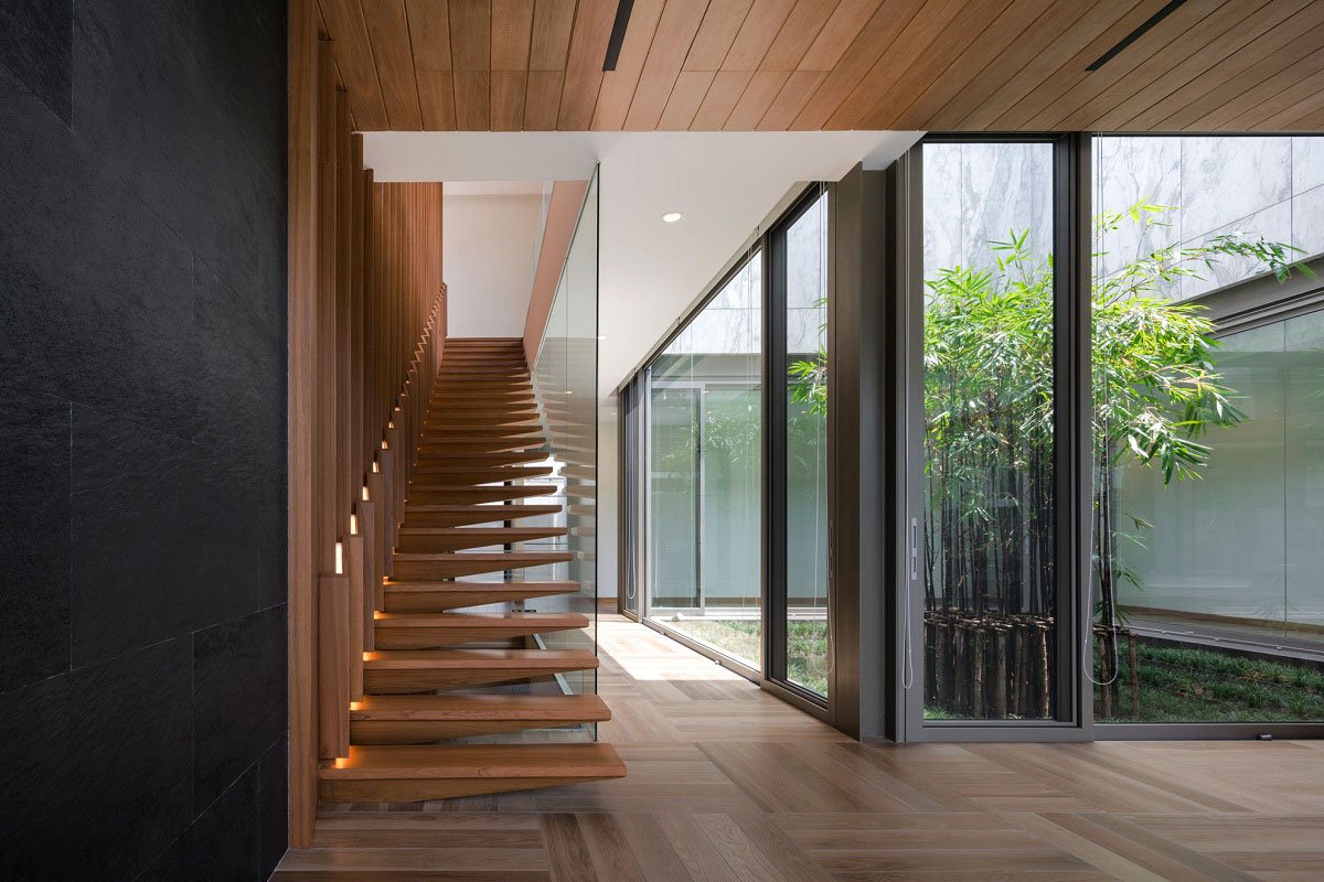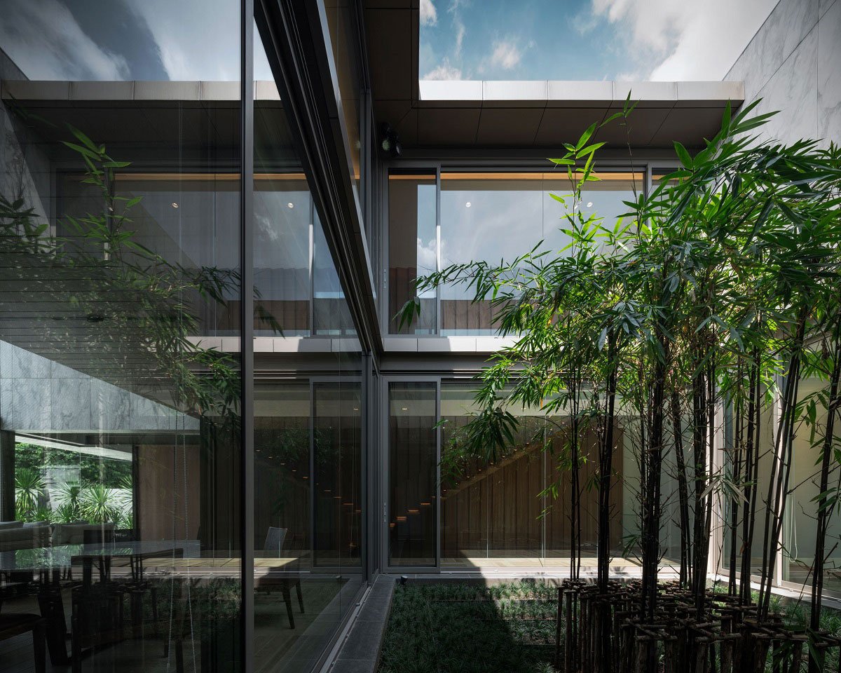 The concept “private balconies” are very useful for an urban residence, surrounded by neighbors. Pockets of enclosed open terraces create privacy, but still welcome natural light and ventilation. The void above such area becomes a great feature, as the terms given by the architect, “the private sky”.
