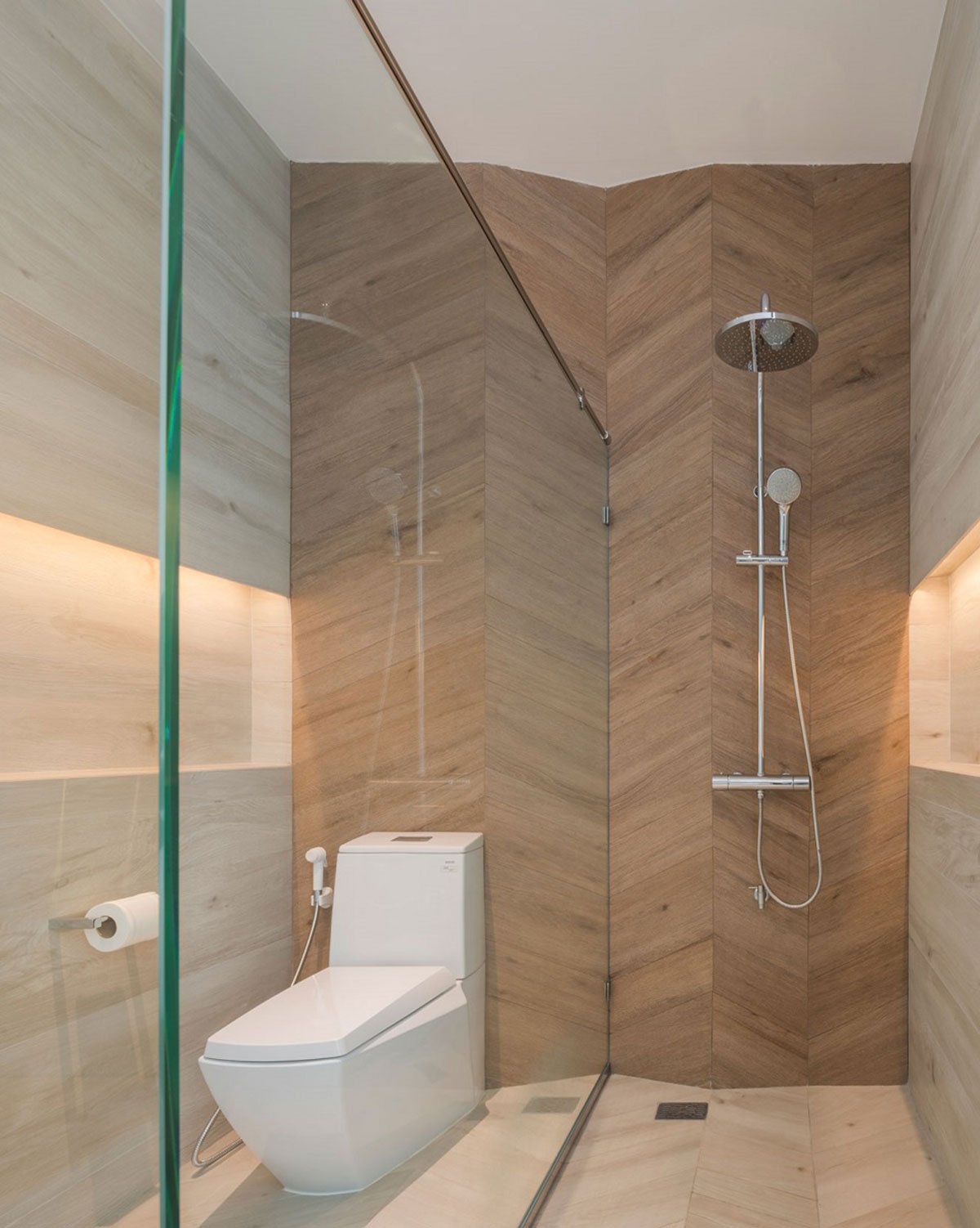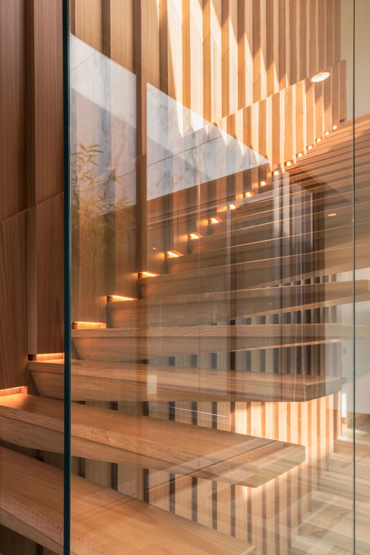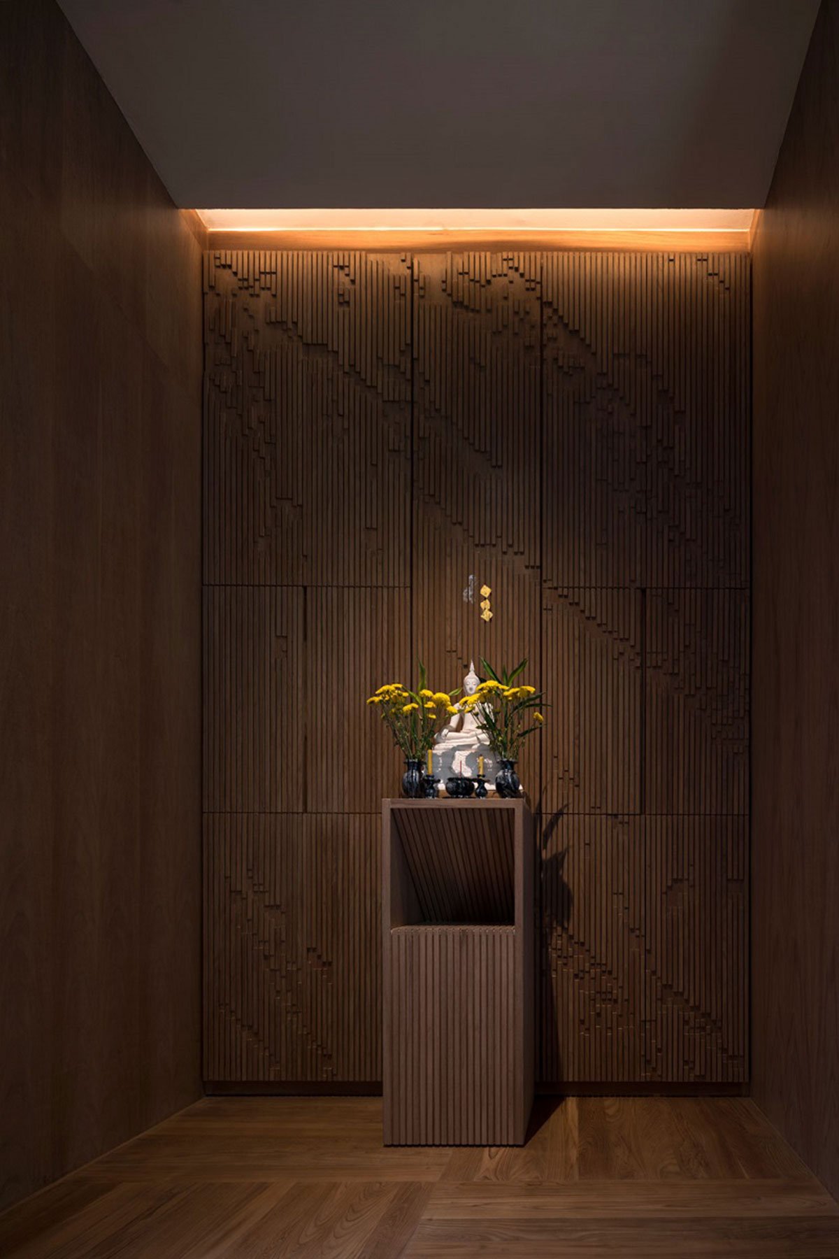 Some windows have to be placed on the neighboring side. The concept of tilting of windows towards more open corner of surroundings also contributes to the form of the house. After all, it all started by having the habitant’s behavior and view preference to naturally form this piece of sculpture. The play of materials, space and forms flows seamlessly inside-out, and outside-in making strong connections between architecture, landscape and interior.
