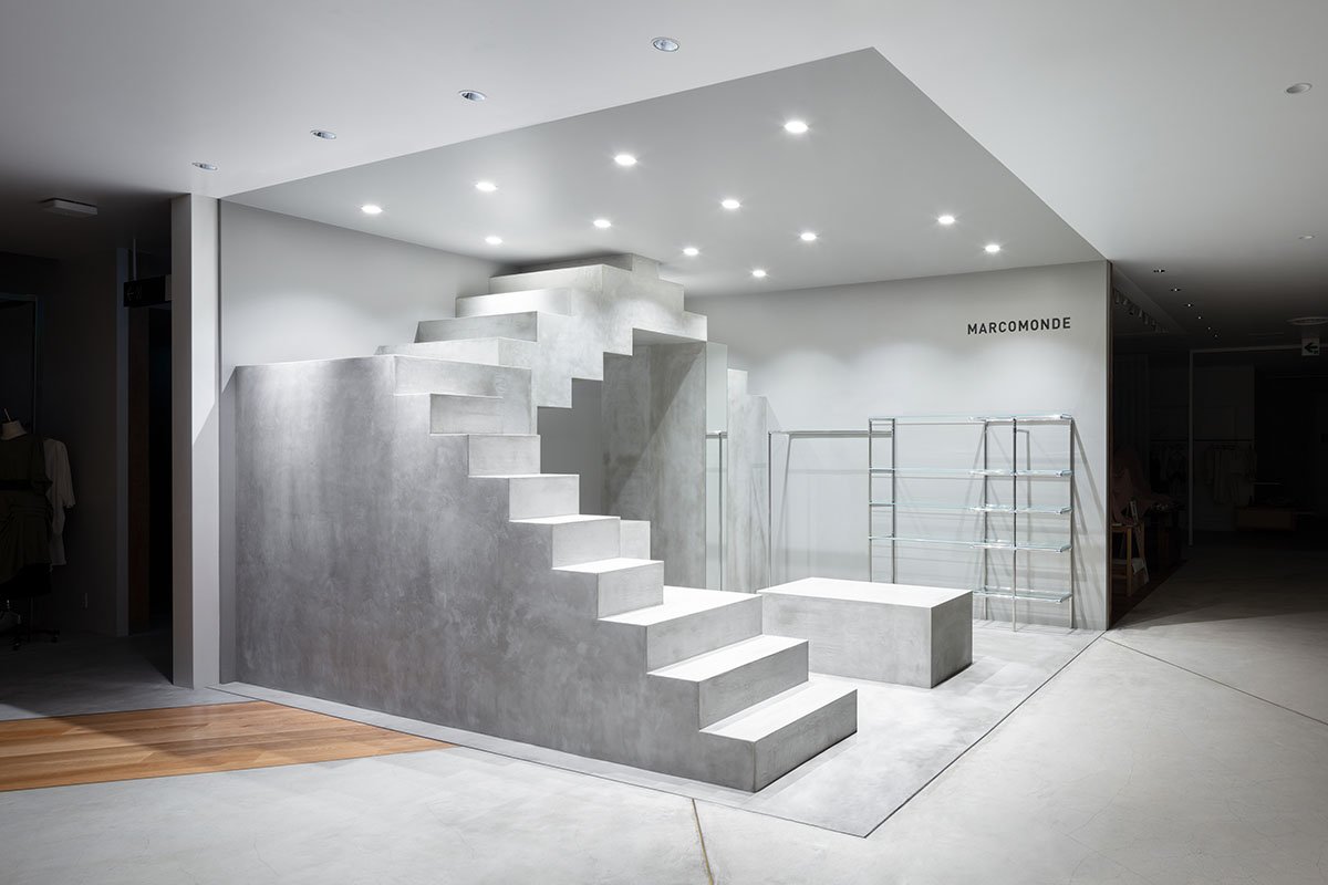 Excerpt: Marcomonde Shibuya, designed by UUfie, represents the first permanent retail space for the Japanese fashion brand, Marcomonde. The apparel line is a fusion of culture and fashion. The space—composed of stairs, millwork, and floor—has been conceived as a free-standing, abstract, geometric sculpture. The overall design gives the appearance of a staircase, but this is an illusion, as the staircase leads nowhere. In relationship to the main building, the store creates an intriguing physical disorientation by suggesting a stairway leading to a secret place.