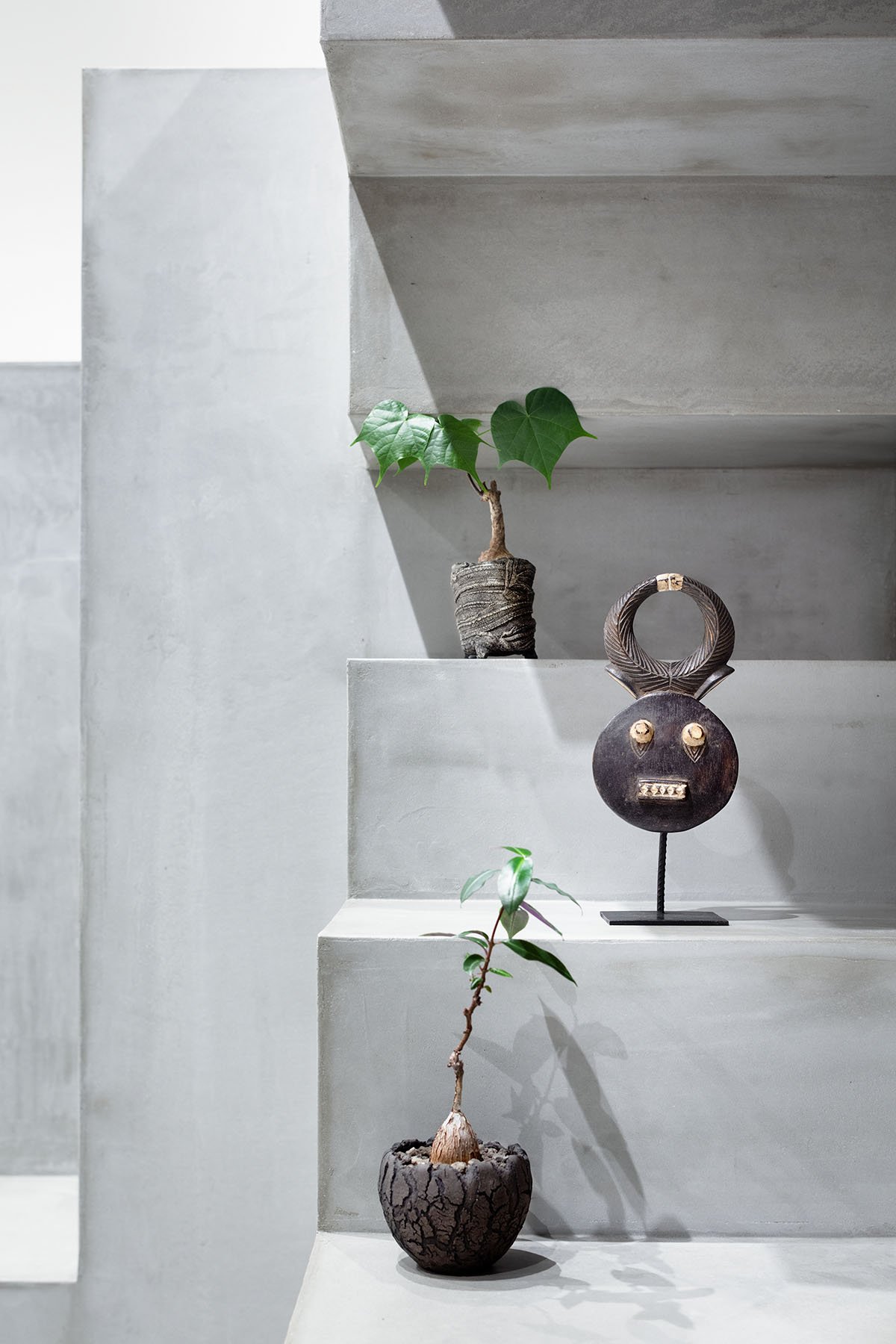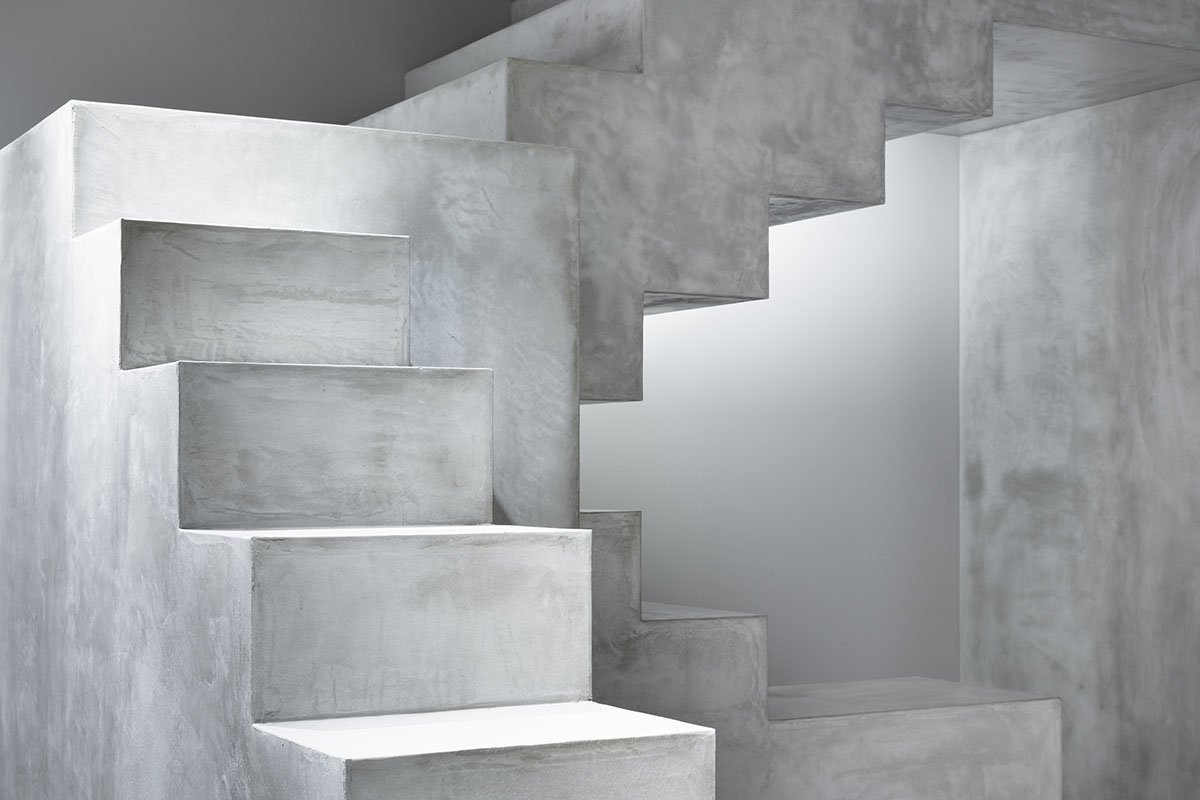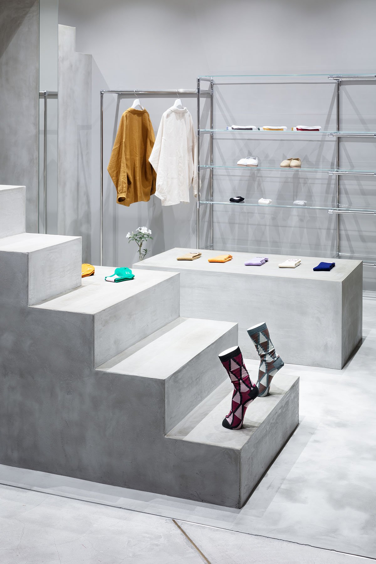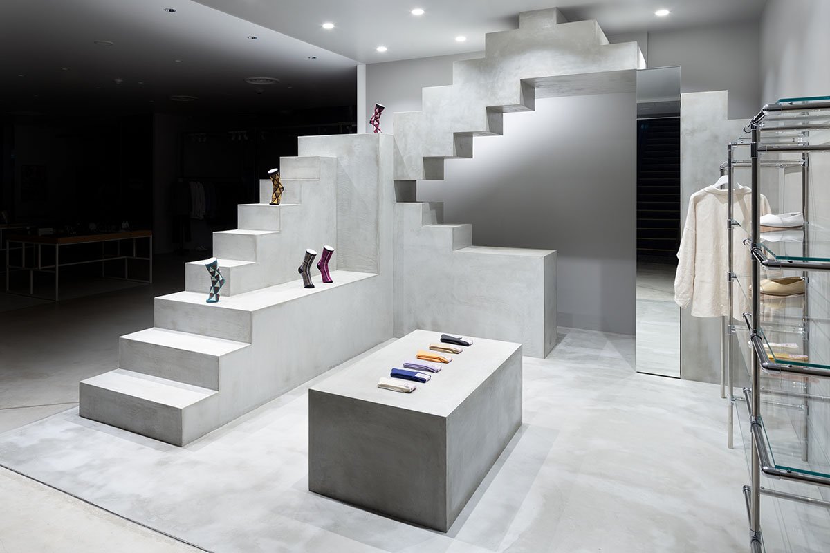 The overall design gives the appearance of a staircase, but this is an illusion, as the staircase leads nowhere. Like animated objects, the footwear and other apparel are casually displayed along the staircase. Clothing items are hung on simple industrial piping, continuing the design’s playful surrealism. The stair surfaces, walls, floors and panels have been uniformly finished with durable, epoxy-resin mortar with grey undertones that showcase the colour, pattern, and detail of the products. The shelves are made of stainless-steel pipe and high-translucency clear glass that complement the building’s existing infrastructure. Although the assembled space has the appearance of a solid block, it’s in fact a shell allowing hidden functional chambers for storage, a change room, and a desk.