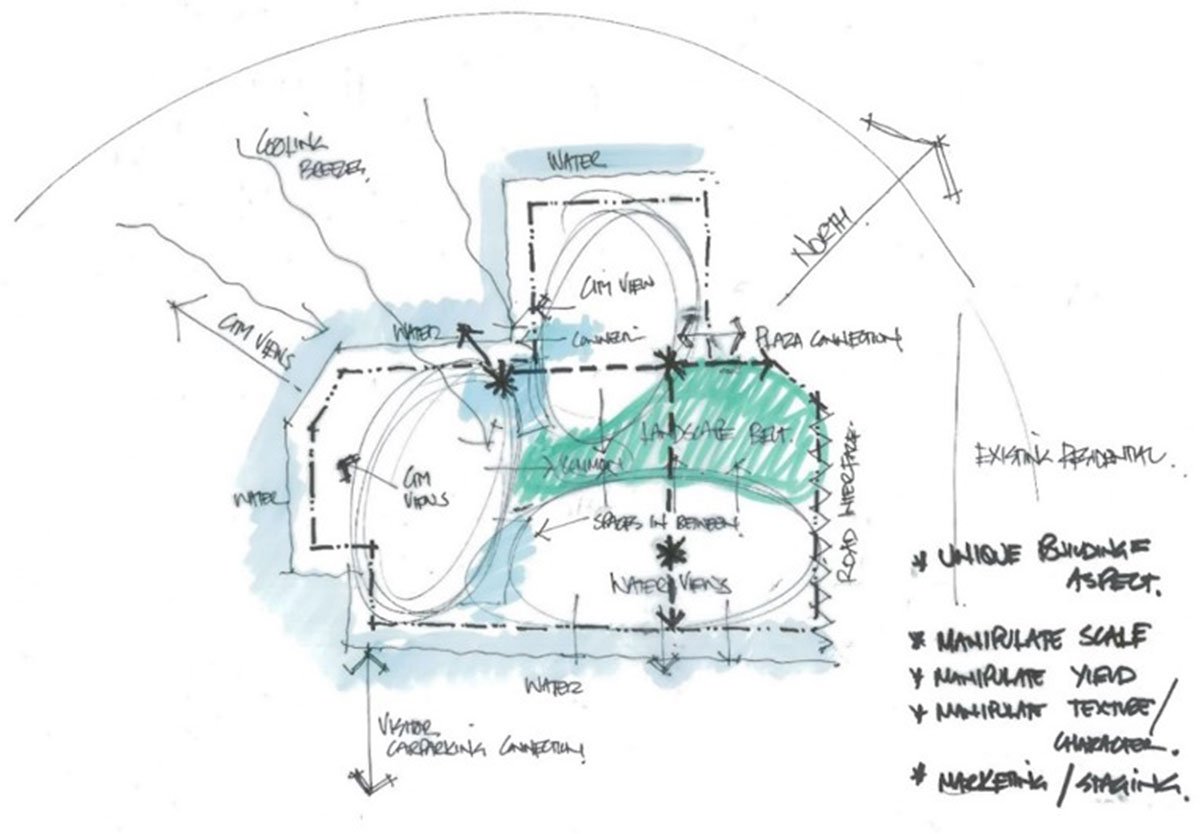 The site is in an enviable position of which three sides surround it by water, with the forth side facing north over an existing plaza. It is the site’s irregular shape which informs the positions of each building.By perching on the periphery of the site we maximise the spaces between each and create a space for the community to congregate in the central podium landscape area.Maximising the distance between each building also increases privacy, allows for better solar access, cross ventilation and access to views for residents. It also reduces the feeling of being part of a large development and enhances the feeling of being part of three exclusive bespoke ones, clustered together.