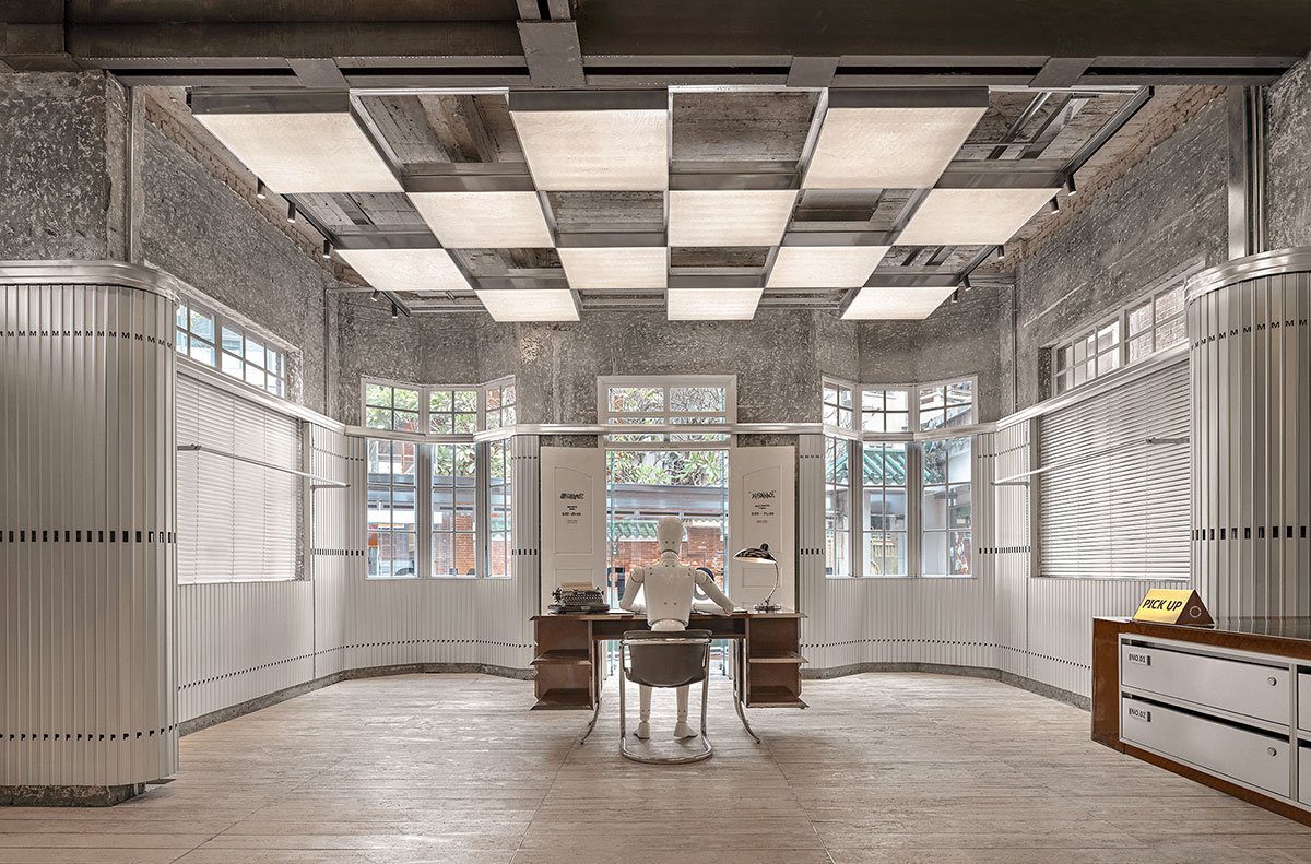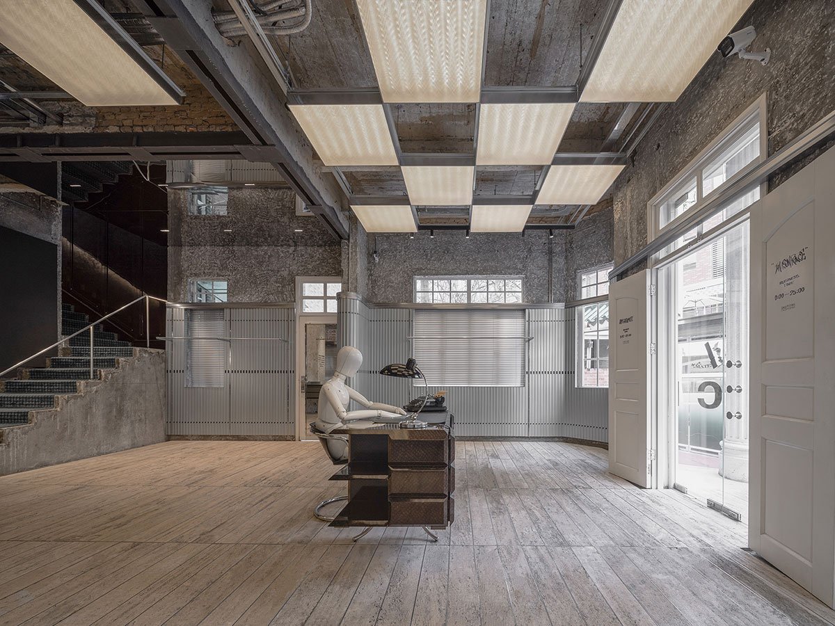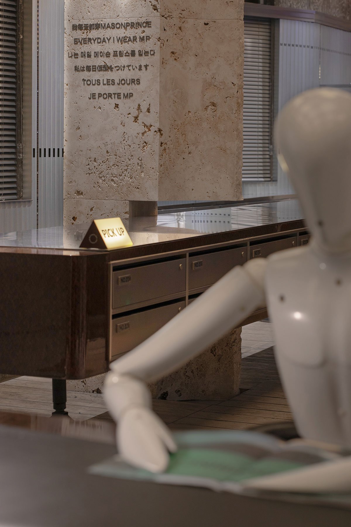 Inscribed with the logo of MASONPRINCE, the metal glitters with a futuristic sense found in science fiction, covering the old walls that belong to the present. A weird humanoid figure from the future sits behind a modern office desk. The well-selected items of MASONPRINCE are displayed here, arranged in rows stretching deep into the space under the dim, yellow light. Videos about MASONPRINCE are played on a screen, which is like a time mailbox that delivers fashion packages to time travellers who visit the store.