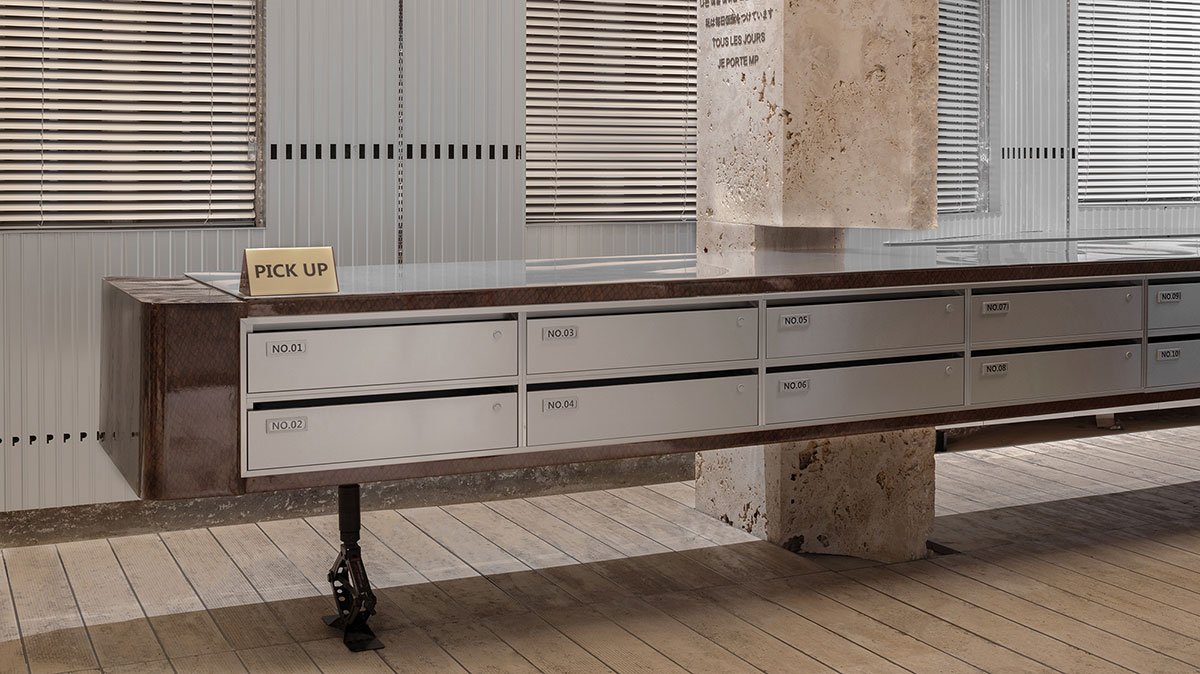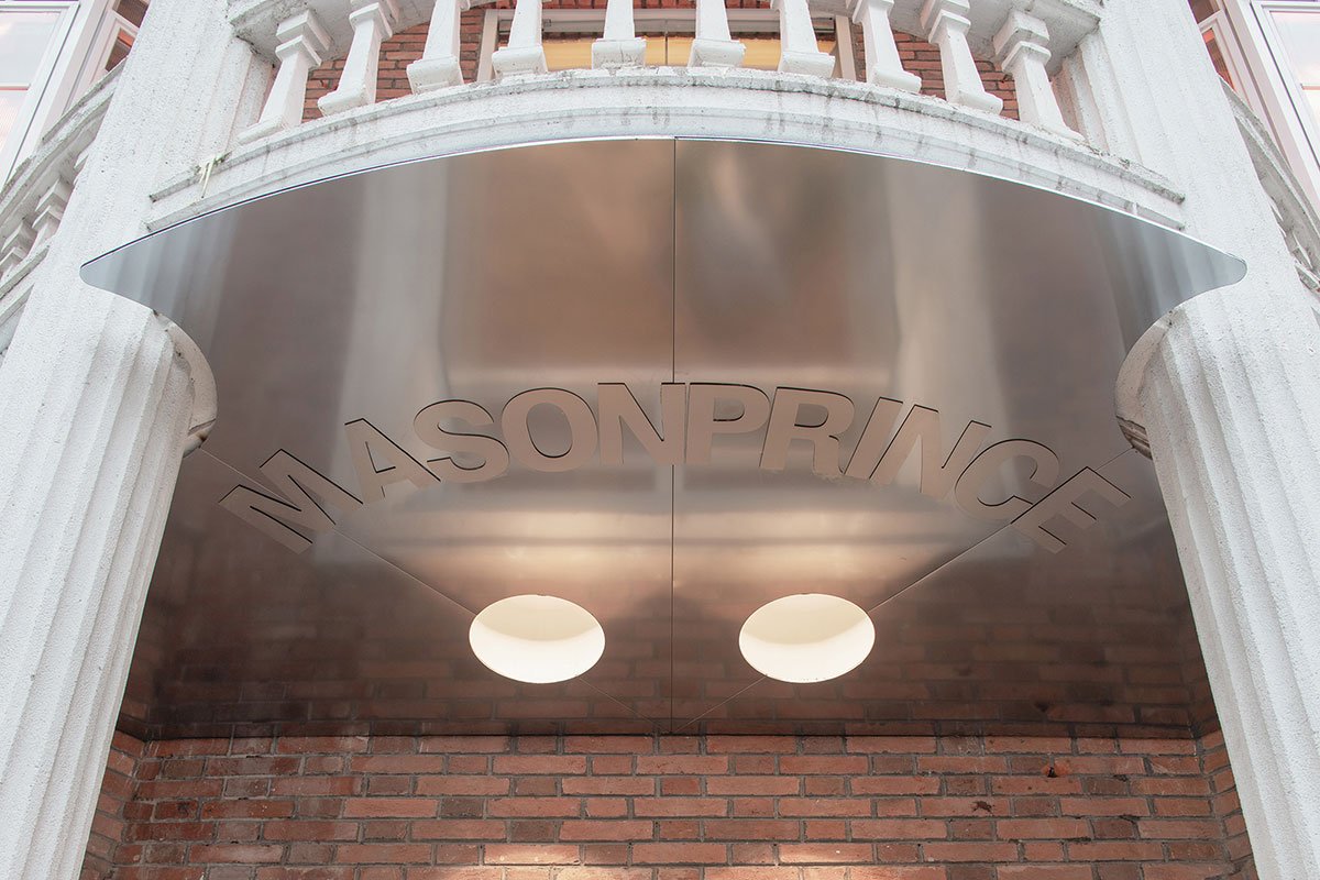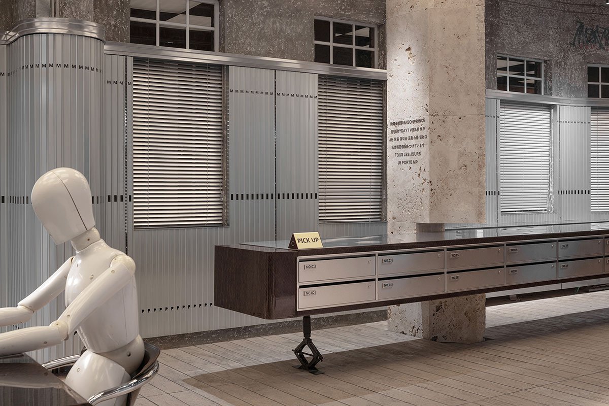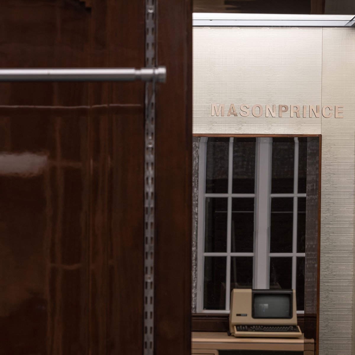 Inscribed with the logo of MASONPRINCE, the metal glitters with a futuristic sense found in science fiction, covering the old walls that belong to the present. A weird humanoid figure from the future sits behind a modern office desk. The well-selected items of MASONPRINCE are displayed here, arranged in rows stretching deep into the space under the dim, yellow light. Videos about MASONPRINCE are played on a screen, which is like a time mailbox that delivers fashion packages to time travellers who visit the store.