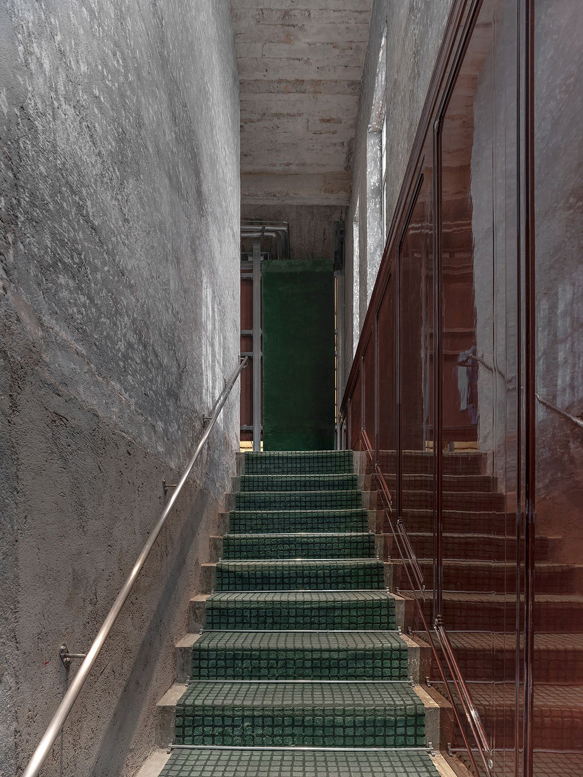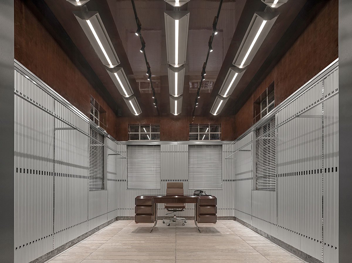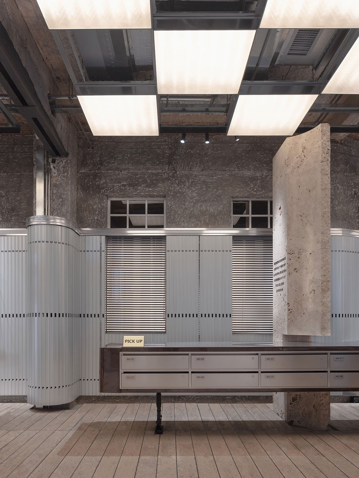 The interplay between the future and the present within the space and the contrasts it creates bring a unique experience to the visitors. As the interrupted timeline extends deeper into the space, vagueness and contrast develop in the spatial functions and the expression of substances. The fitting room and the accessory room are subtly envisioned as an “elevator” and “elevator hall”.