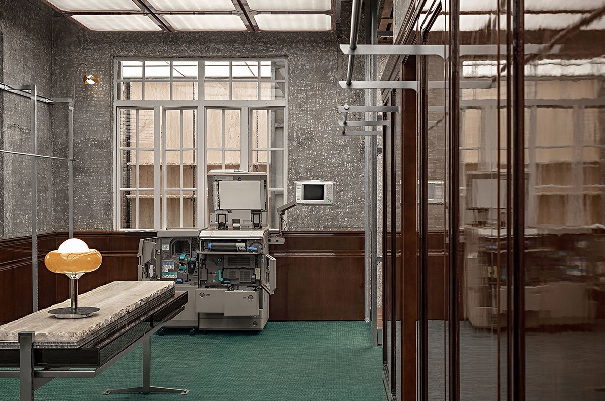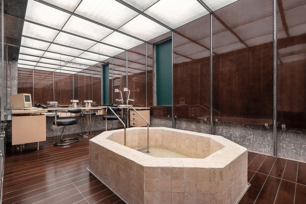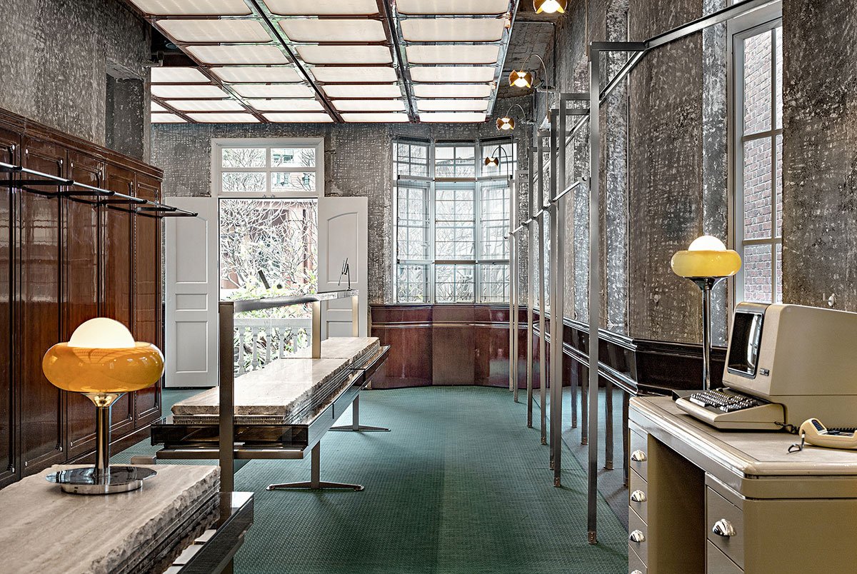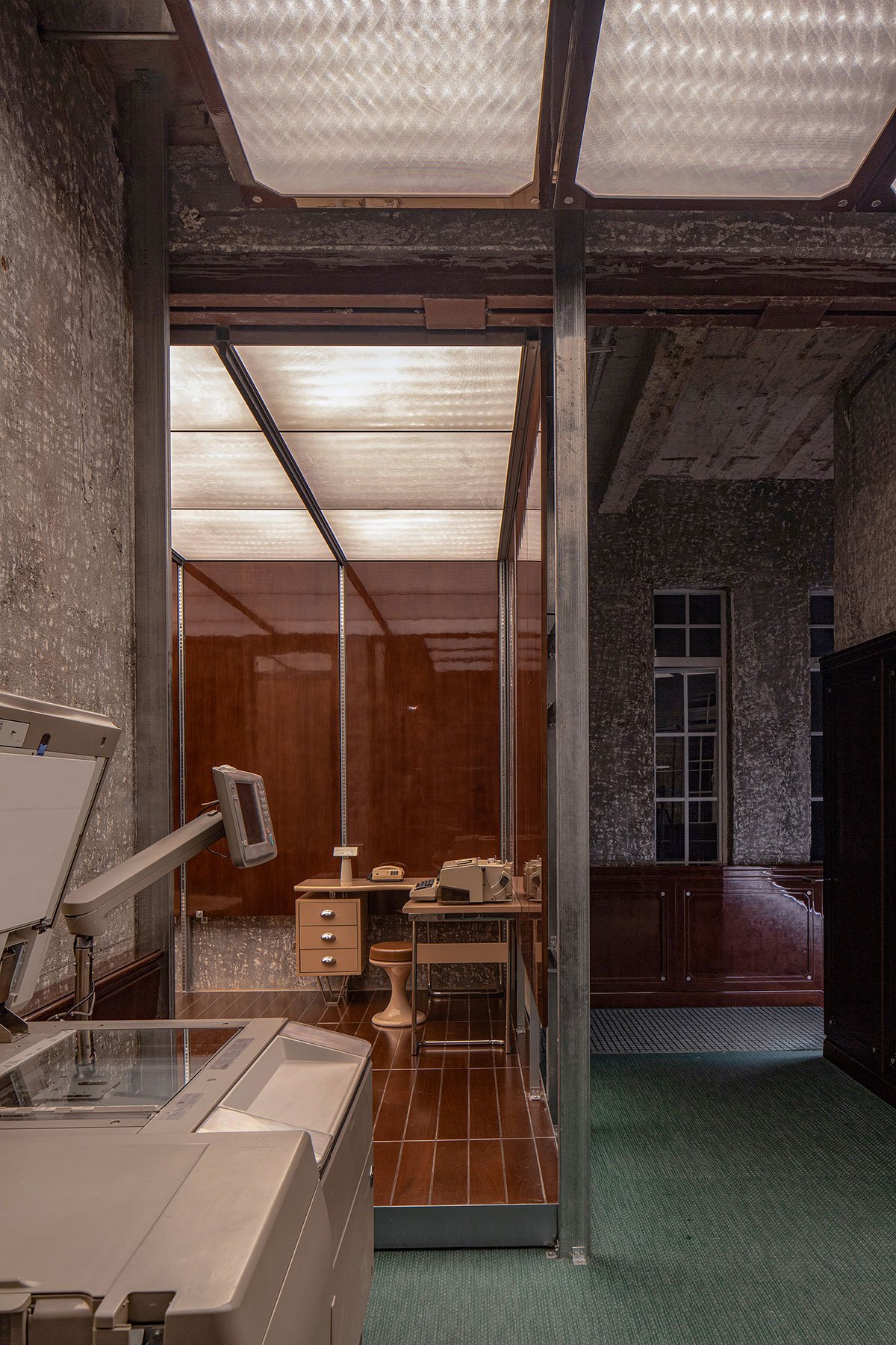 The bathroom is designed as “filing cabinets” in the time archive room.