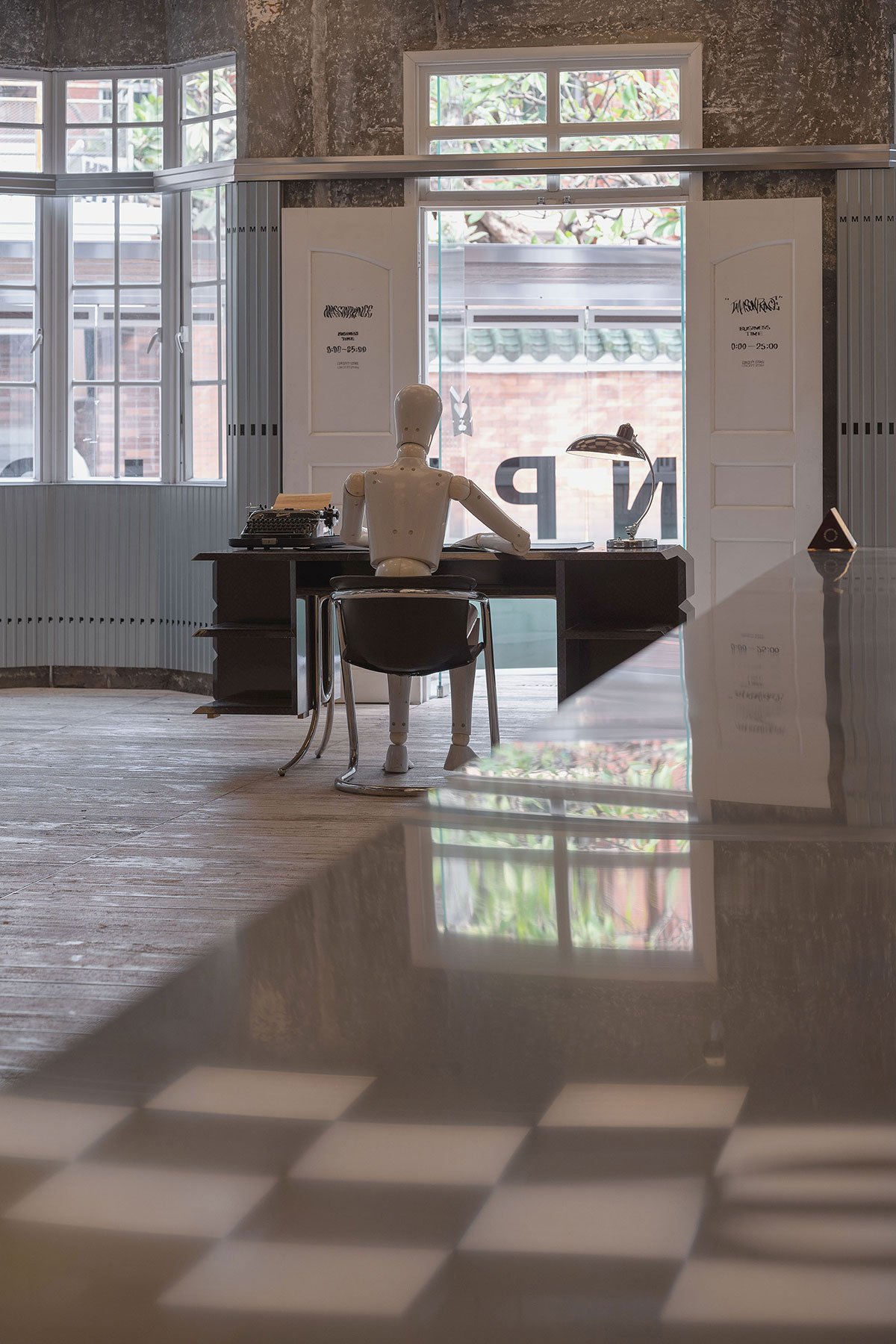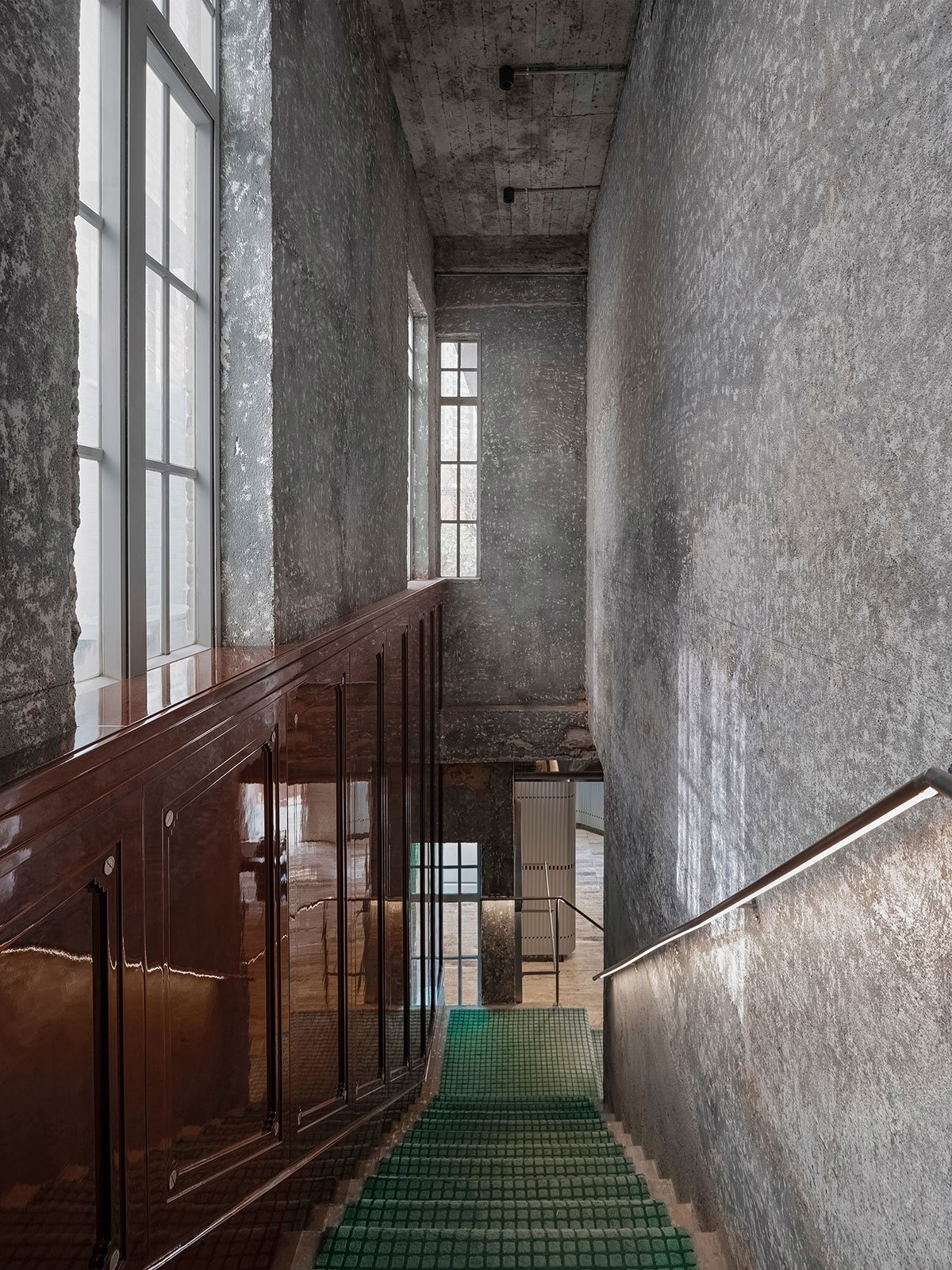 By decomposing time consciousness, it’s about the past and the time sequential imagery field of the present. The order of time is reversed. The year 1931 in the reversed timeline represents the inner mapping concept of MP, and it appears in the spatial overlap of the year 2023 in the forward timeline, embodying the decomposed overlap and stream of consciousness of the original memory fragments in the space. Spatial scenes: leaping stairs, retro office, workshop show stand, reception room. The staircase, marking a leap in time and space, is in between one rustic wall and one shiny wall, implying the dialogue between the past and present in the next journey.