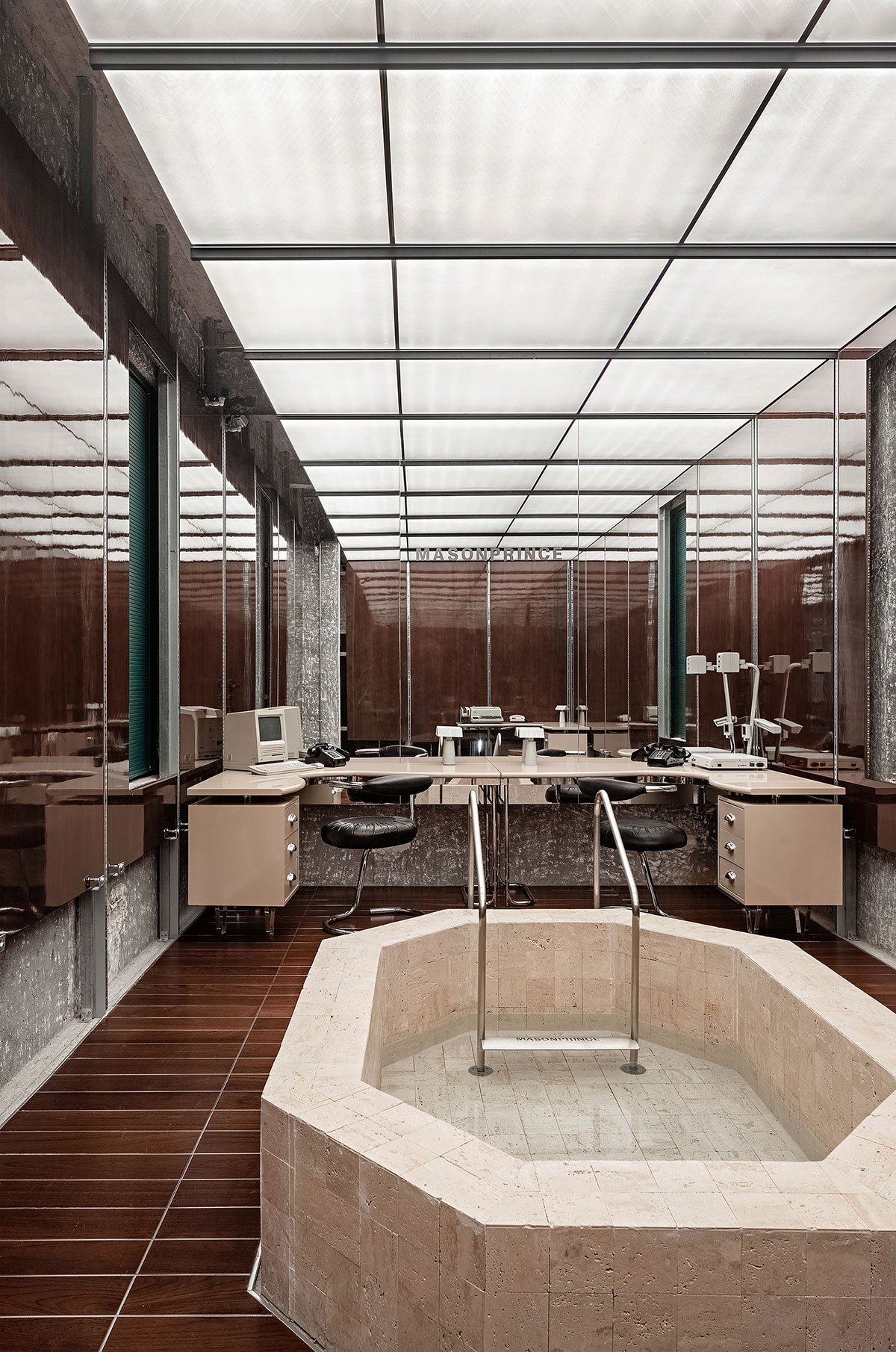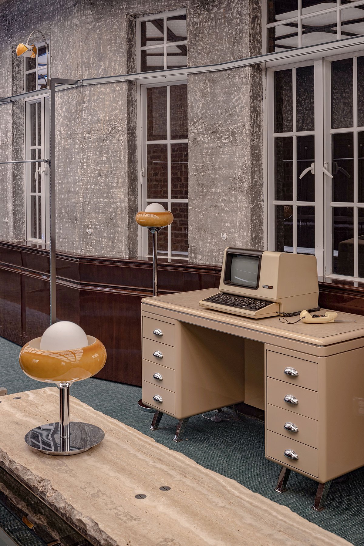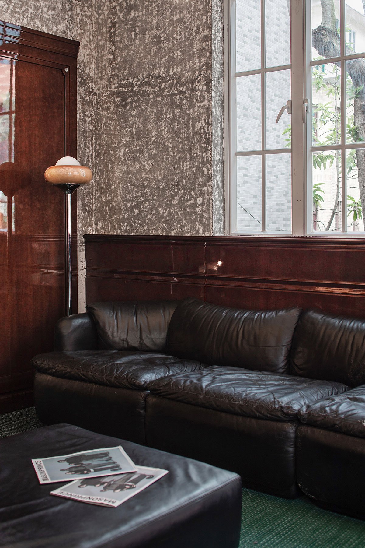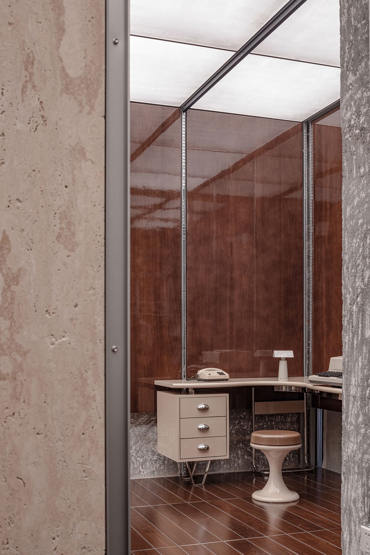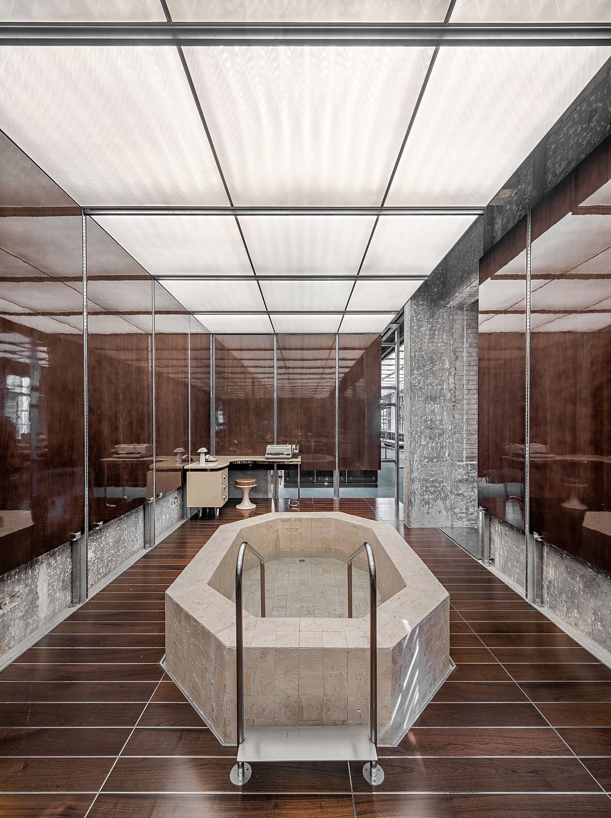The distressed tabletop is finely polished, whilst telling the story of time. The retro wooden wardrobe displays accessories. A formal office accommodates a bathtub. With no limitations, the space is full of imagination, where absurdity and surprises are so natural here. Vintage items, such as a printer, a computer and a first-generation mobile phone on a retro desk, are brought into the space. Those elements bring people back to the past and make time seem to slow down here.