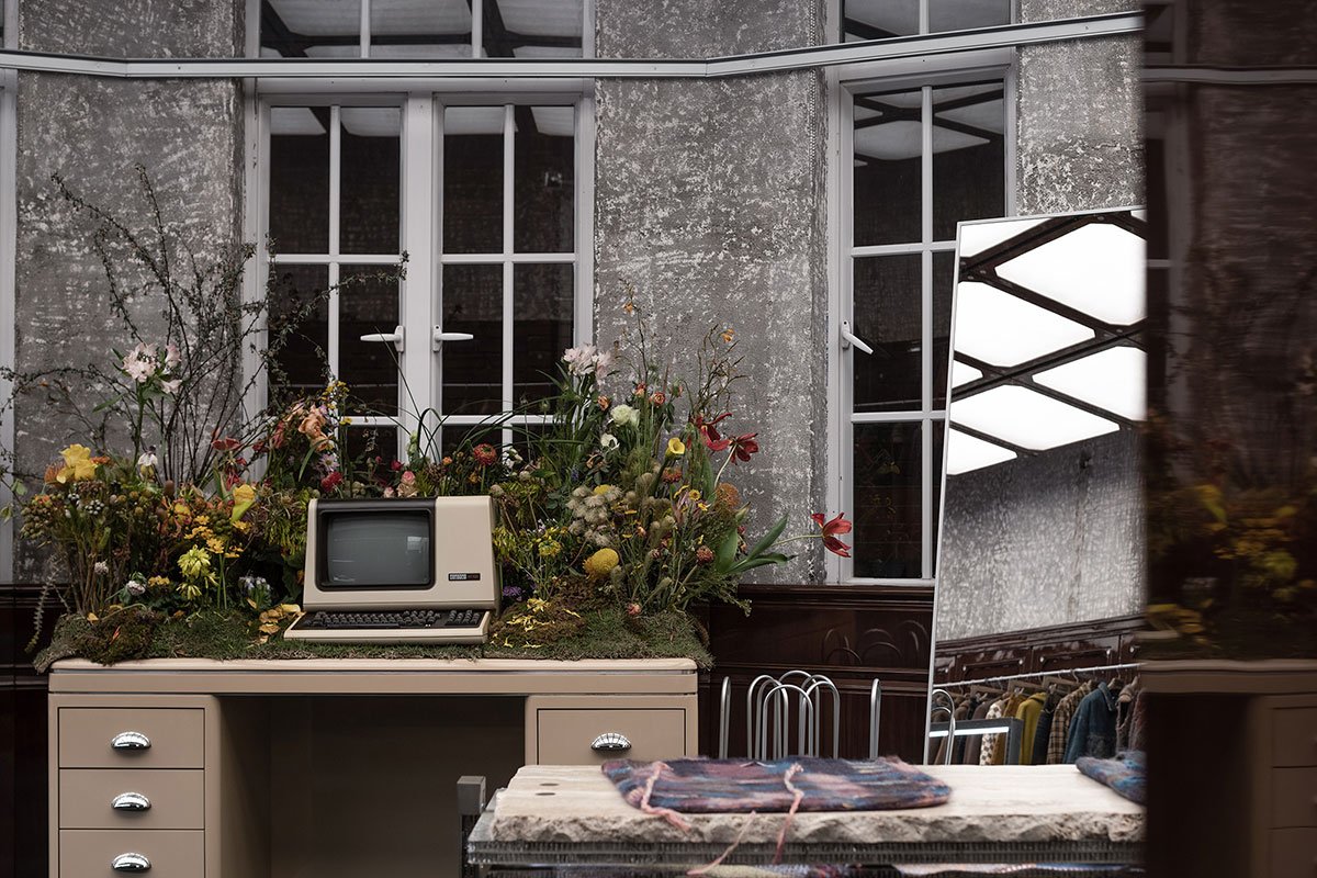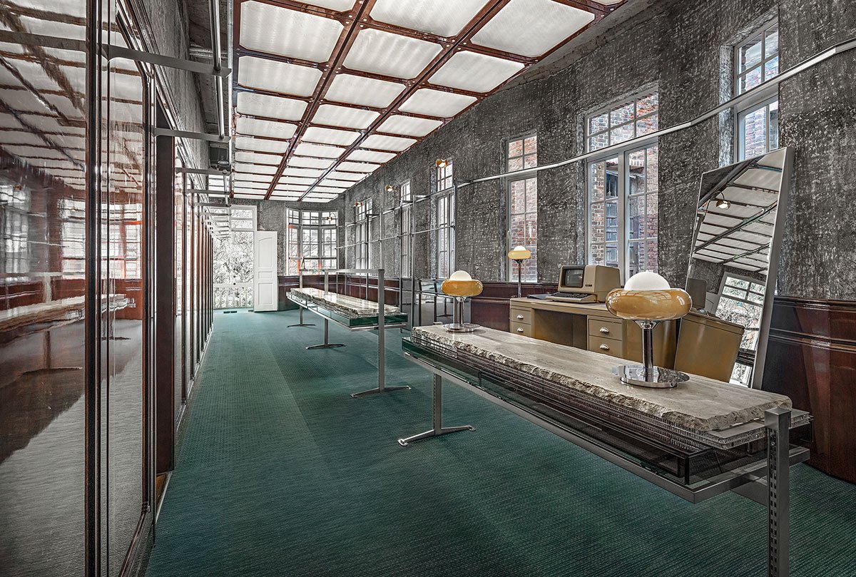 “MP Studio” turns into a clothing workshop in the 1930s here. The linear show stands resemble old-fashioned assembly lines, while their smooth modern surfaces are a constant reminder of the present. Next to the workshop, the reception room is illuminated by the flickering “firelight”, which brings a touch of vitality into a vintage ambience. Ubiquitous contrasts and shocks create an experience beyond reality and bring the storyline to its climax.