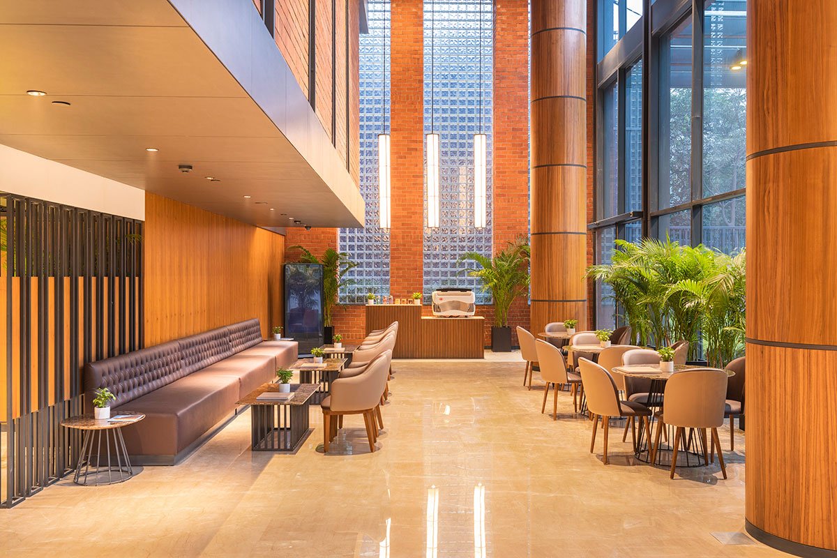 The design scheme extends the expression of exposed brickwork into the interiors, injecting spaces with a natural, ‘handcrafted’ appeal. While brickwork and glass blocks create the retro chic approach to the interiors of the triple-height lobby, neutral tones of stone and veneer imbue the surfaces with understated elegance.