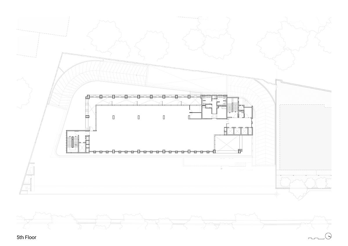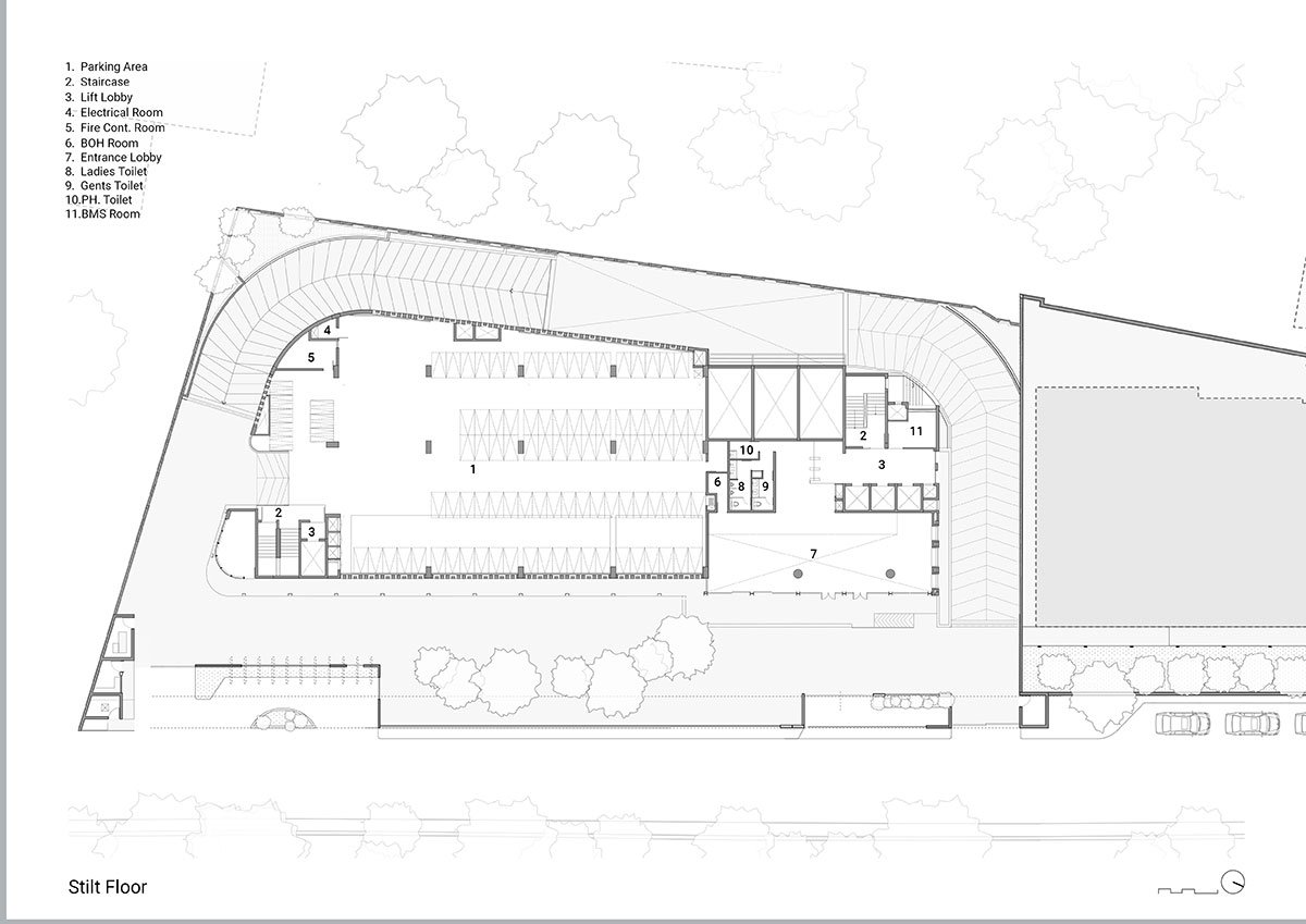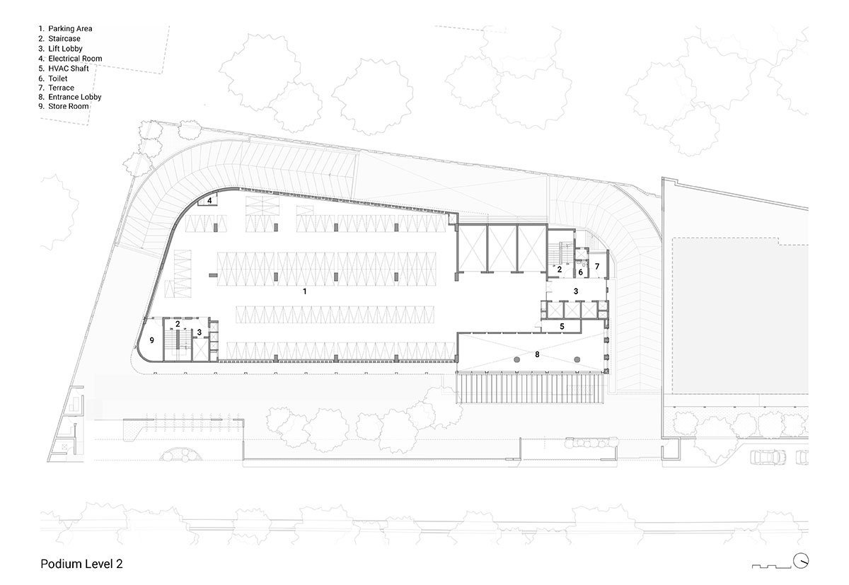 To account for vehicular parking for the eight-storey Block A that was to come up on the site, a parking podium was devised that simultaneously opens up volume for the creation of a spacious triple-height reception lobby at the ground level.