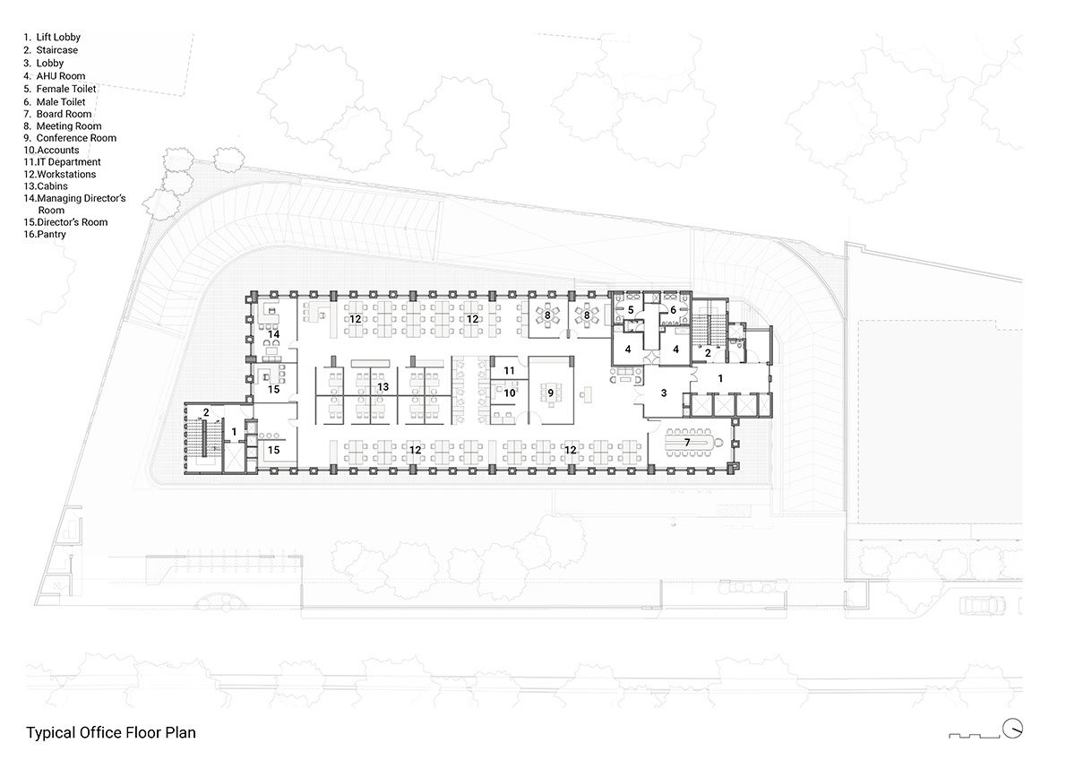 The building envelope is designed using a two-pronged strategy to regulate the ingress of heat. The façade is composed of hollow brick masonry, insulated spandrel panels, and double-glazed glass units, significantly lowering operating costs. The narrow floor plates ensure that over seventy-five per cent of the occupied floor area receives optimal daylight across all building floors. Spill-out areas facilitate fresh air circulation to occupied spaces by at least thirty per cent above the minimum rates required by the American Society of Heating, Refrigerating and Air-Conditioning Engineers (ASHRAE) Standard 62.1-2010. As many as eighty-two high solar reflective index (SRI) tiles will be installed on the roof to minimize the impact on the micro-climate and reduce heat gain and loss through the built volume.