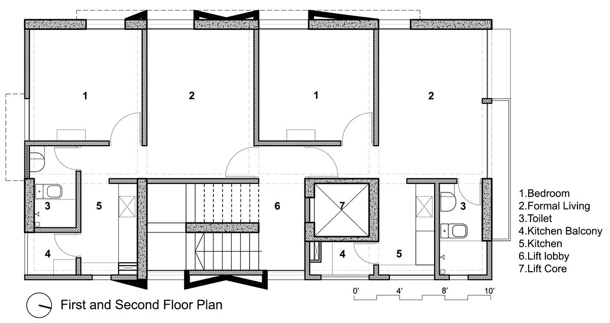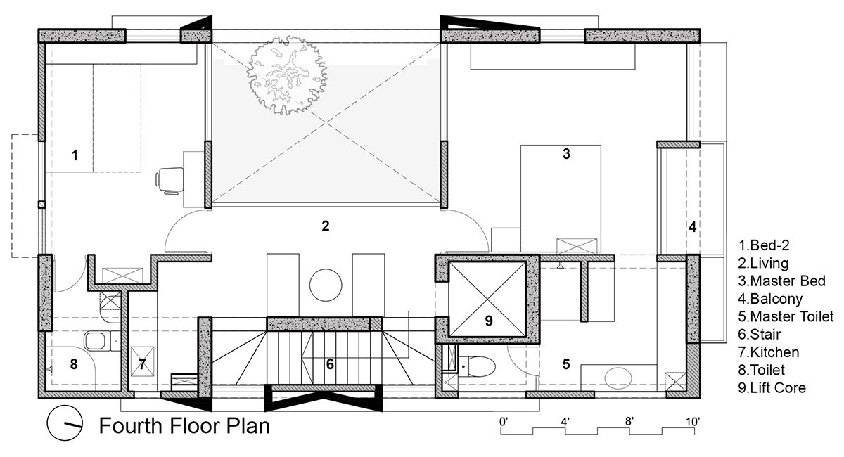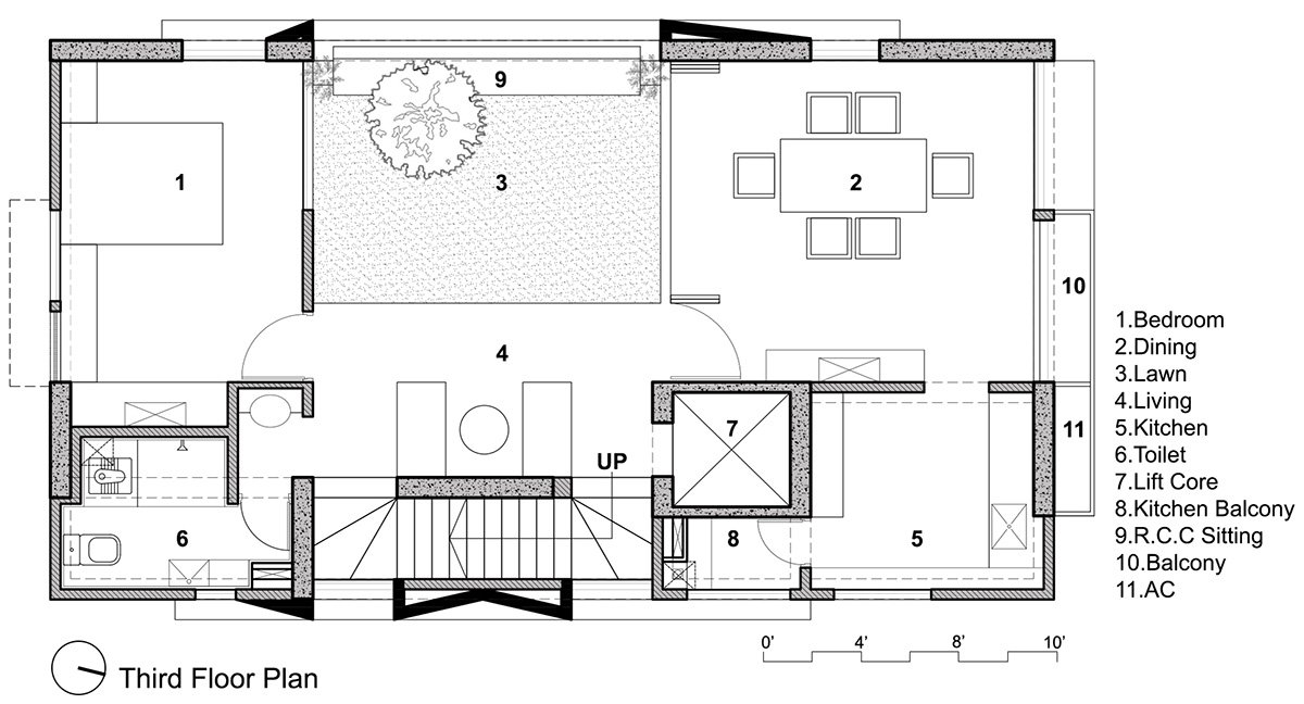 Rather than treating the plot as a limitation, architects Faysal Kabir and Anup Kumar Basak viewed it as an opportunity. Through dialogue and careful planning, they proposed a compact yet efficient layout that balances density, privacy and openness. The building accommodates rental units for financial stability while preserving a courtyard-centered family home above.