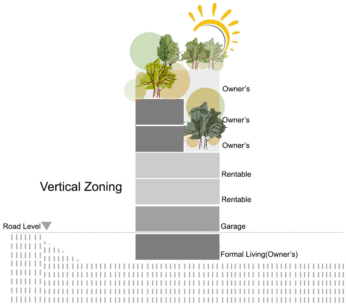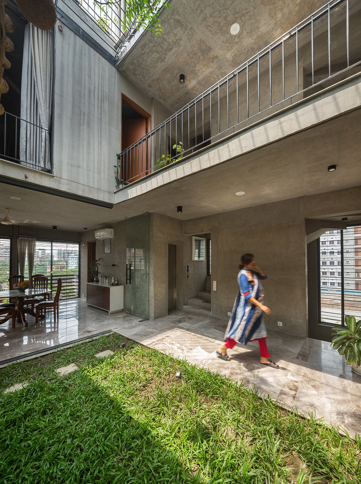 Built on less than two kathas, the project is vertically organized. Service spaces, a caretaker’s unit and parking occupy the lower level. Two floors of compact rental apartments sit above, providing steady income. Rising higher, the building shifts in character: three levels form a family triplex wrapped around an open-to-sky courtyard as the heart of the home.