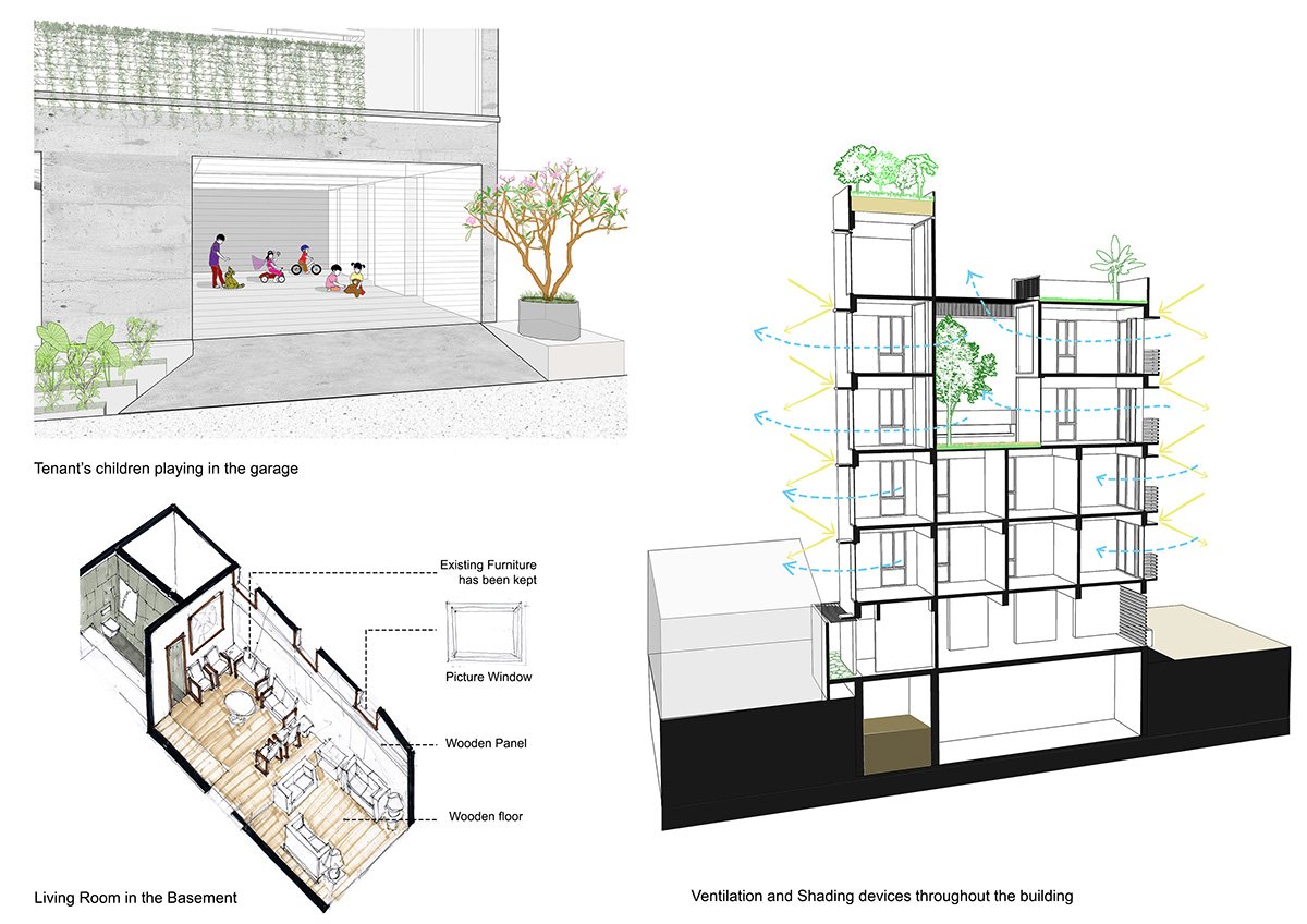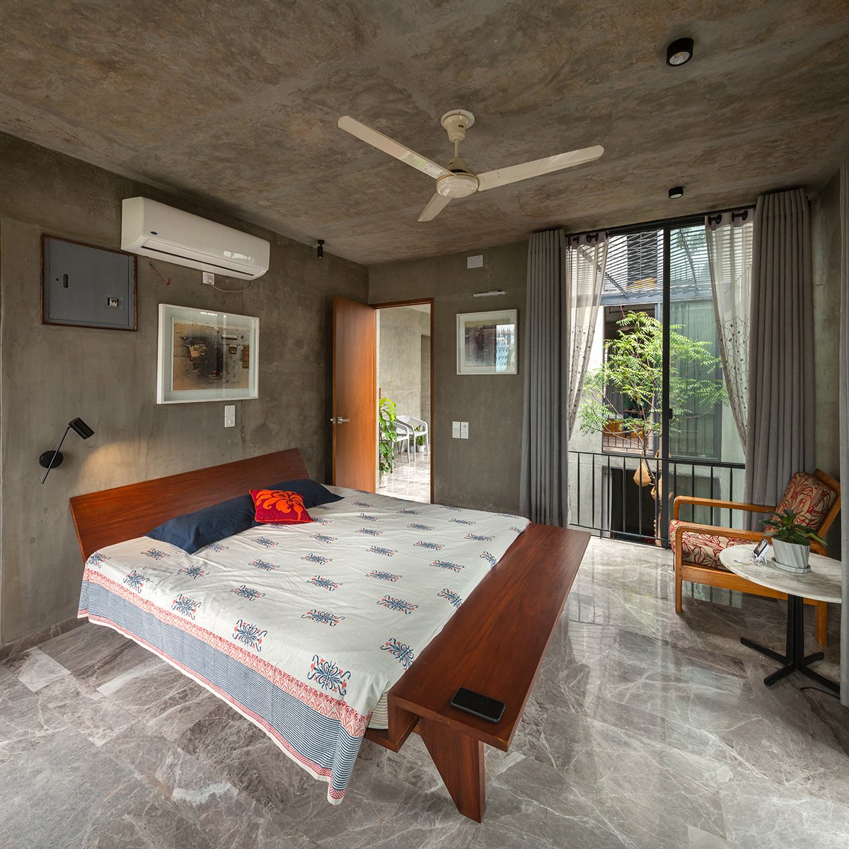 Inside, spaces are deliberately simple yet functional, prioritizing comfort, flexibility and environmental performance over excess. Floor-to-ceiling openings bring in daylight and breeze, while stacked gardens at different heights maintain a constant visual connection to nature. Exposed concrete surfaces lend a calm, monolithic presence. Anticipating future urban change, the ground level is set lower than the road, allowing it to evolve into a basement over time.
