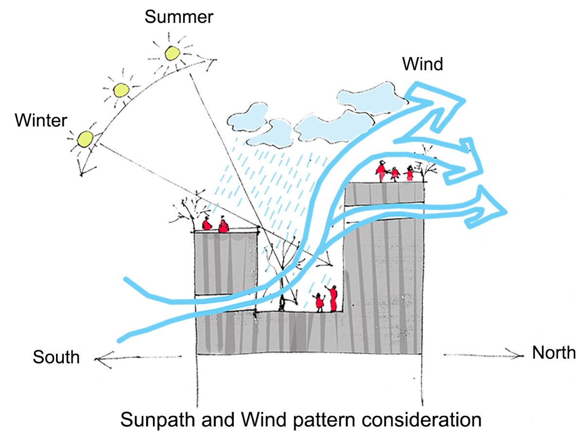 The mass vertically decreases toward the south to maximize sunlight, while the eastern courtyard captures changing light throughout the day. A tall enclosing wall ensures privacy, pierced by a narrow opening that draws wind upward through the void.