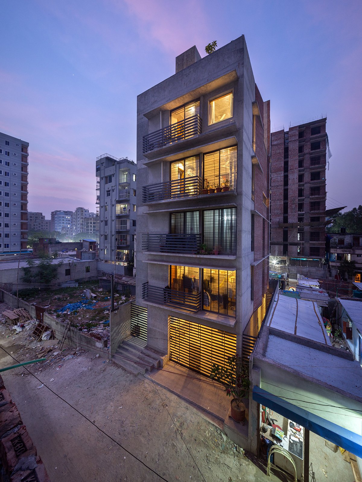 [Text as submitted by architect] Megh Mallar grows out of the everyday realities of Dhaka as shrinking plots, rising land values and homes constantly negotiated between necessity and comfort. As one of the world’s densest megacities, Dhaka’s central wards often exceed 45,000–60,000 people per square kilometer, while continuous rural-to-urban migration has further intensified land scarcity.