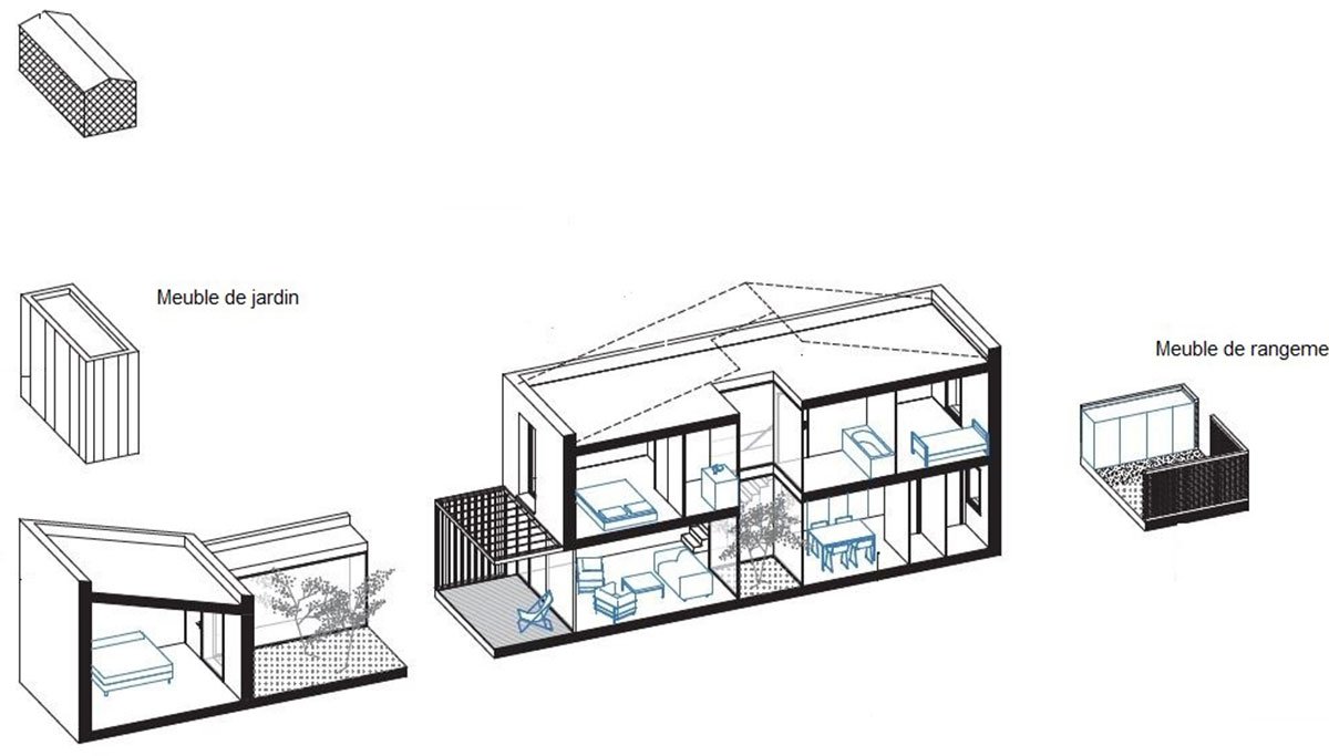 Each dwelling is designed to reflect the needs of its occupants and, above all, to evolve with them. For this project, the designers have created a family of furnishings to personalize the private spaces. Here is a piece of furniture that can be offered as an option when purchasing the house, and which will be positioned at the bottom of the garden. It includes a compost bin, a water collector and a summer kitchen. It offers new uses for residents.