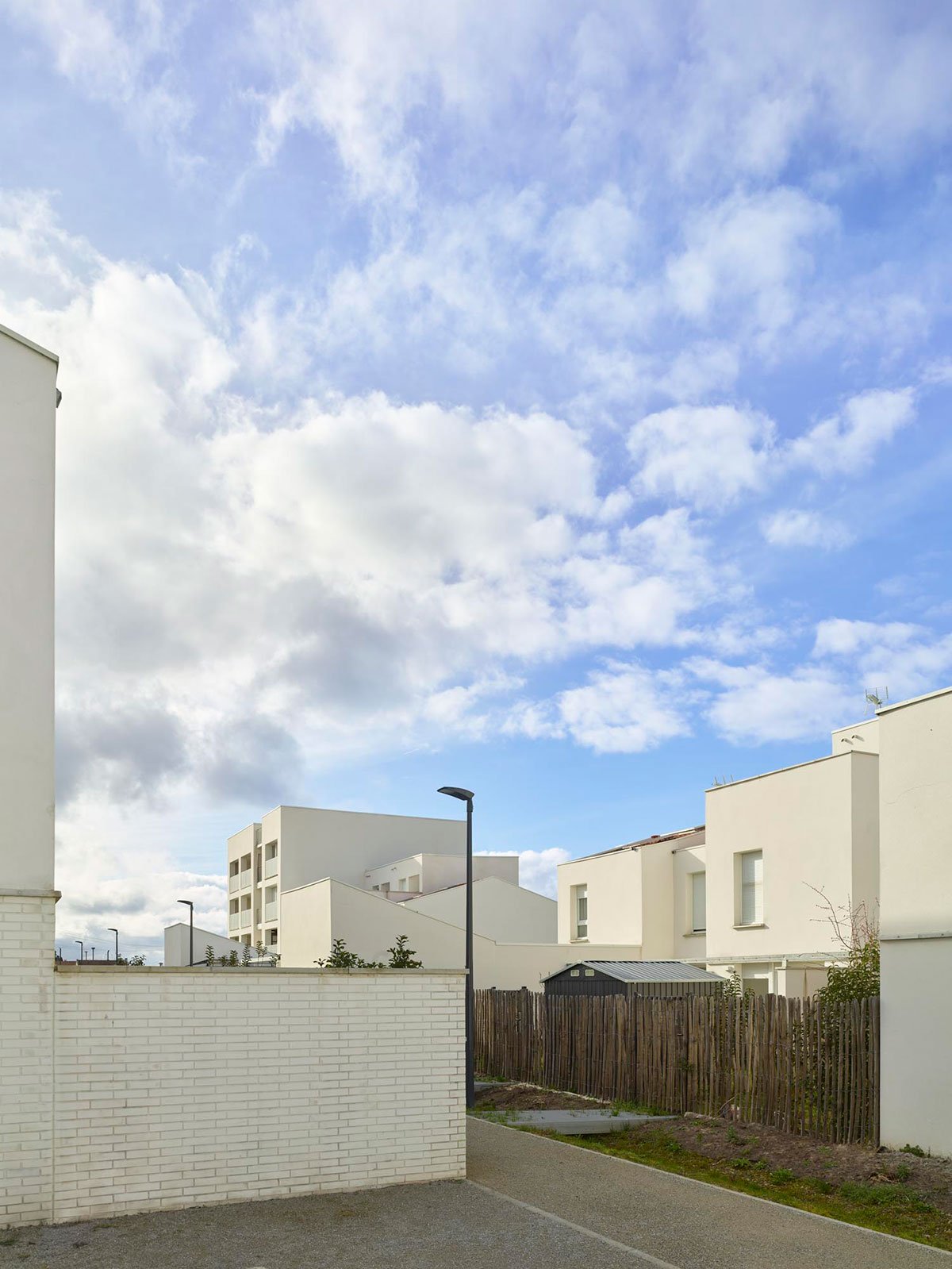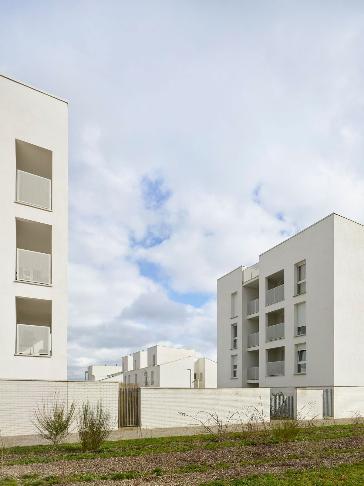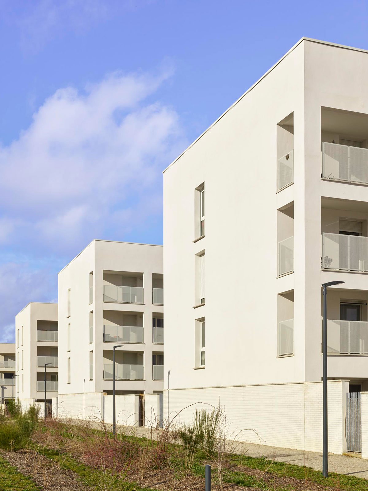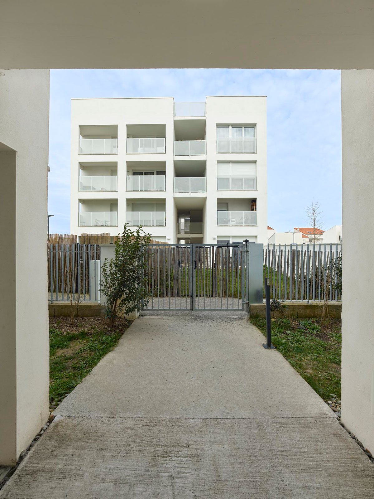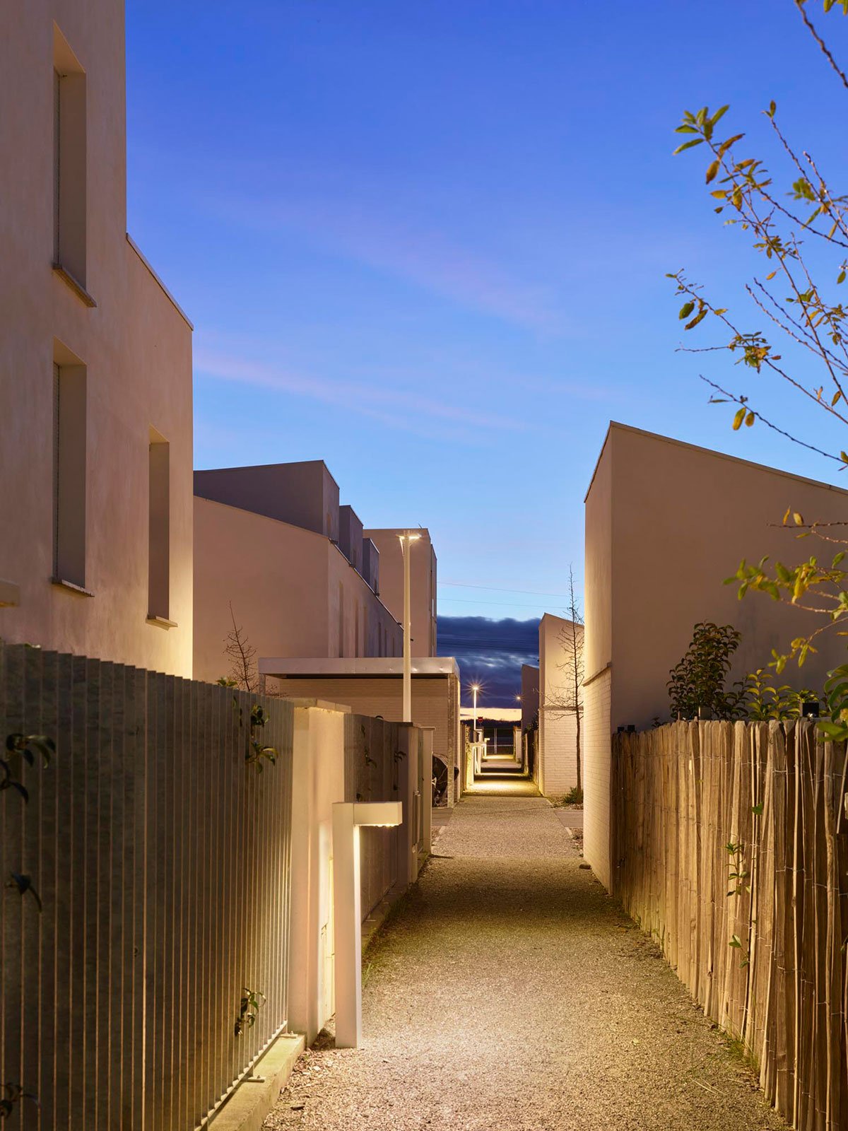 All ground-floor units have private gardens. All first-floor units have a south-facing loggia. Parking spaces are grouped around tree-lined communal courtyards. In line with the guidelines laid down by the urban planners, the buildings follow an east/west direction to create views towards the Garonne. The volumes of the multi-family dwellings, which are larger than those of the townhouses, are located at the corners of the plot. Two shared north/south parking courtyards and an east/west pedestrian walkway form part of the building fabric. Together, the buildings form a strip architecture articulated around open common spaces.
