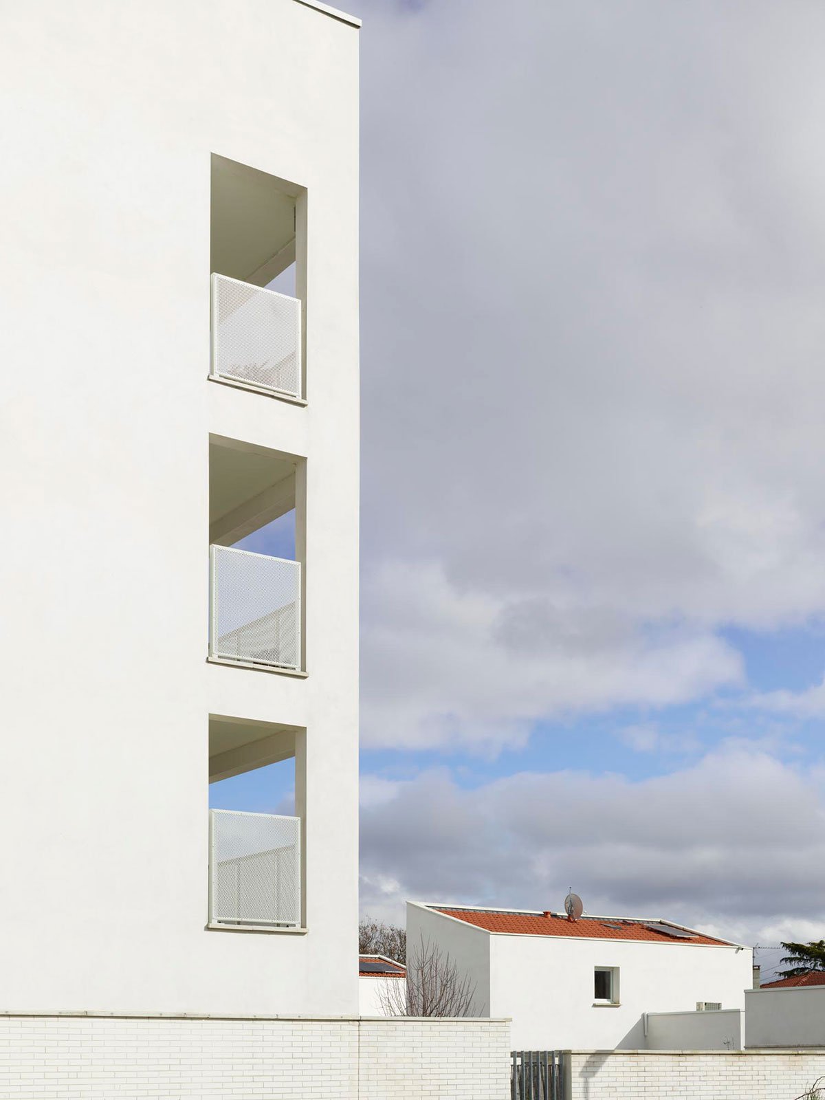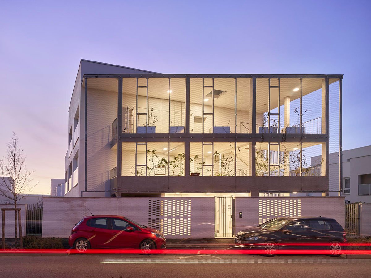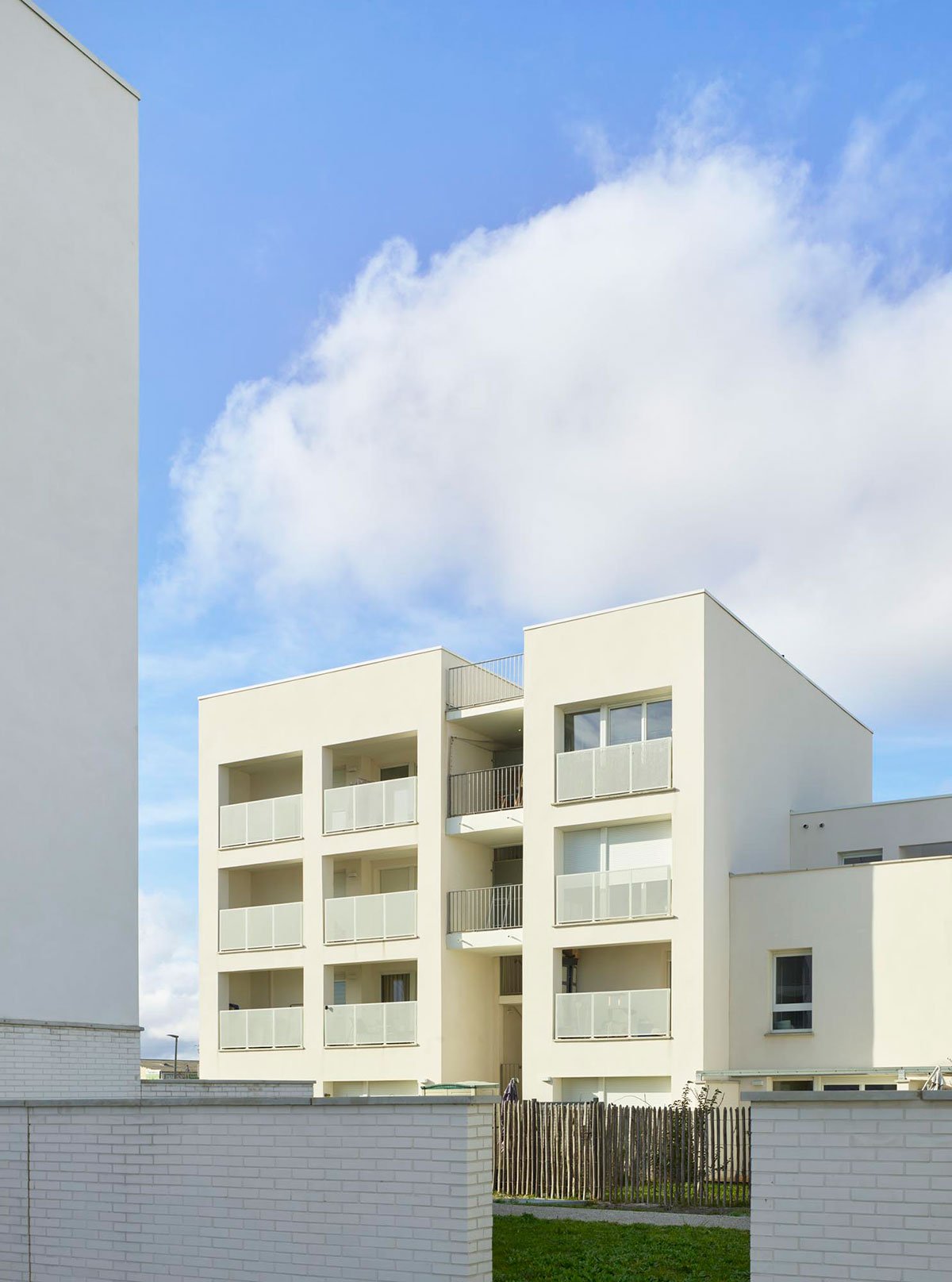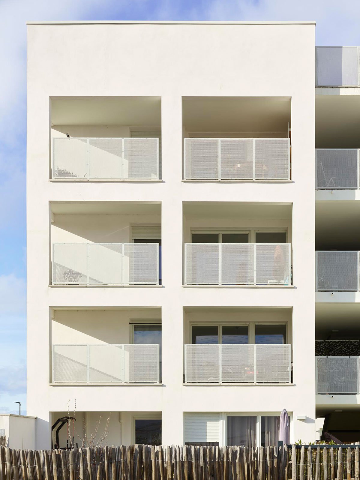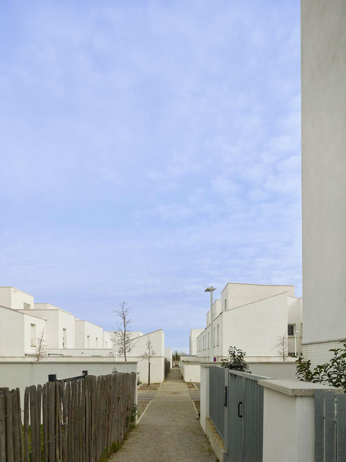 All ground-floor units have private gardens. All first-floor units have a south-facing loggia. Parking spaces are grouped around tree-lined communal courtyards. In line with the guidelines laid down by the urban planners, the buildings follow an east/west direction to create views towards the Garonne. The volumes of the multi-family dwellings, which are larger than those of the townhouses, are located at the corners of the plot. Two shared north/south parking courtyards and an east/west pedestrian walkway form part of the building fabric. Together, the buildings form a strip architecture articulated around open common spaces.
