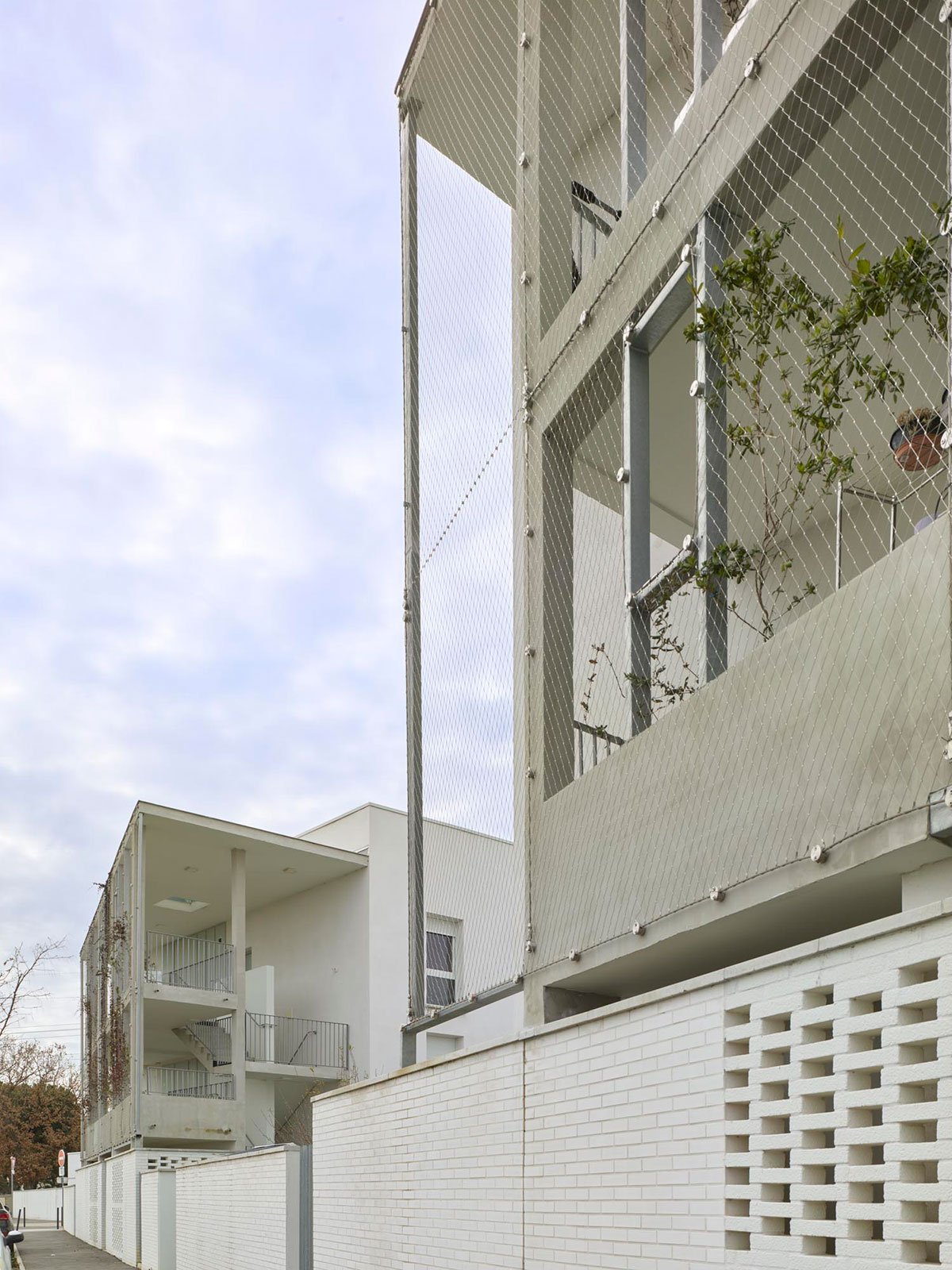 The Toulouse courtyards are the first element in the entrance sequence to the strip homes, with a swept concrete path bordered by a 1.50m-high-galvanized steel storage unit and a small green space.