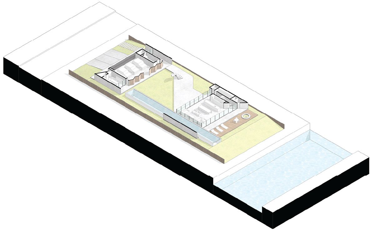 Given the bay interface at the back of the lot, the program of requirements is arranged to maximize contact between the social areas and the water. On the ground floor, a transverse bar housing the social areas is positioned facing the bay. As a counterpoint, a service area is located at the opposite end of the lot. This layout creates an internal courtyard, with views ensured through the large openings in the transverse bars.
