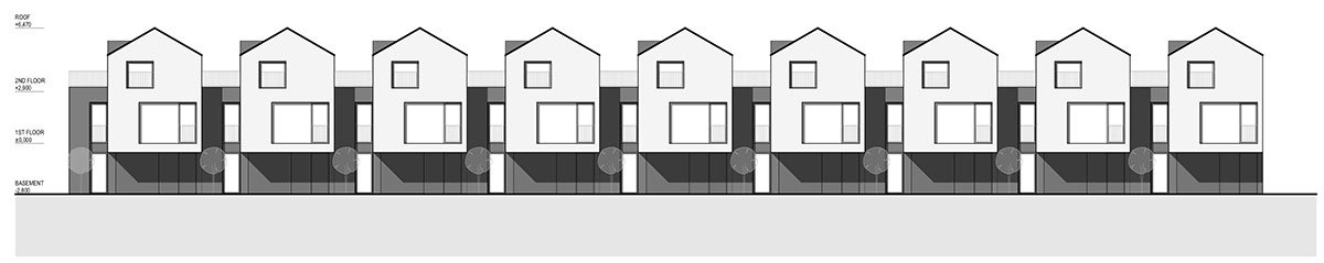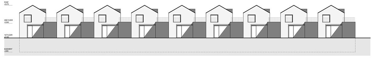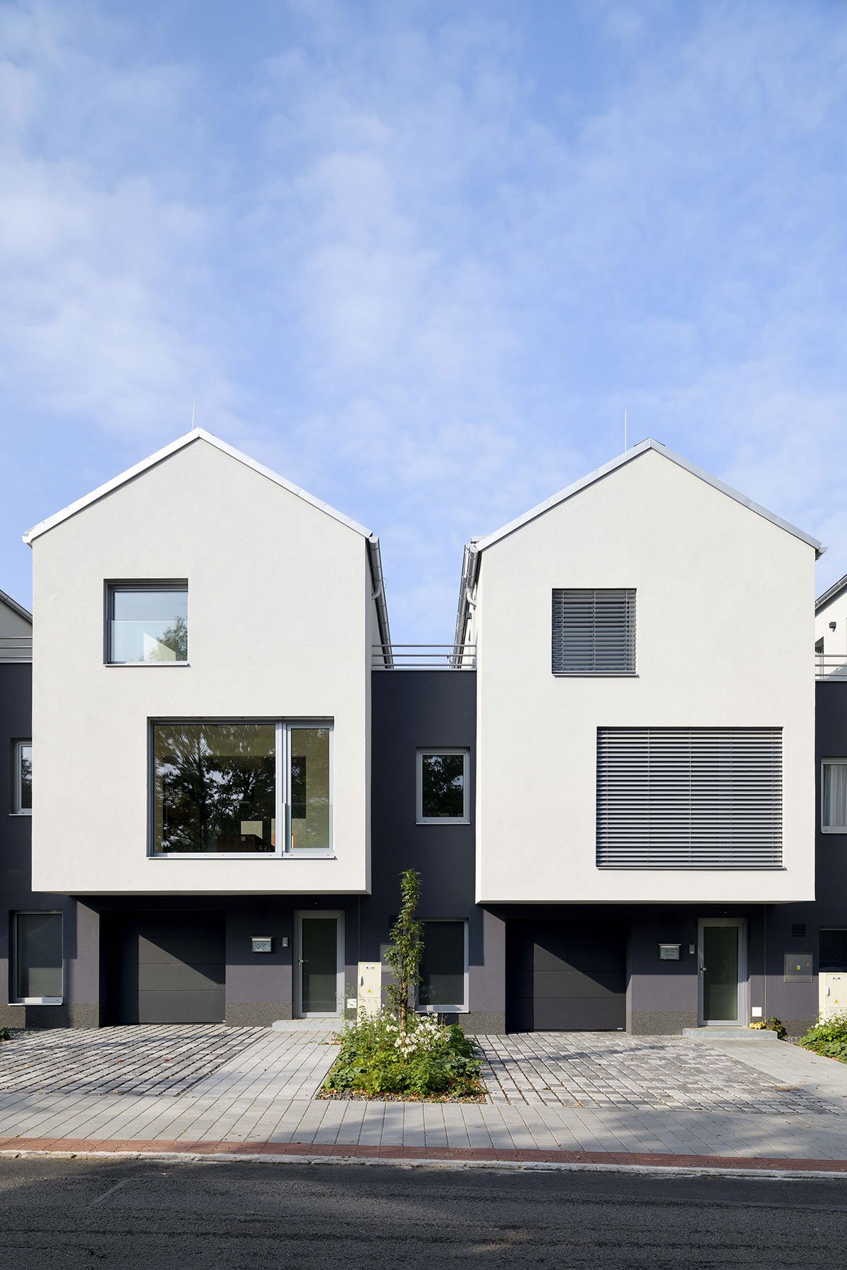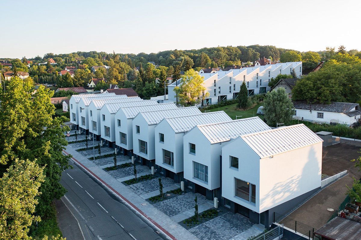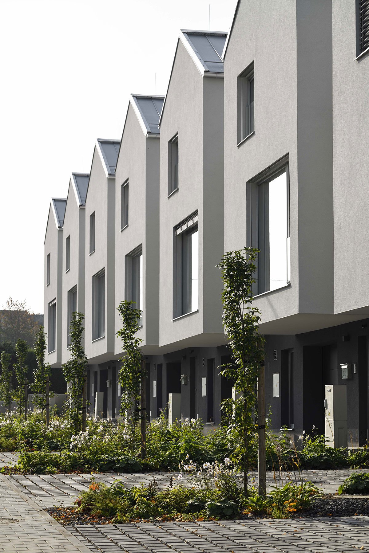 The lines of the terraced houses – cantilevered archetypal volumes of houses with gabled roofs – are distinctly vertically subdivided into individual houses.