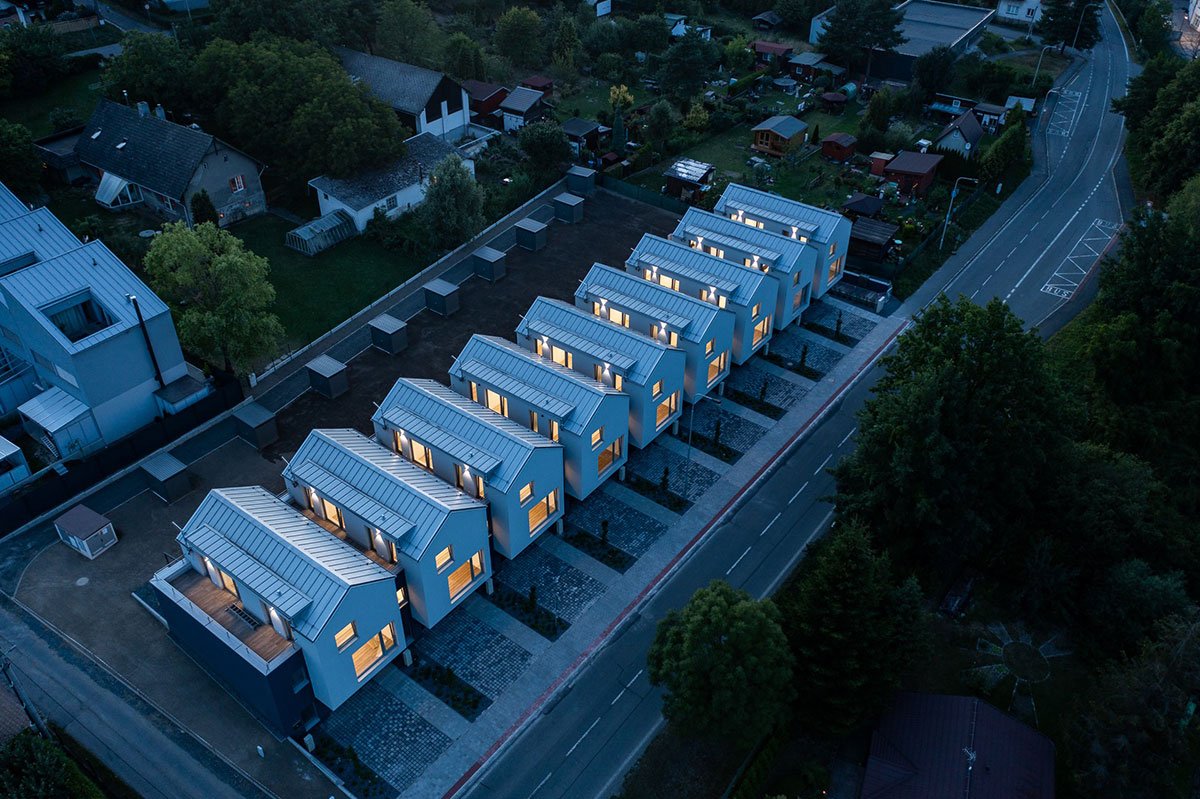 Terraced houses are located among the heterogeneous development consisting of single-family houses, a gardening colony, linear apartment houses and a supermarket near the former Michal mine. There was nothing to build on, so we created a fixed, memorable line – a sign, just as the structures of the workers’ colonies used to be.