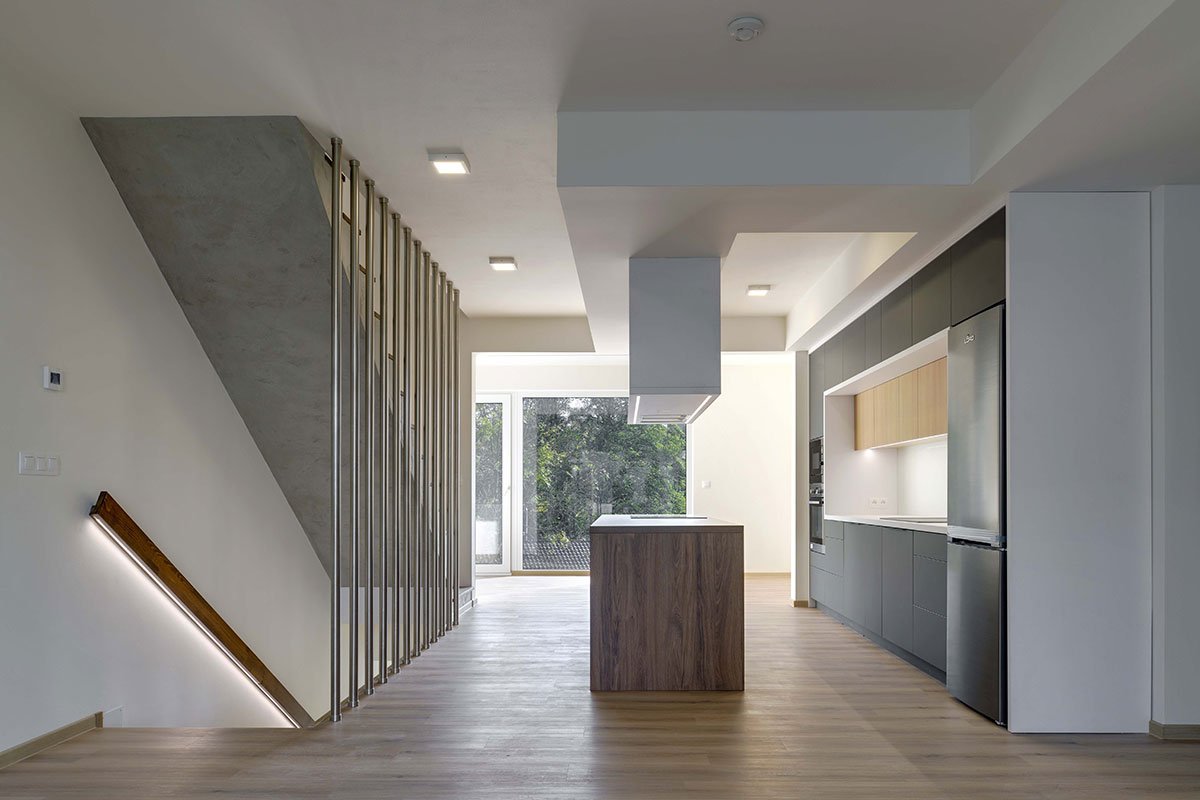 Excerpt: Michalka Line – Phase 2, a housing designed by Atelier 38 takes advantage of the sloping terrain and creates the basement, with an entrance and a garage, which is embedded from the eastern side of the street to the terrain. The first floor with the main living space opens westwards through a covered terrace to the garden and on the other side through large glazing to the eastern sun. In the attic are the bedrooms with a roof terrace.