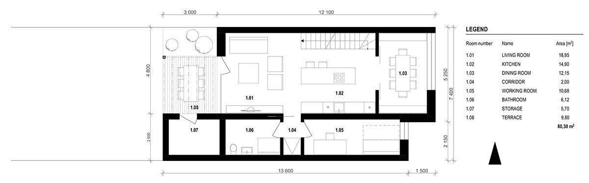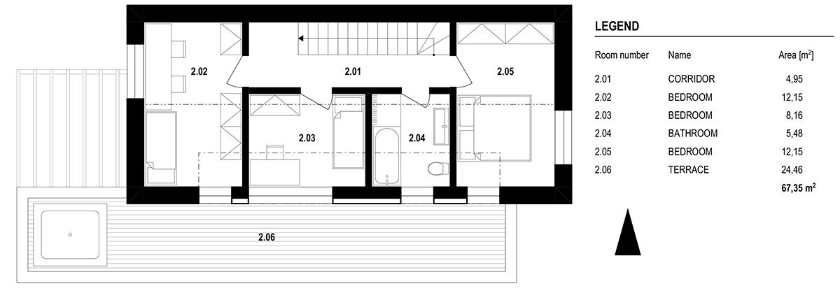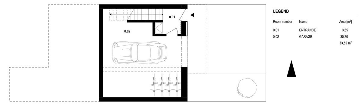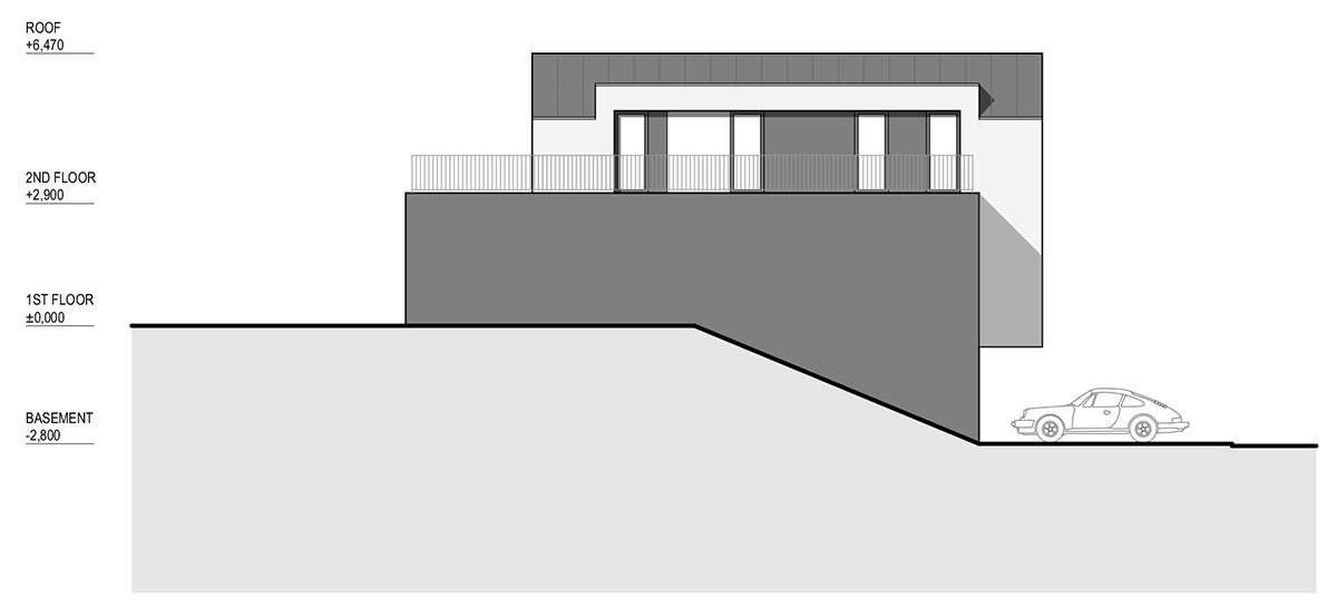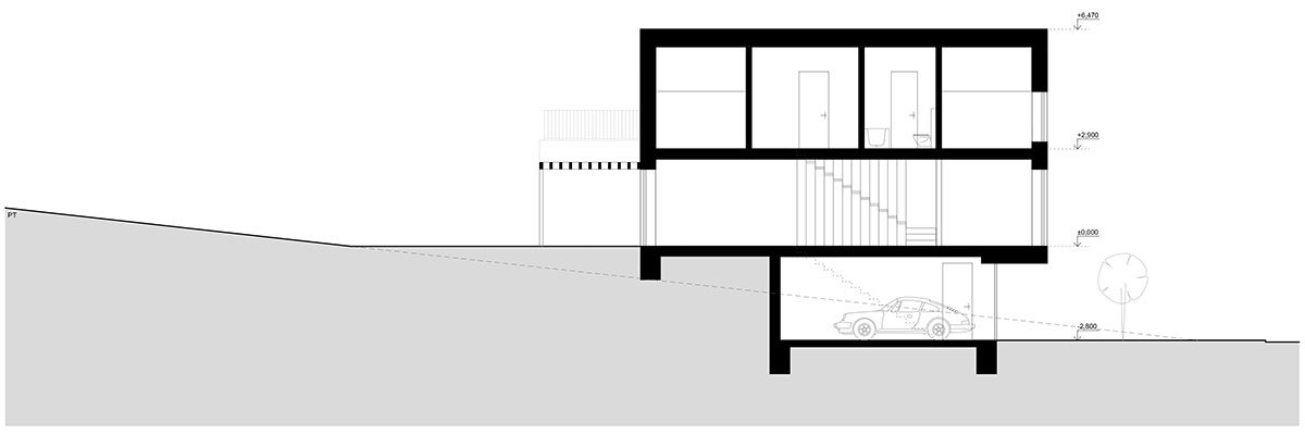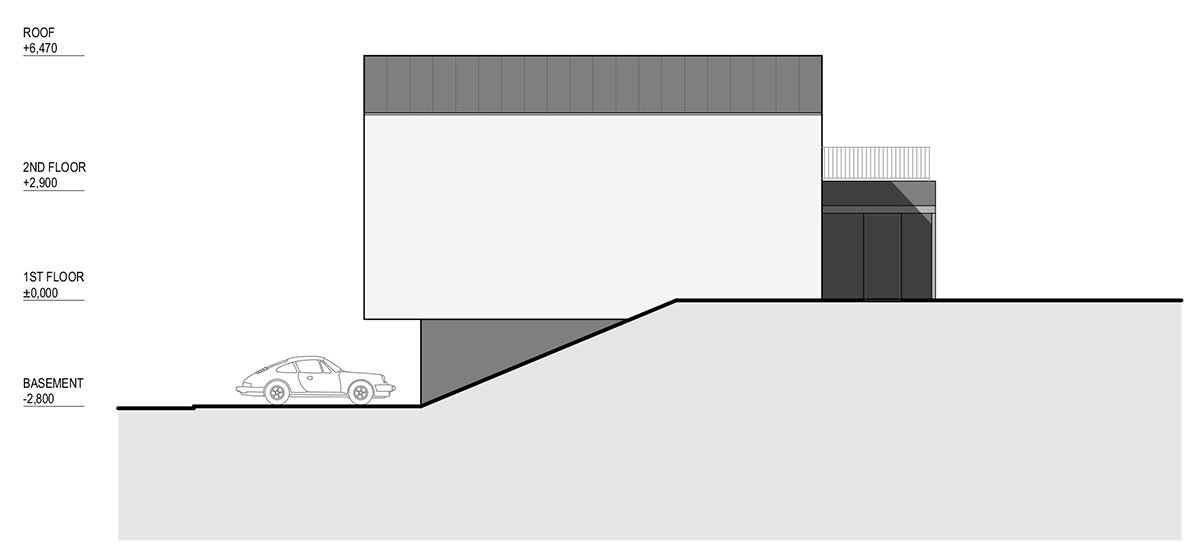 The development takes advantage of the sloping terrain – the basement, with an entrance and a garage, is embedded from the eastern side of the street to the terrain. The first floor with the main living space opens westwards through a covered terrace to the garden and on the other side through large glazing to the eastern sun. In the attic are the bedrooms with a roof terrace.