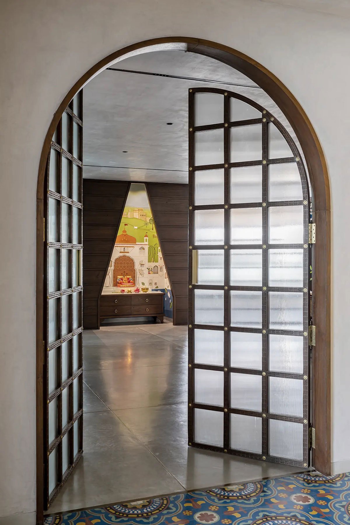 Transcending into the living room, through the arcade, the architect sought to harness the vernacular narrative further by integrating elements that are reflective of the craft, throughout the house. To highlight the craftsmanship and remove the extraneous layers, the space is thoughtfully designed with optimum and flexible furnishings, set in contrast against the muted gray flooring along with raw and natural aesthetics of walls.