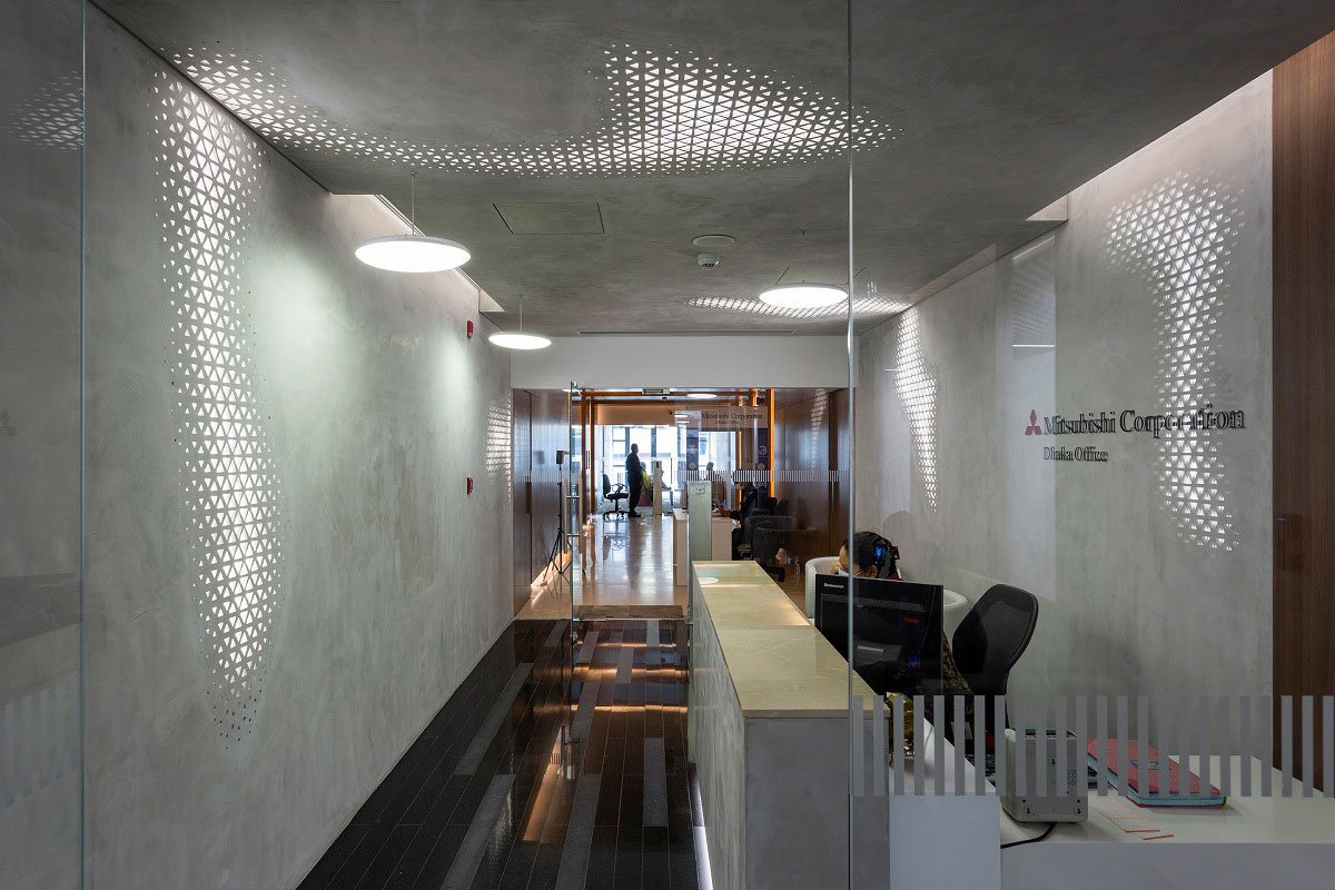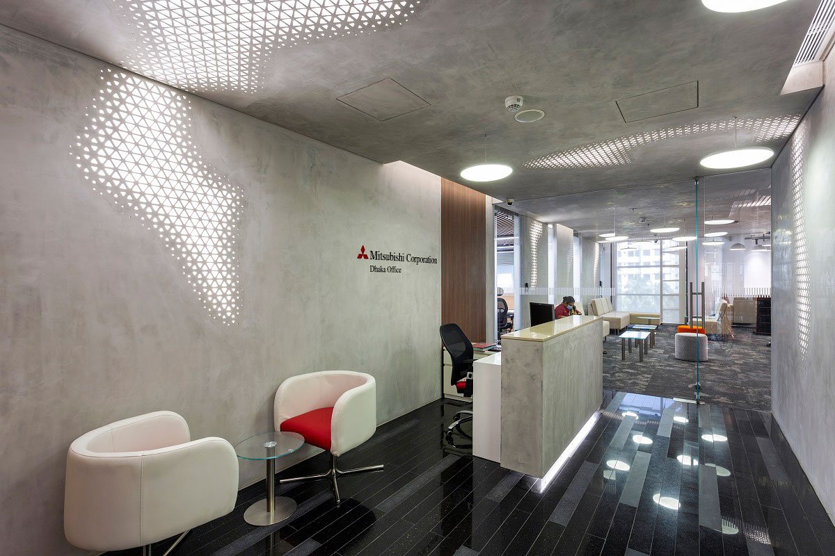 [Text as submitted by architect] Mitsubishi Corporation (MC) is a global integrated business enterprise that develops and operates businesses together with its offices and subsidiaries in approximately 90 countries and regions worldwide, as well as a global network of around 1,700 group companies. Being one of the largest multinational company Mitsubishi Corporation is at the forefront to ensure a highly motivated and enriched office environment. In continuation of their huge legacy, they opted for rebranding their office culture with their Bangladesh Head office. The project enhances their working philosophy of openness and transparency. Therefore, an open layout plan is devised so that a group-working environment is stimulated.