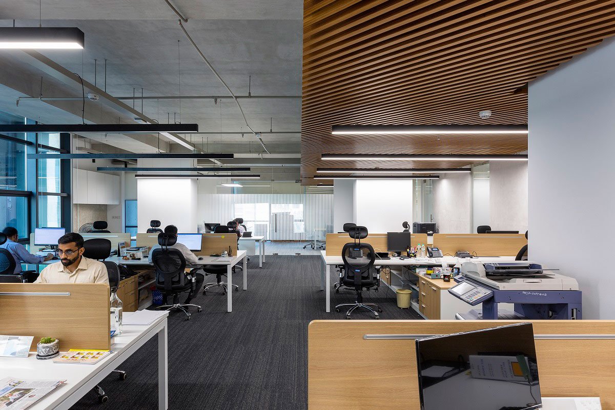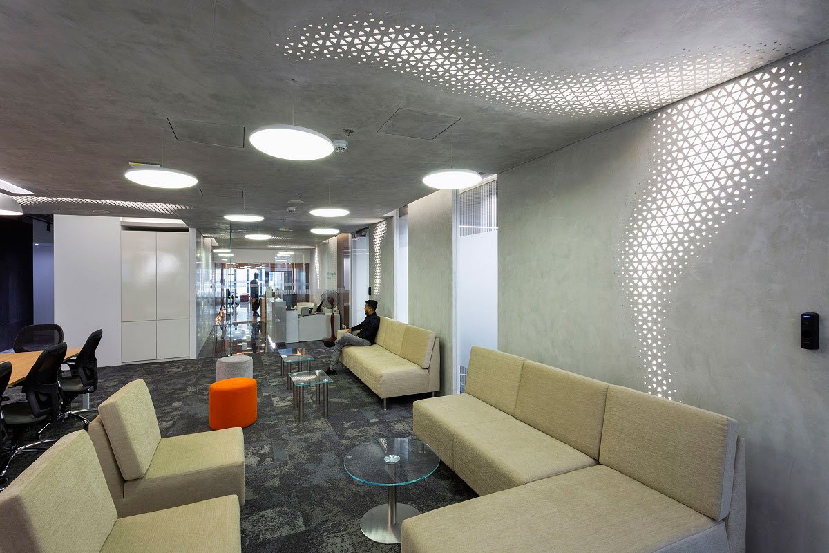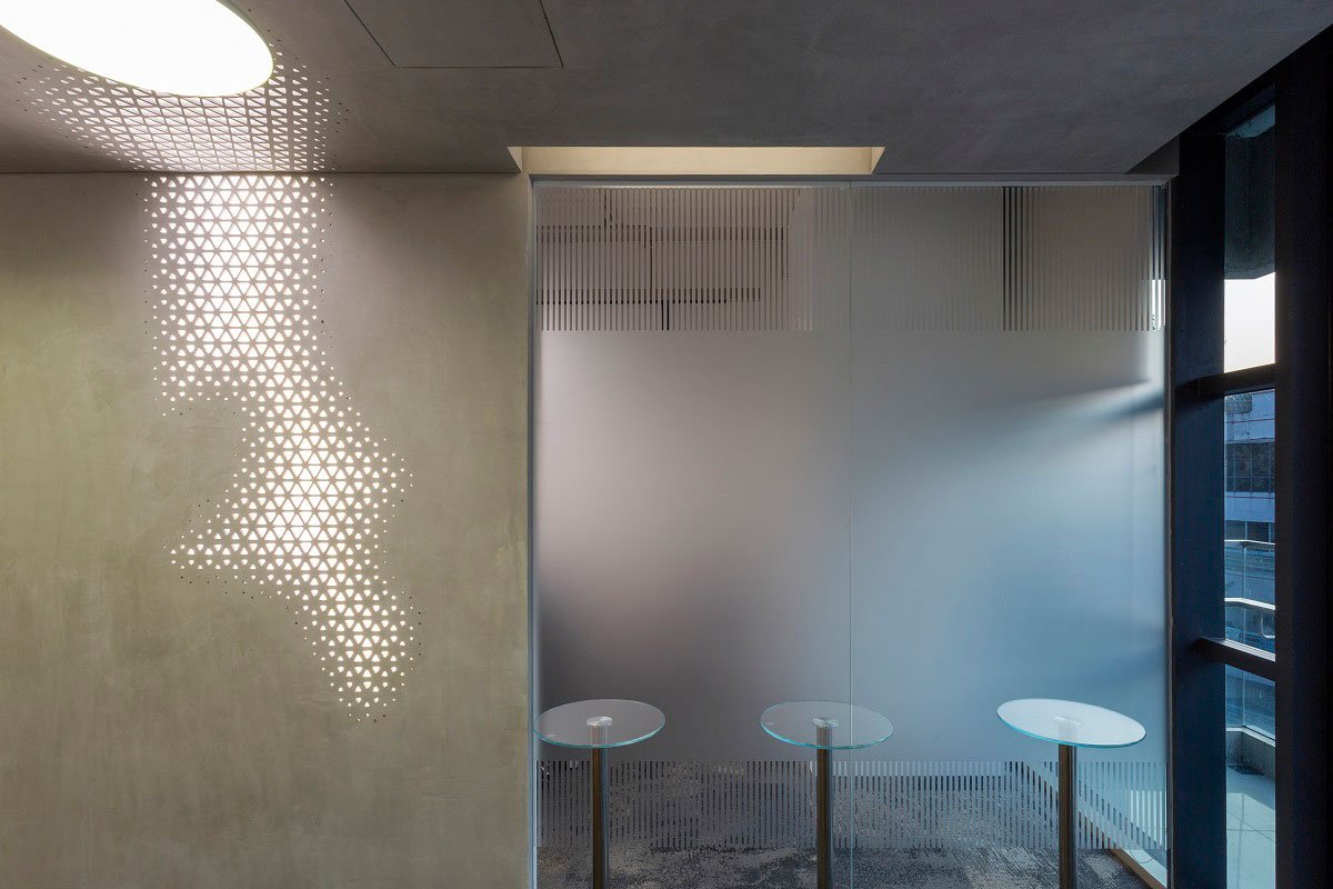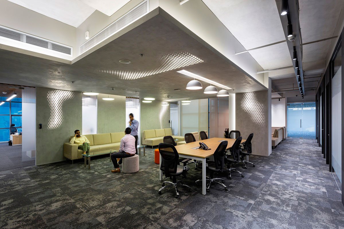 The central Spine –Tunnel emphasizes the idea of minimalistic aura with crafted wall and ceiling being as one devise having a lighting screen modulated from the company logo gives a unique character to the space inside. In order to maximize the use of natural light and height the whole office is having only a few area with soffit whereas the rest of the ceiling are kept bear with concrete finishes, which also complements the overall scheme. It also provides the maximum flexibility for the working spaces.