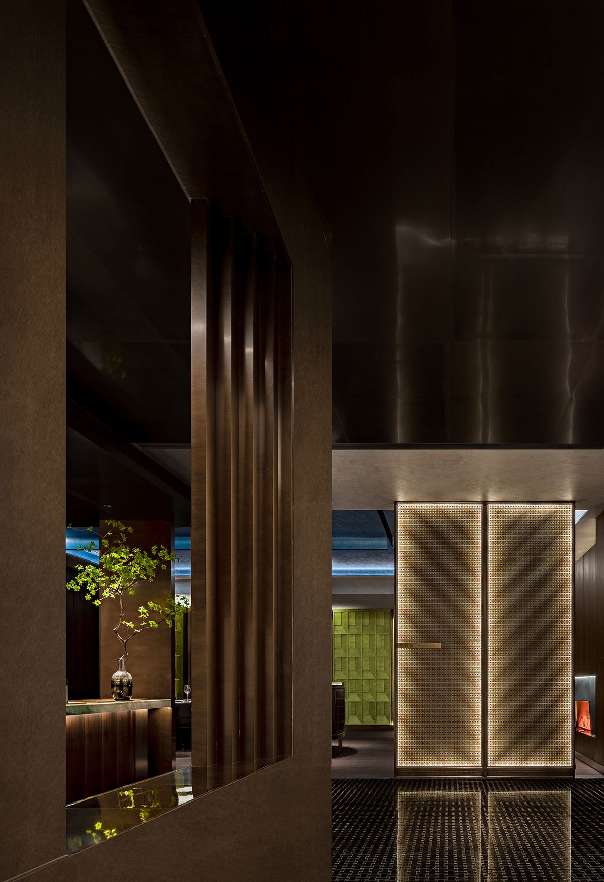 Therefore, even under the large area of dull black texture, the designer can convey the harmonious relationship between humans and nature under the ancient charm of the East through the different forms of plant scenery. The private room is equipped with a tea-tasting area. When everyone has dined and wined to satiety, they can taste tea and leisurely chat, enjoying the pleasure of elegance.