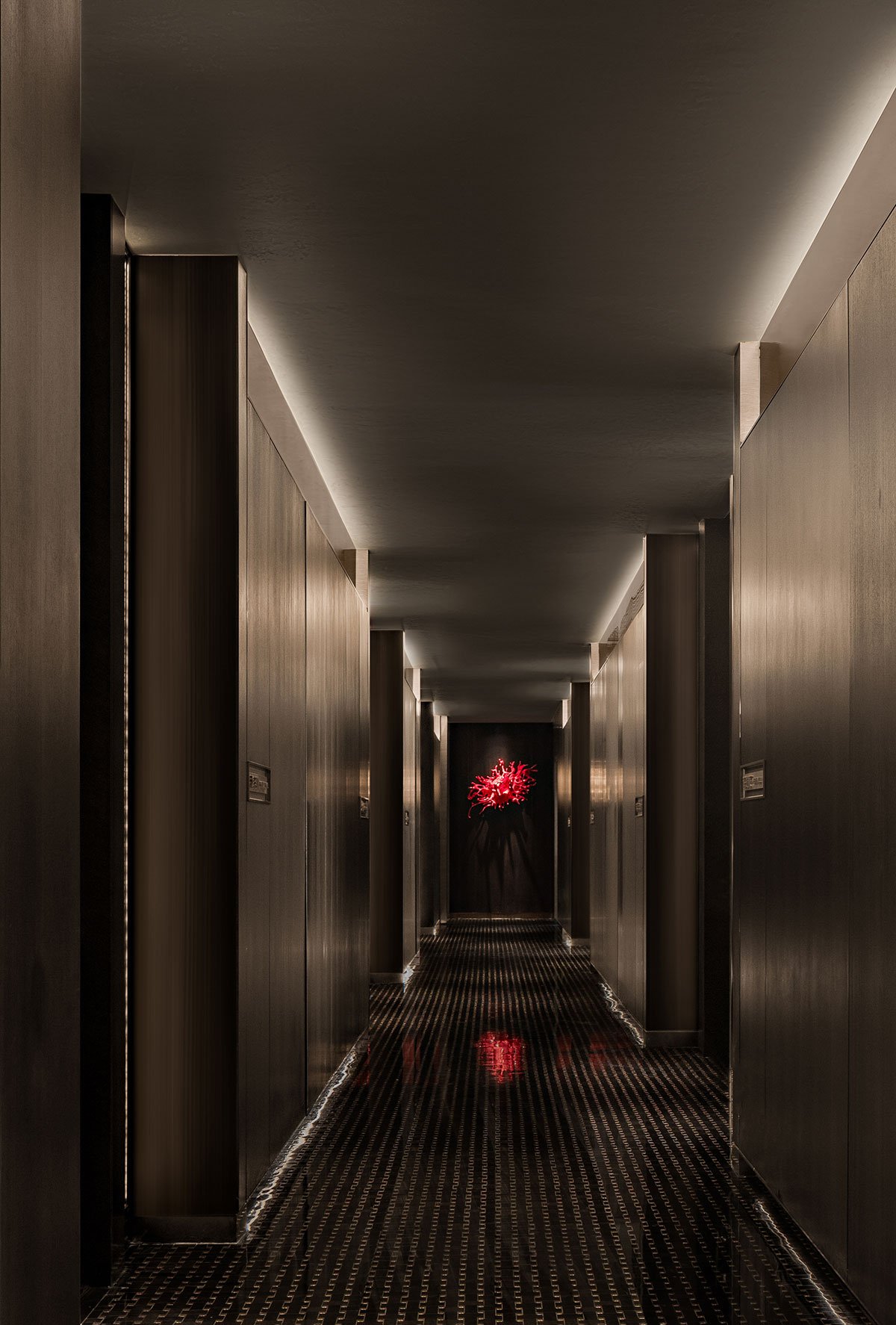 There are concave and angular dull black iron walls to enrich the space level, and there are also wall decorations that combine carving and lighting, such as the ancient dragon totem and the pale and powerful ink and reckless wind, which manifest the inner unity of traditional Chinese humanity and nature.