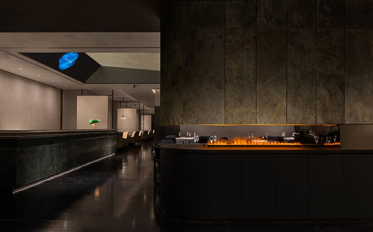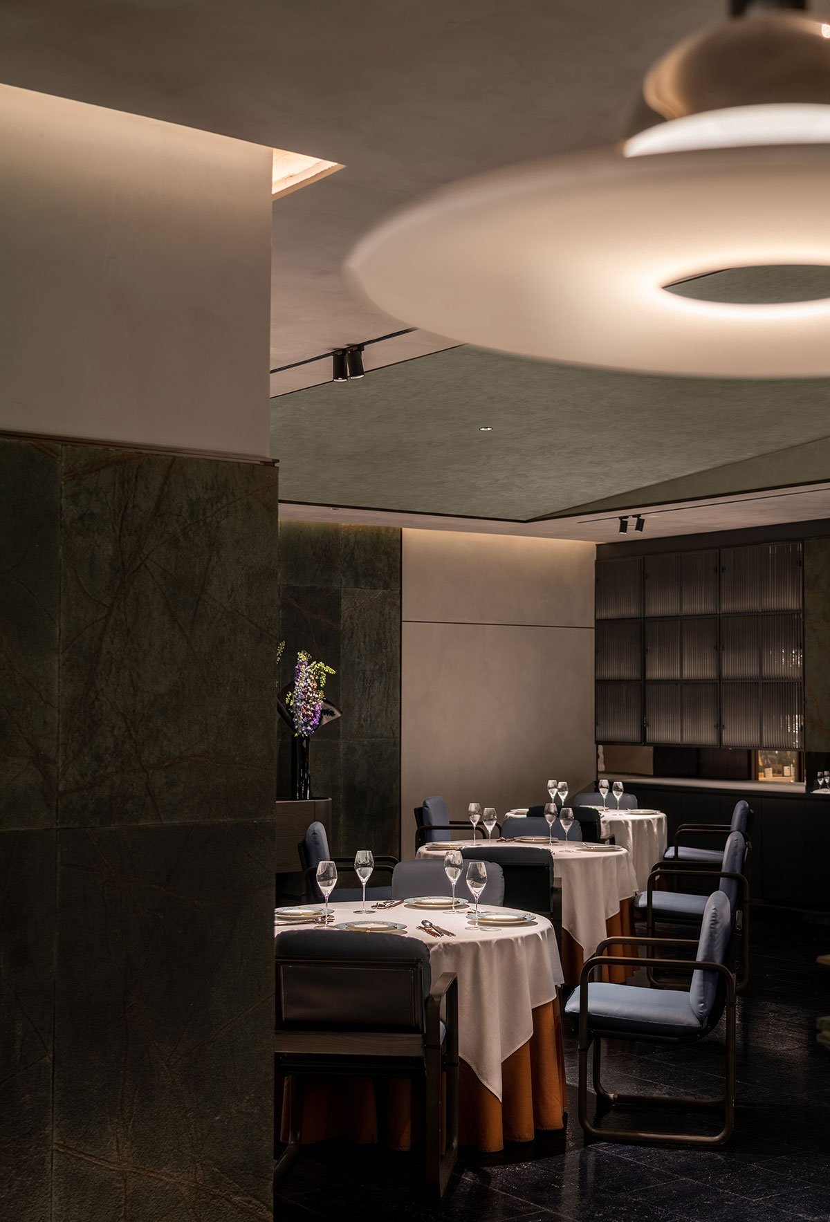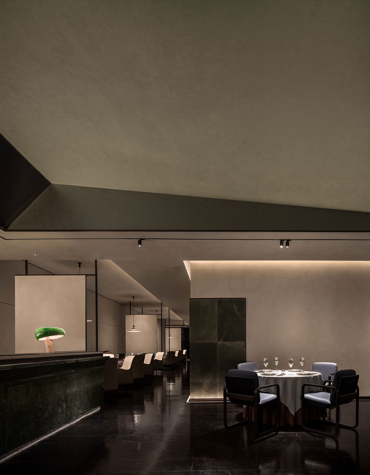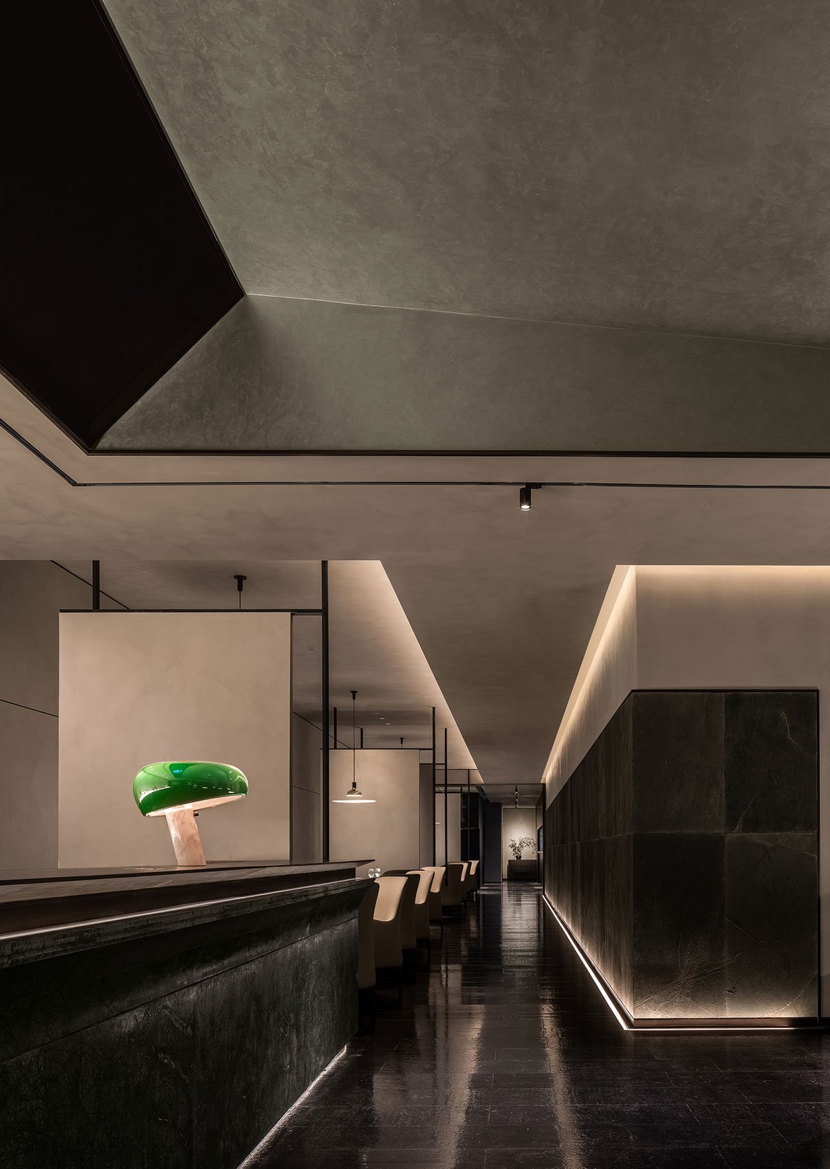 The deep green color extends from the entrance into the interior of the restaurant. The textured marble in shades of dark green, combined with warm lighting, creates an atmosphere where tranquil notes whisper in the air, allowing the mind to escape from the hustle and bustle. The lighting at the bar shines like a jadeite, perfectly complementing the subtle ambiance of light luxury.