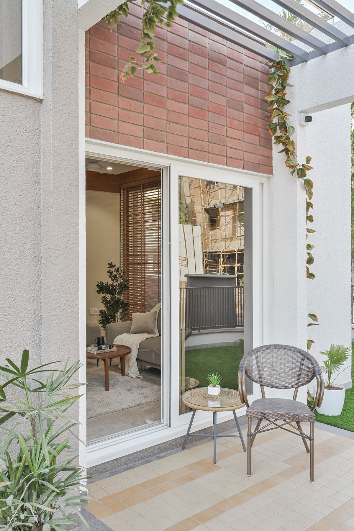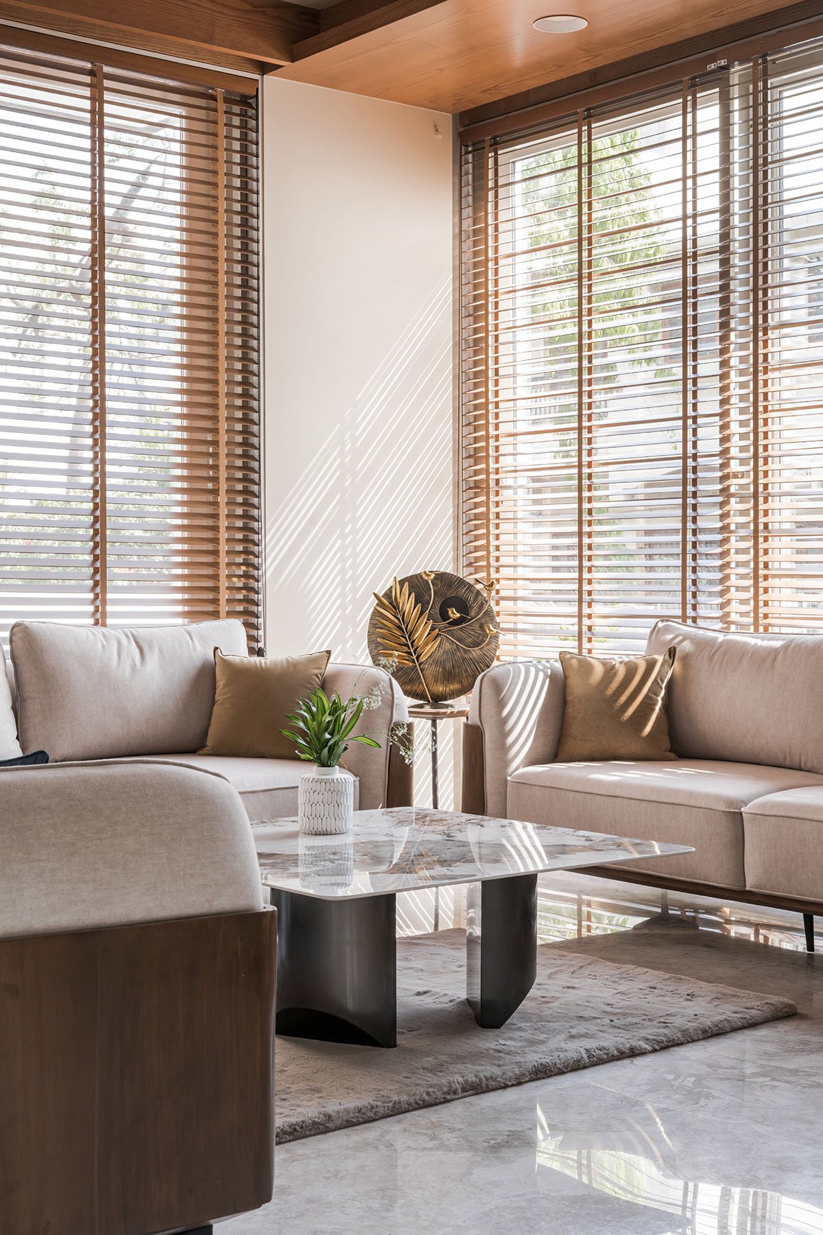 A rich combination of stone veneer and wooden fluted panels has been used to enhance the subtle tones of the sofa and centre table. Wooden blinds maintain the privacy of the space & gives a beautiful play of light throughout the day time.