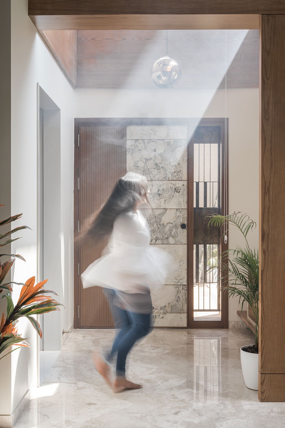 Entry Foyer: To highlight the entry, the design features a double height entry foyer, which gives it an iconic identity to stand out from the surrounding houses & at the same time MS screens creates cosiness in the entry. Here, one can feel the volumetric difference of double height to single height while entering into the home.