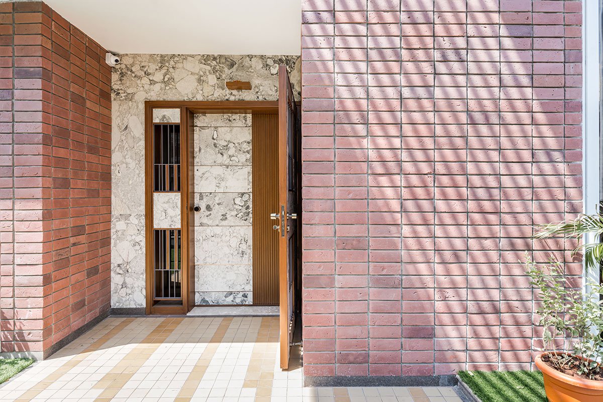 Double Height Lounge: Arriving on the first floor, to give “wow factor” the architects have played in volumetric differences. They highlighted a double height lounge space with light beige bricks and a metal wall mural. Here one can easily connect with ground floor vestibule & second floor activities at a moment. This place opens up into a large elevated garden in the front.