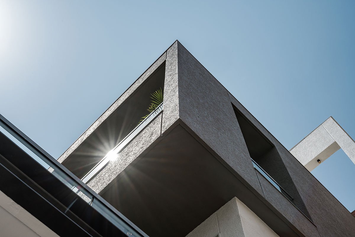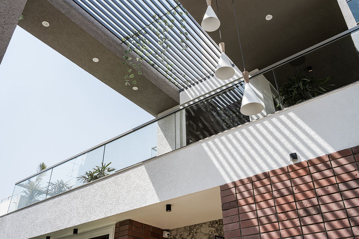 Having an east facing plot, a mass of various cuboid volumes are staggered at various levels making it an interesting self-shading structure. In Ahmedabad, summer goes up to 45 degrees to 47 degrees. In these extreme climatic conditions, open spaces become useless, if they are not shaded properly. Here, this shelf shading structure benefits the residents to use the balcony spaces even in the daytime.