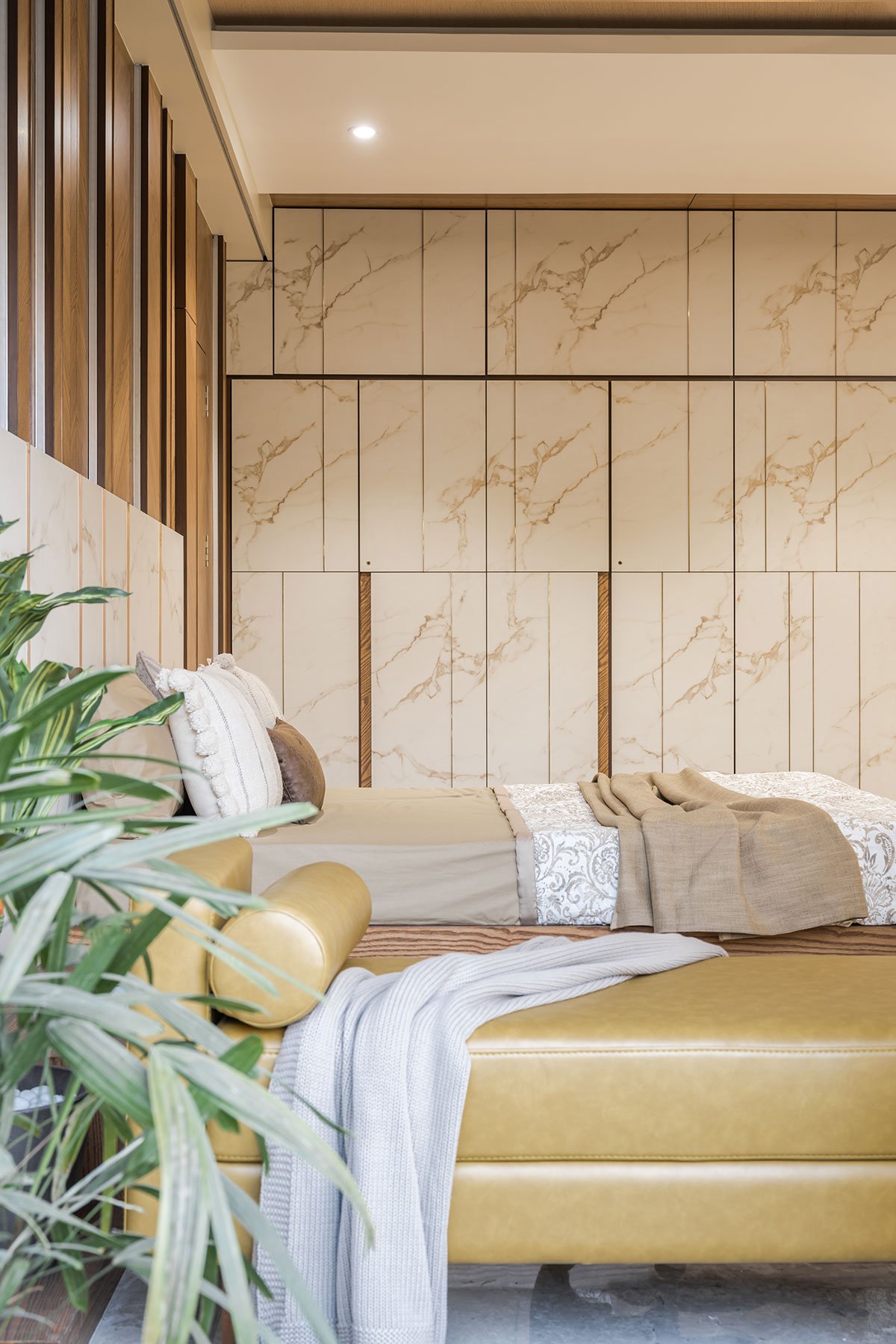 Master Bedroom: The master bedroom combines veneer with marble printed laminate to experience a high level of richness. The architects have camouflage bedroom & bathroom doors with design to get queries room space & clean corners. The extended elevated garden makes this bedroom more spacious.